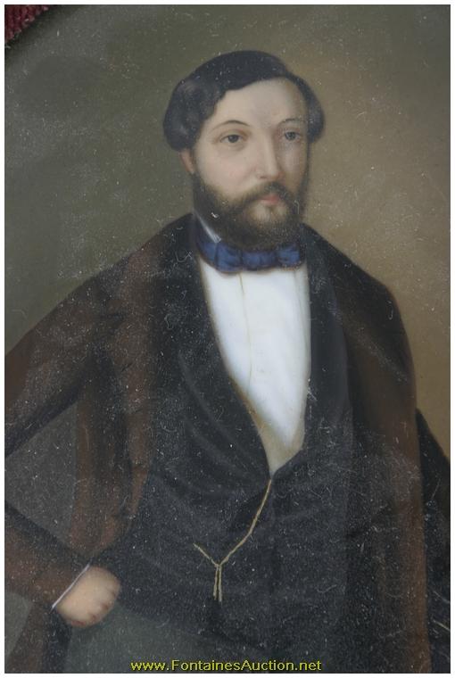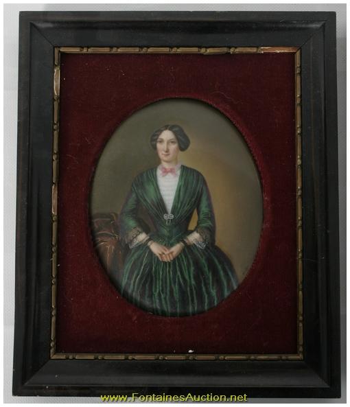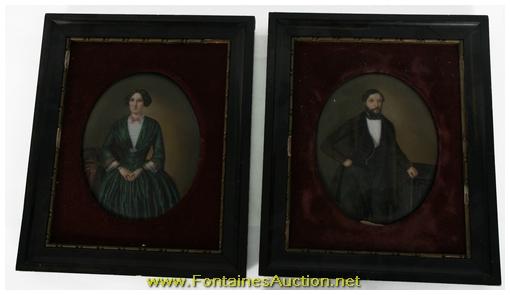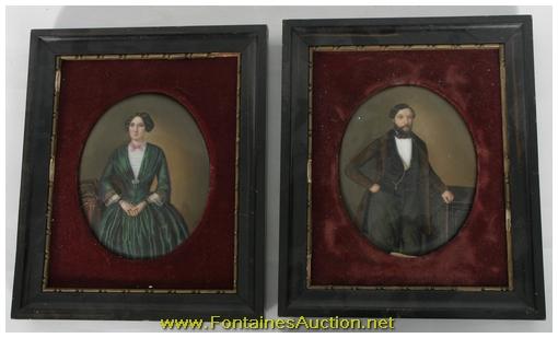 Pr of Oval German Porcelain Portrait Plaques. The first is of a woman, she wears a green dress with various lace trim and a pink ribbon around her neck, she stands facing forward with her hands in front of her. The other is of a man leaning against a chest, his right arm on his hip; he wears a long brown jacket, a black vest with an exposed watch chain and a blue bowtie. This is a match pair in excellent condition, signed on the woman's plaque "C. Fliege 1852". Plaques are in excellent condition, frames have some light losses and plaques need to be reset in the frame. 5.75"W x 7"H. Estimated Value$400 - 600.