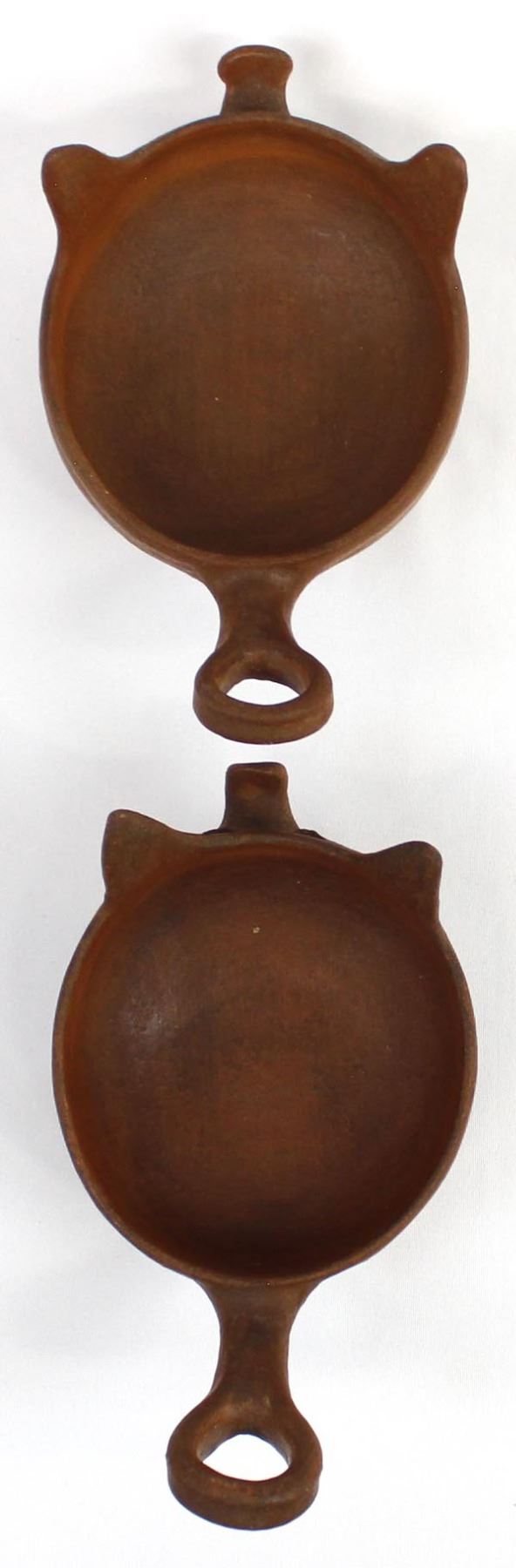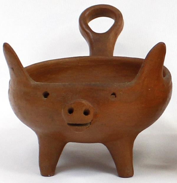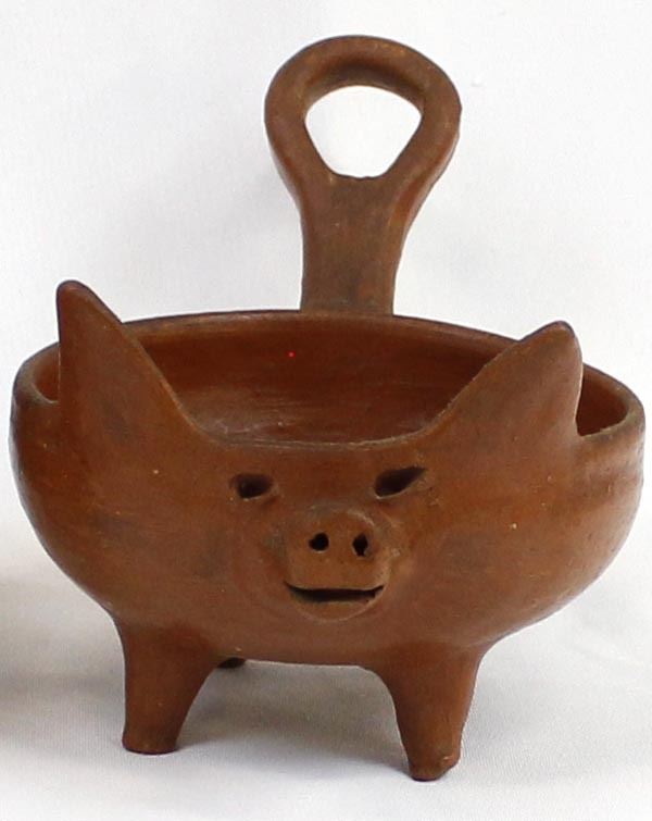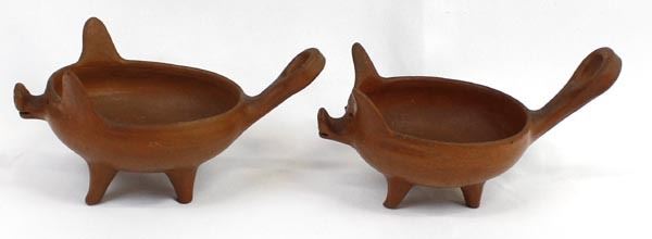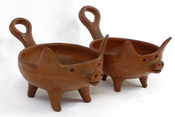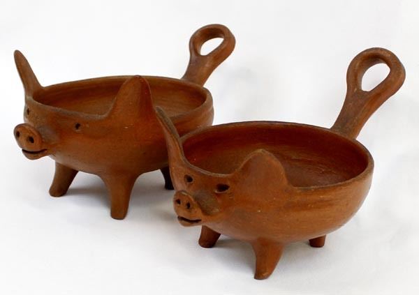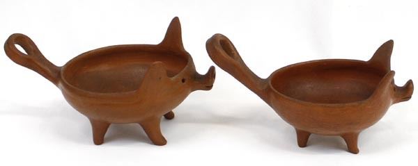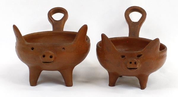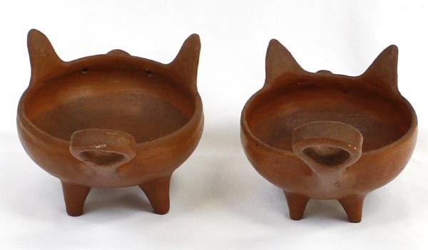 Pr of Redware Pottery Pig Bowls with Handles, measures 5 x 5 x 9''