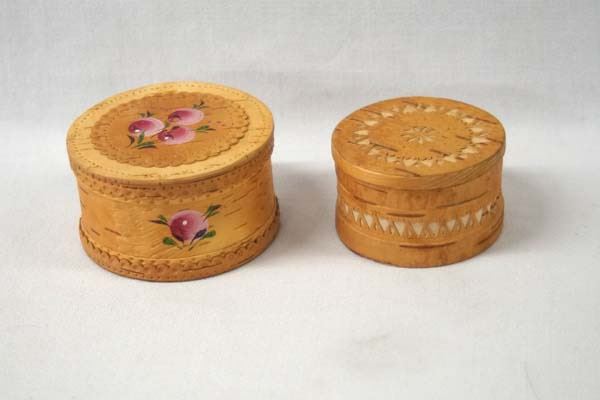 Pr of Scandinavian Birch Bark Hand Painted Lidded Boxes. These pieces are intricately hand carved and the larger one, which measures 2'' x 3.5'' is hand painted as well.