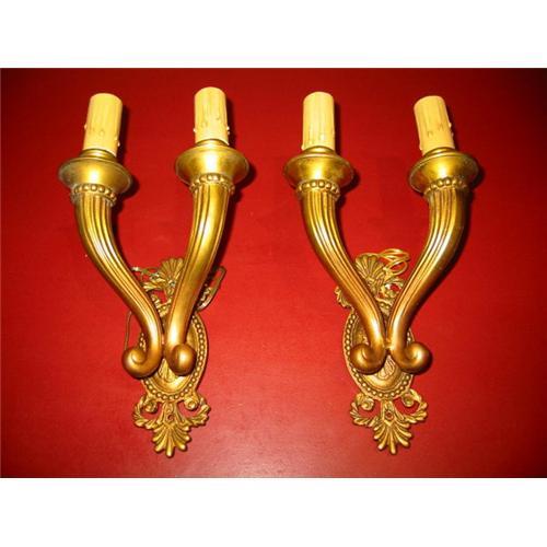 set of 2 French gild bronze sconces. in excellent condition. normal wear and tear. it has been re-wired, in working condition and ready to install. exquisite, decorative and fine accessory. measures about 10 inches tall, 5 inches wide. 2 lights on each. they are absolutely gorgious.