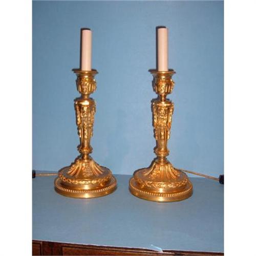 A wonderful pair of Empire ormolu candlesticks that have been converted to lamps. The round base of the lamps measure 6 inches in diameter. There is a green felt on the bottom of the lamps. Three lion heads decorate the upper pillar of the lamps Each lamp weighs approx. 2 pounds.