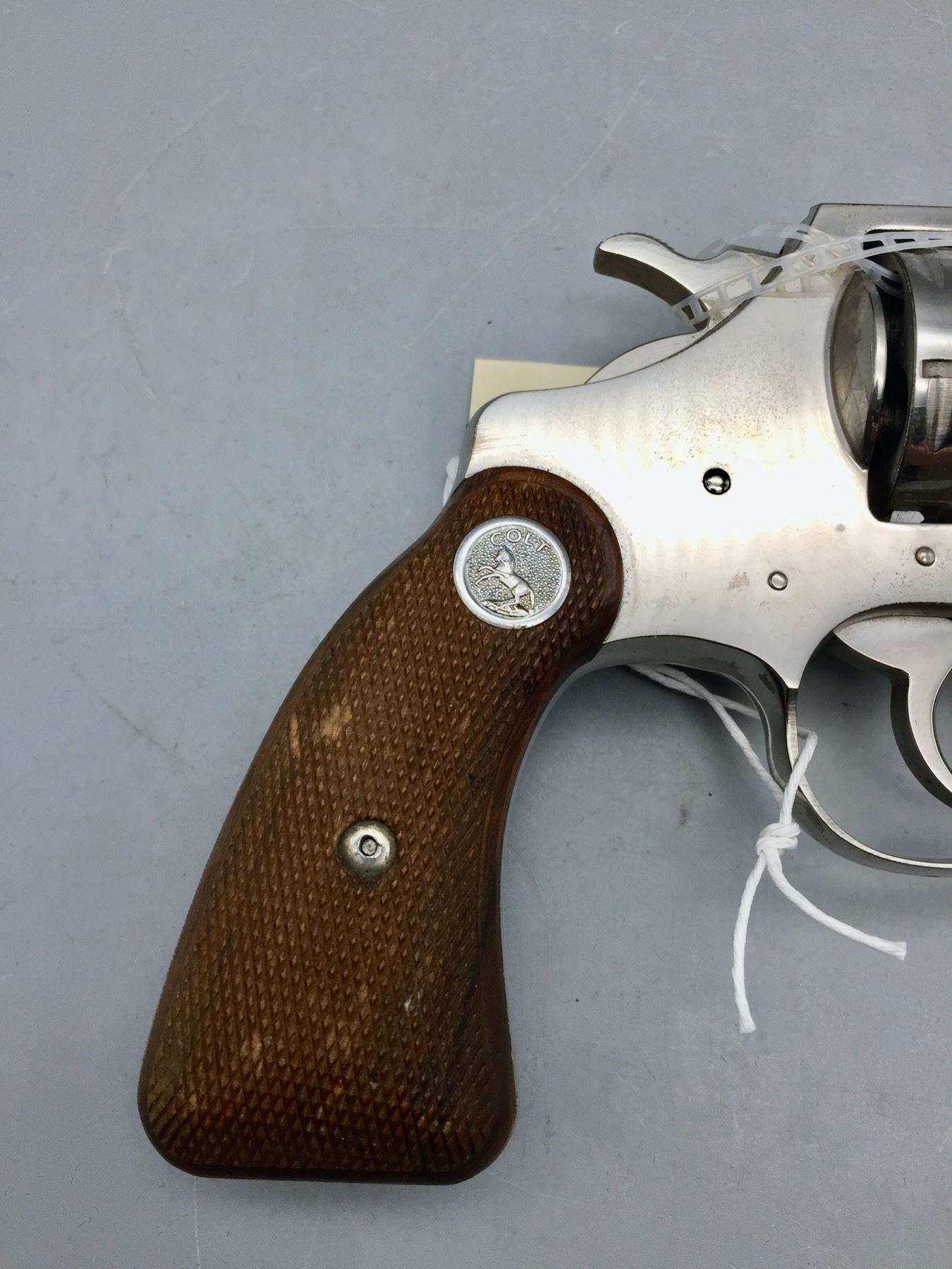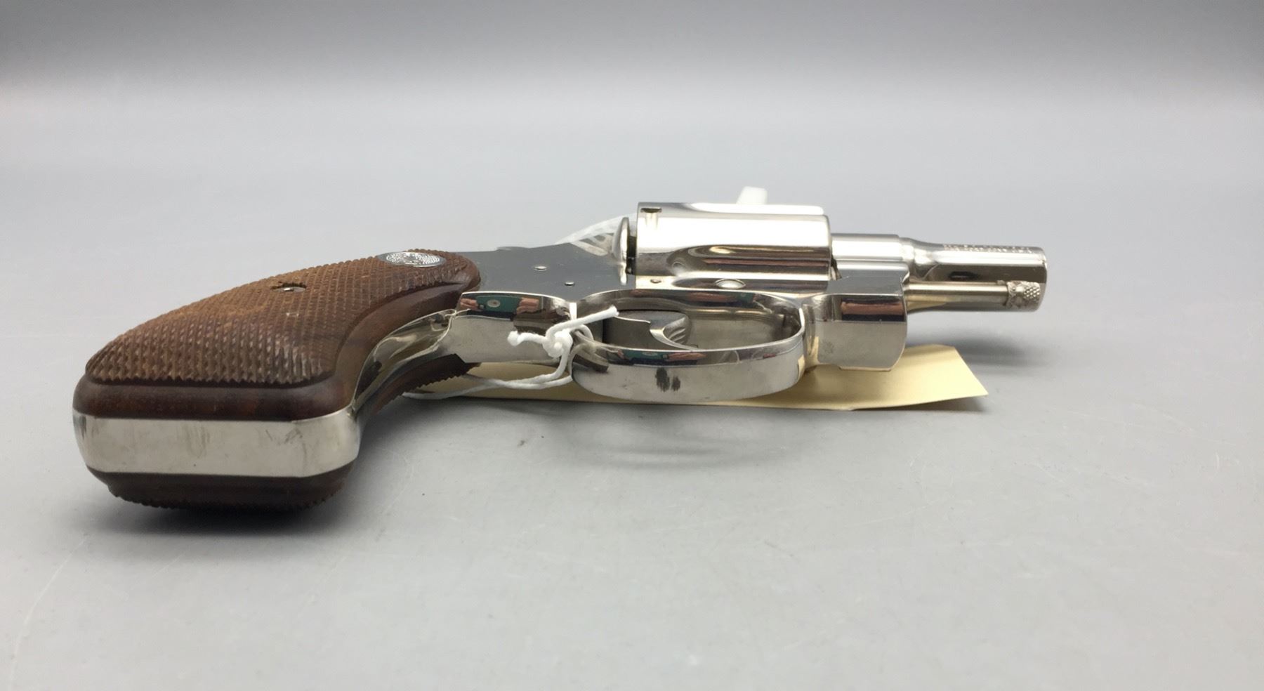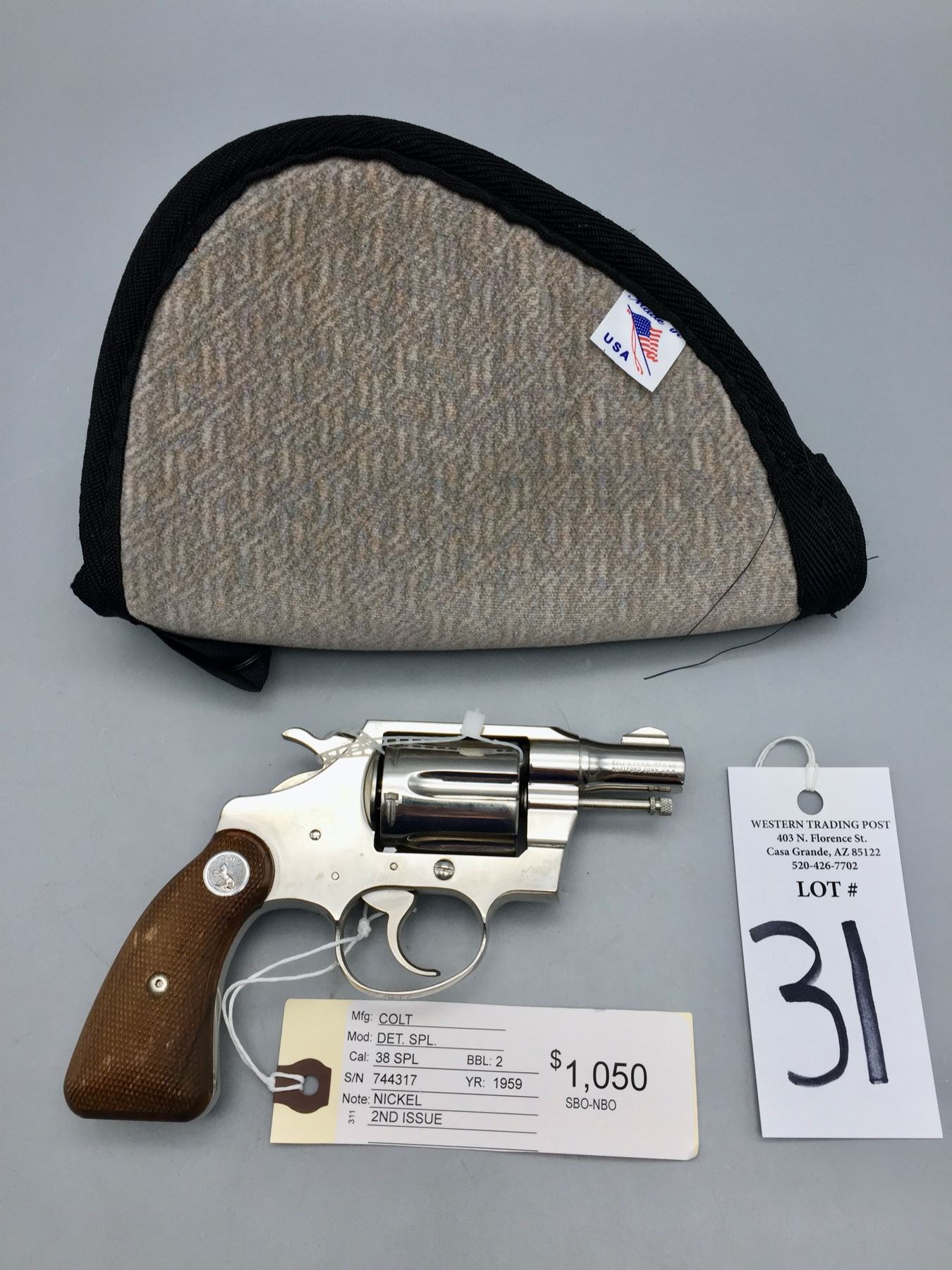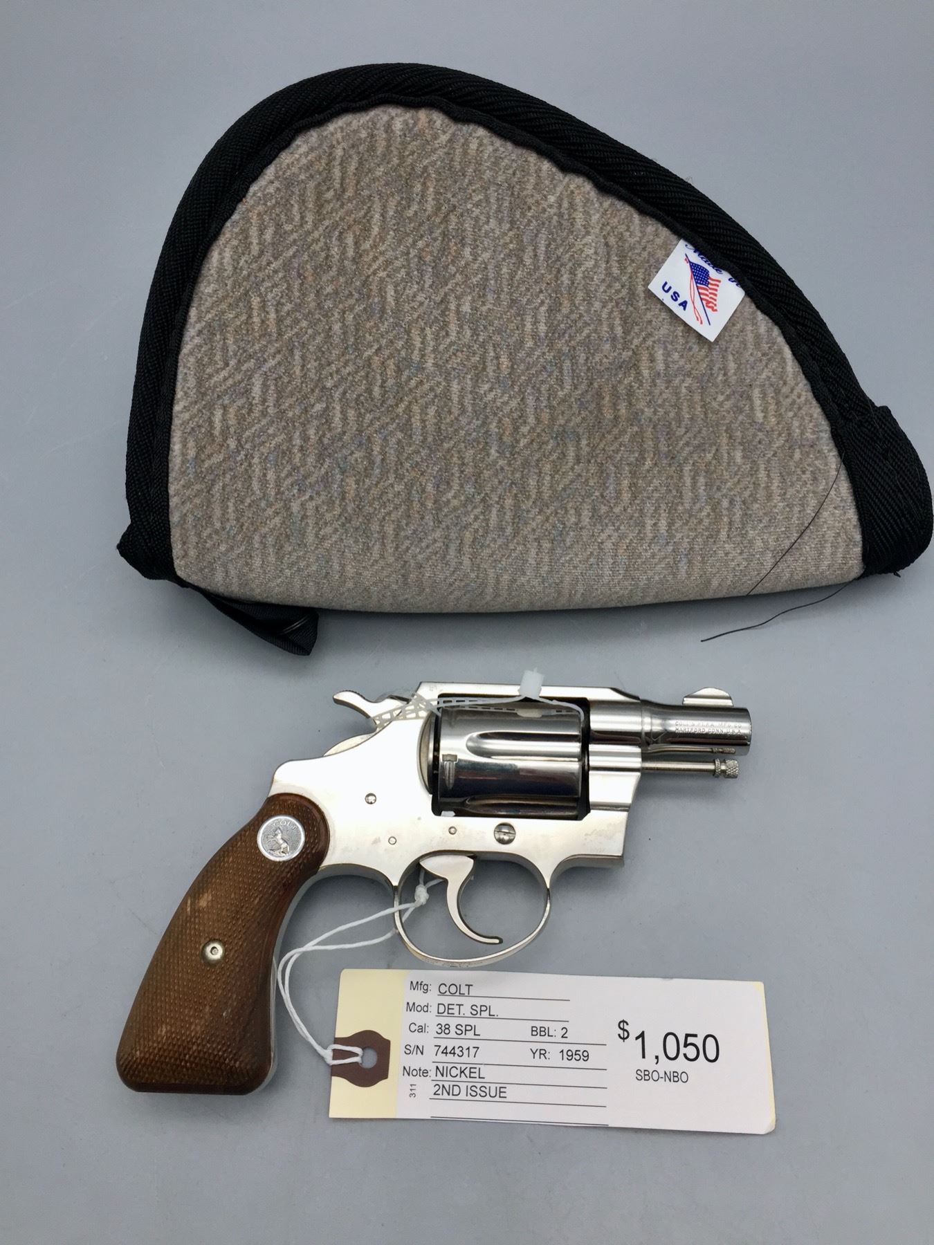 Description: Presented for sale in this lot is a Colt Detective Special Revolver in a .38 caliber with a nickel finish and walnut grips. It comes with a padded pistol case and is in super condition. Maker: Colt. Approx. Age: 1959. Serial No. 744317. Size: Barrel measures 2 inches long. Condition: Good to excellent for its age, only minor shelf wear/scratches showing. Please look closely at the pictures - they are an important part of our description. Shipping: There will be a $15 handling, packaging fee for shipping this lot. The actual cost of postage will be added on top of that. *****This firearm requires an FFL Transfer*****
