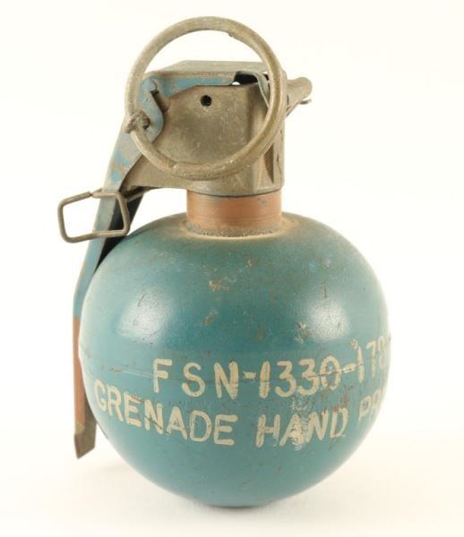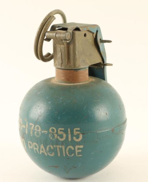 Made of cast iron and painted blue with a hole in the bottom. Reads ' FSN-1330-178-8515, Grenade Hand Practice'. Approx 2 1/2" dia. 3 1/2" h.