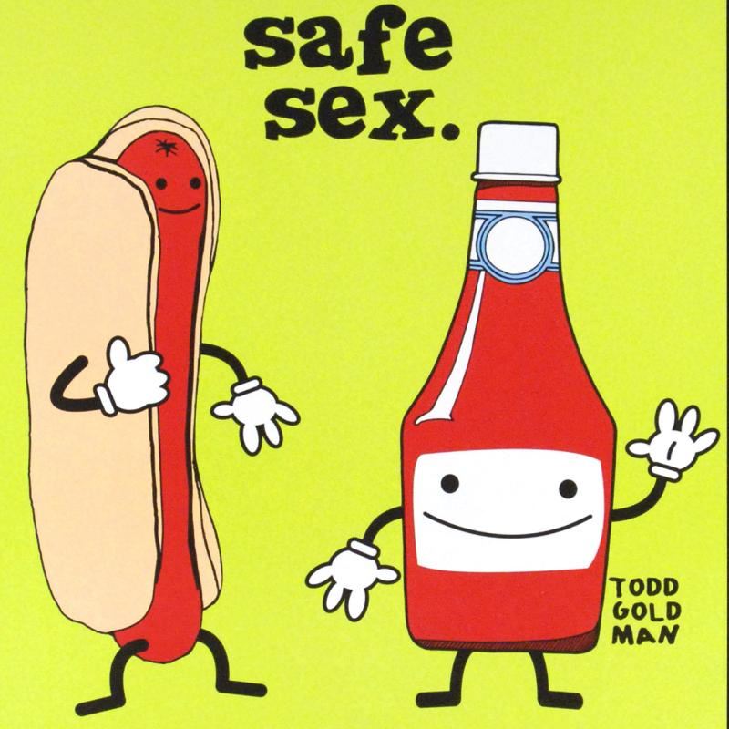 "Practice Safe Sex, Always Use A Condiment" is a fine art litho poster by Todd Goldman! Measures approx. 24" x 36" (poster).