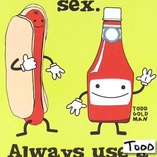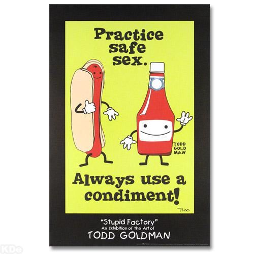 ADD THE IRREVERENT ARTWORK OF WORLD-RENOWNED ARTIST TODD GOLDMAN TO YOUR COLLECTION! Pop artist Todd Goldman is known all across the globe for his whip-smart and wickedly funny puns and pictures! "Practice Safe Sex, Always Use A Condiment!" is a fine art litho poster hand signed by Todd. Measures approx. 24" x 36" (poster).