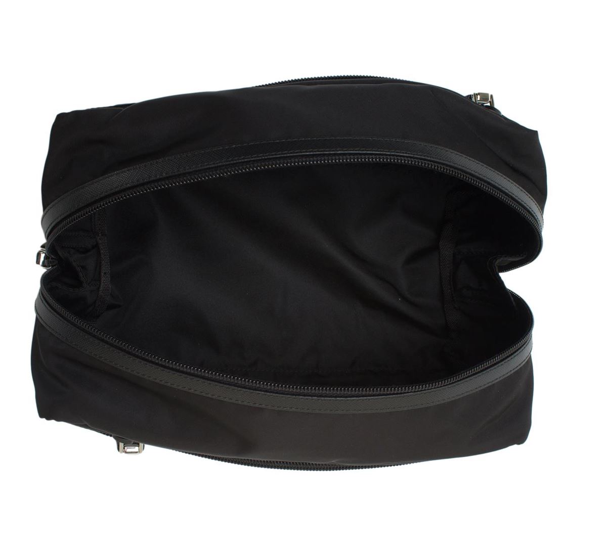 Simple Black Prada toiletry case which features nylon construction with black leather trip and the signature Prada logo on the front. Zip top closure. Silvertone Hardware. Includes front and rear zipper pocket. H6"XW11"XW5.25". Made in Italy. This is a brand new bag.
