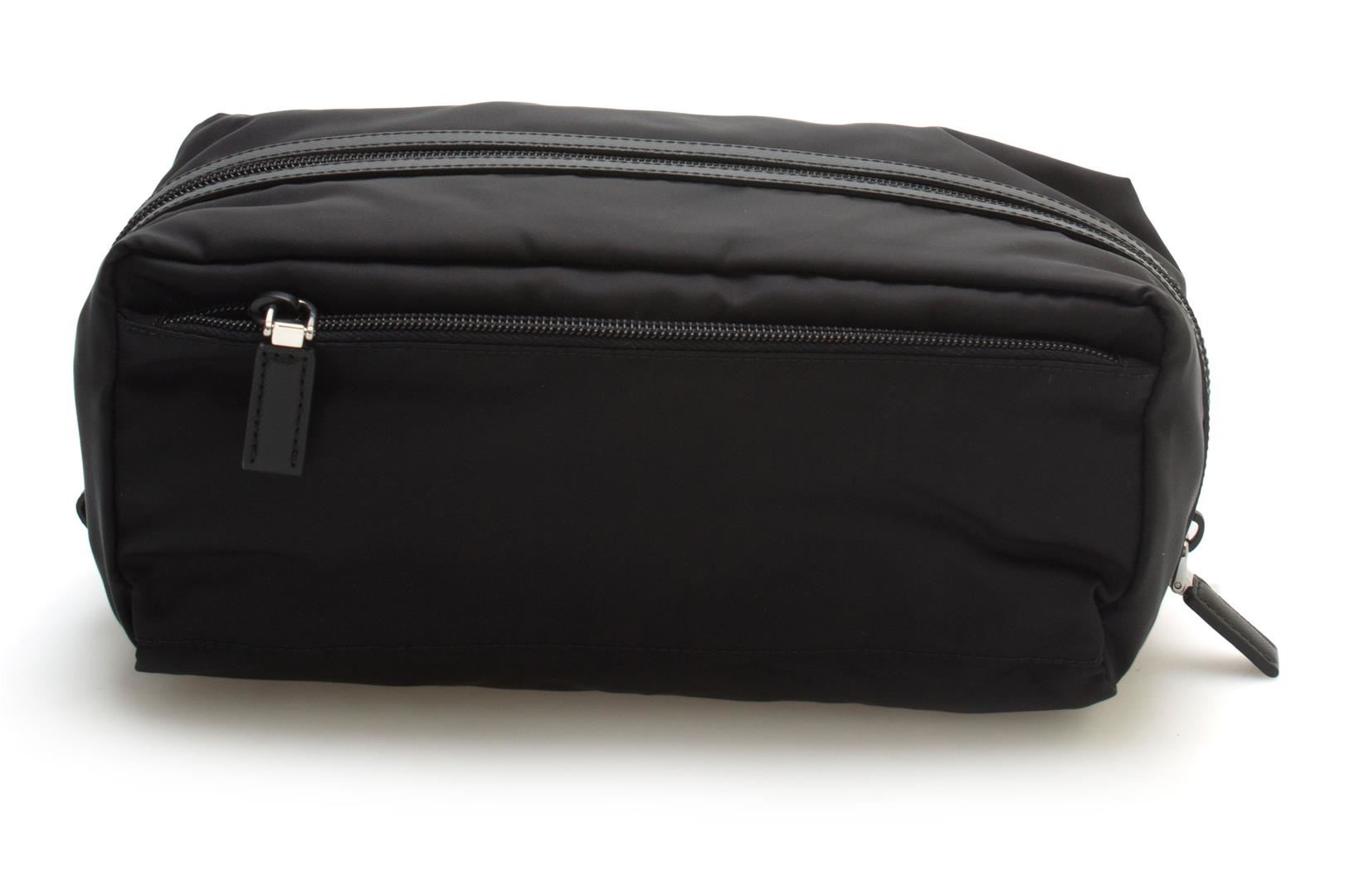 Simple Black Prada toiletry case which features nylon construction with black leather trip and the signature Prada logo on the front. Zip top closure. Silvertone Hardware. Includes front and rear zipper pocket. H6"XW11"XW5.25". Made in Italy. This is a brand new bag.