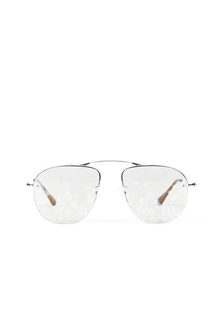 Prada Grey/Silver aviator sunglasses feature branded arms and floral print mirrored lenses.