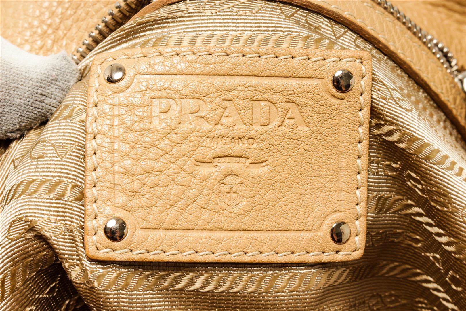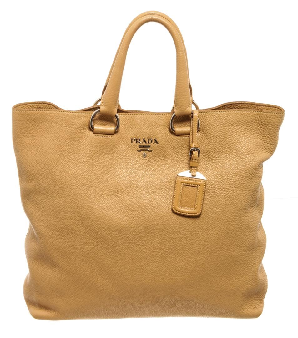 One Prada Beige Grained Leather Vitello Daino Large Convertible Shopper Tote Bag. Item is sold AS-IS. All available information is listed in the description and shown in the photo. Prada Beige Grained Leather Vitello Daino Large Convertible Shopper Tote Bag with gold-tone hardware, leather bag tag hang on the handles, metal Prada logo at the front, Prada scripted logo beige fabric lining, interior slip pocket, dual leather top handles, detachable leather shoulder strap, and zip closure at the top. .