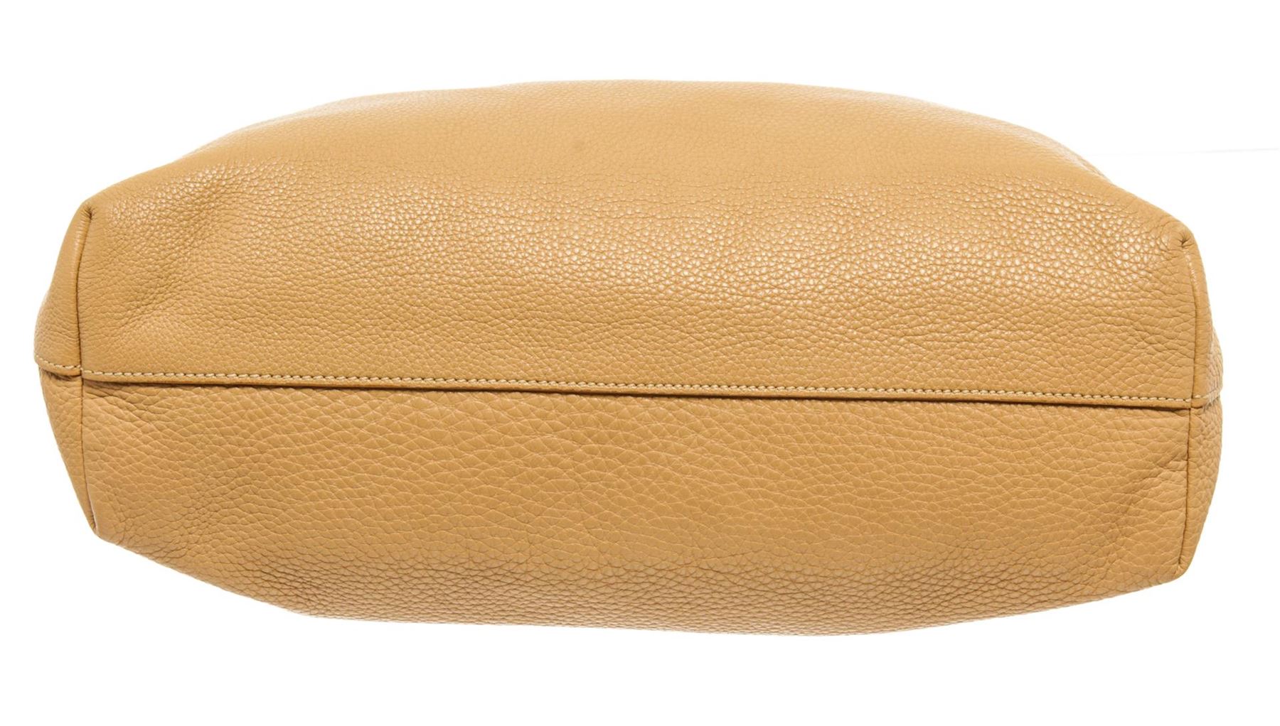 One Prada Beige Grained Leather Vitello Daino Large Convertible Shopper Tote Bag. Item is sold AS-IS. All available information is listed in the description and shown in the photo. Prada Beige Grained Leather Vitello Daino Large Convertible Shopper Tote Bag with gold-tone hardware, leather bag tag hang on the handles, metal Prada logo at the front, Prada scripted logo beige fabric lining, interior slip pocket, dual leather top handles, detachable leather shoulder strap, and zip closure at the top. .