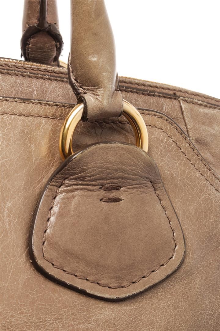 Prada Beige Leather Two Way Bag. All available information is listed in the description and shown in the photos. Prada Beige Leather Two Way Bag with gold-tone hardware, interior zip pocket, Dual rolled top handles, adjustable leather shoulder strap, zip closure.