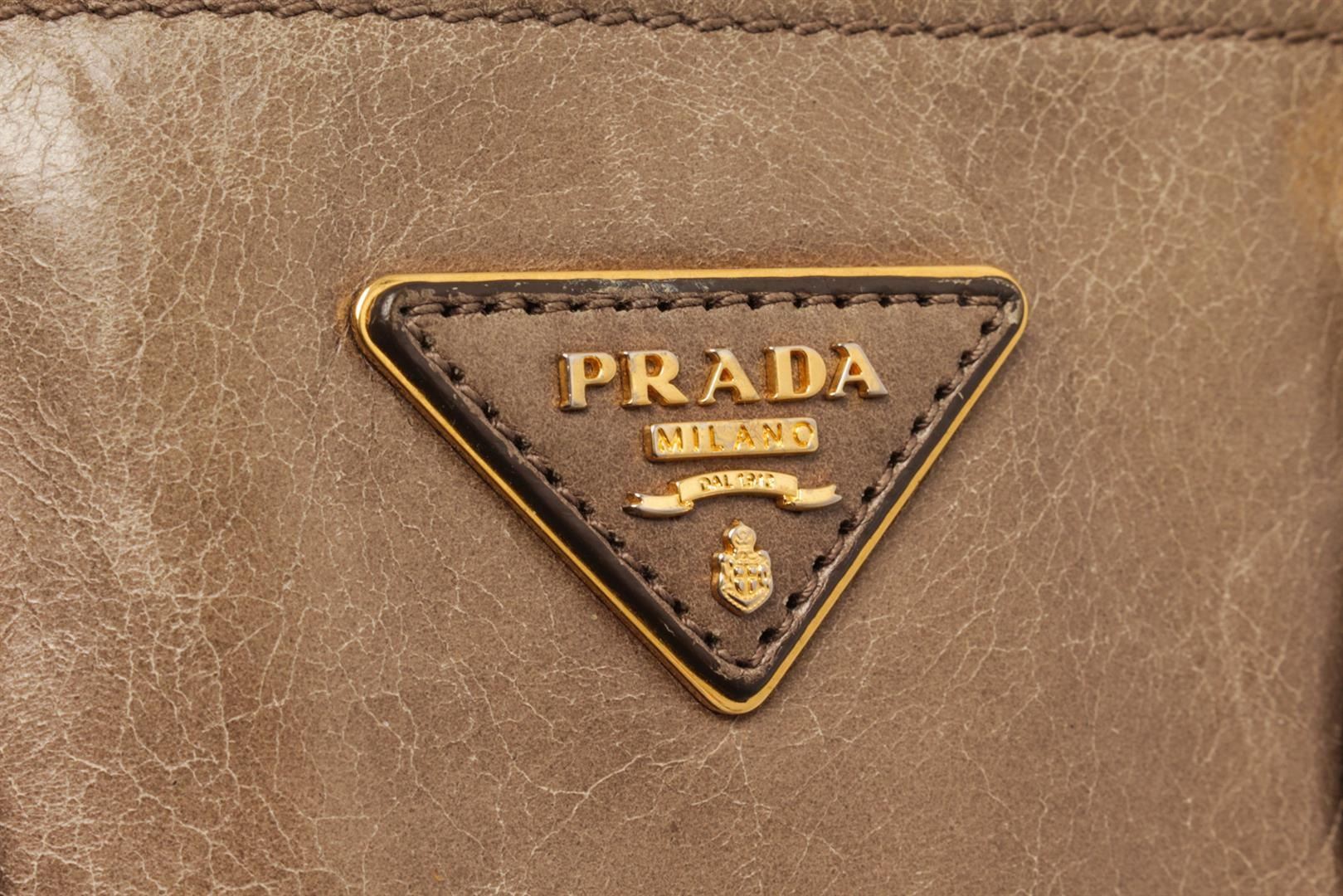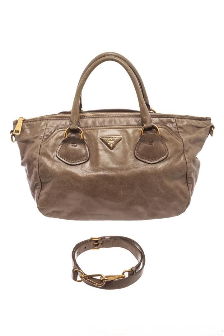Prada Beige Leather Two Way Bag. All available information is listed in the description and shown in the photos. Prada Beige Leather Two Way Bag with gold-tone hardware, interior zip pocket, Dual rolled top handles, adjustable leather shoulder strap, zip closure.