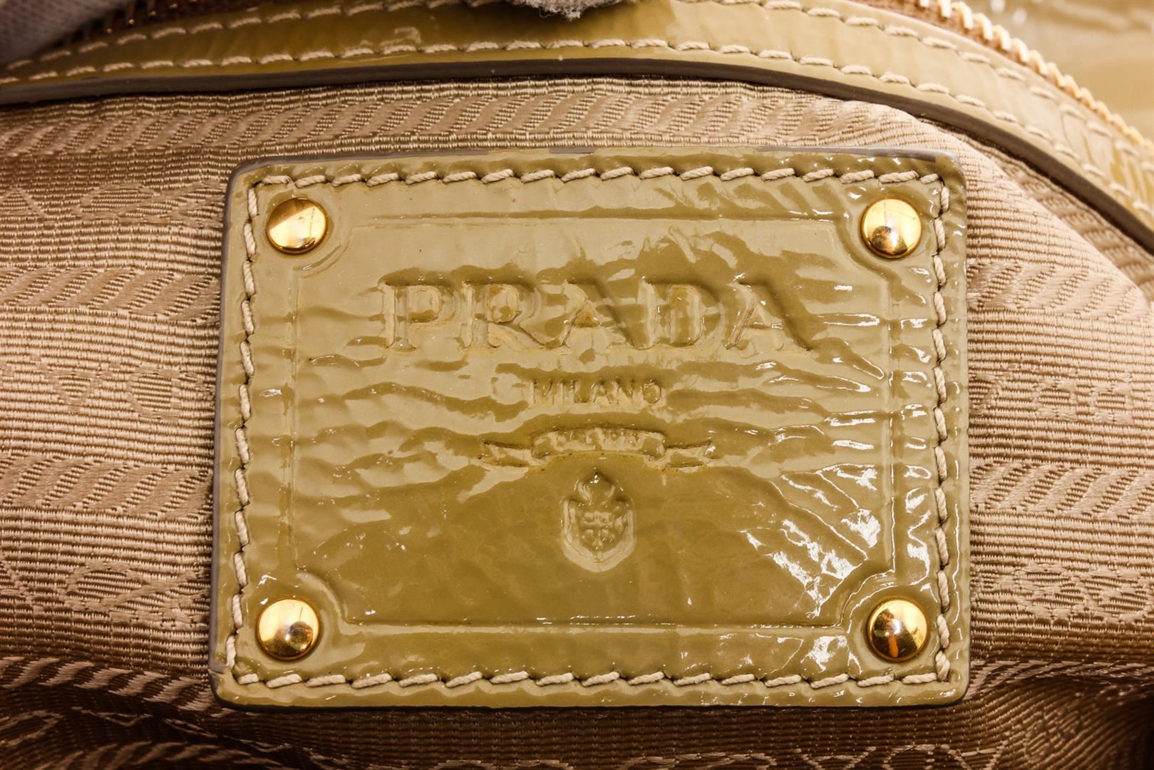 Prada beige patent leather expandable two-way shoulder bag with gold hardware, optional detachable leather shoulder strap, dual rolled top handles, snap closure expandable sides, protective feet at base, tan logo jacquard canvas lining, two interior pockets; both with zip closure and overall magnetic snap closure at top.