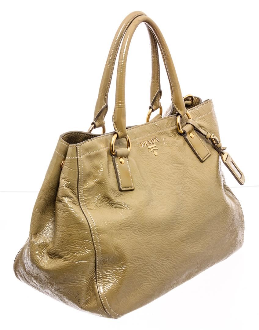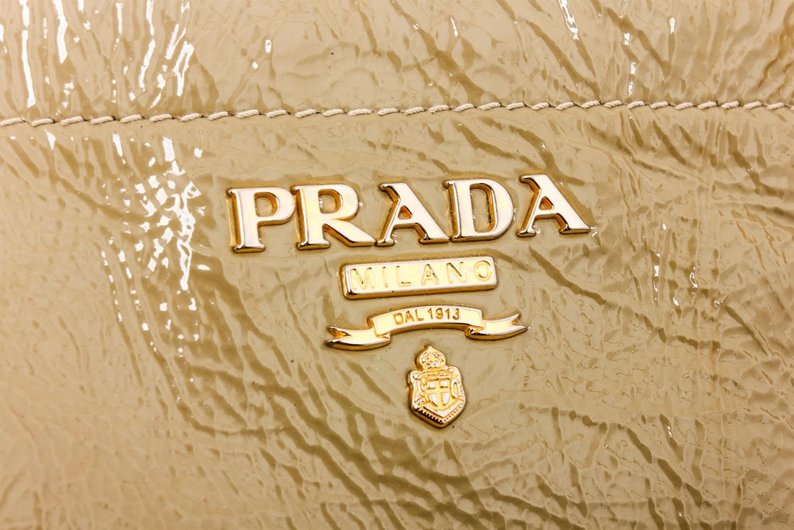 Prada beige patent leather expandable two-way shoulder bag with gold hardware, optional detachable leather shoulder strap, dual rolled top handles, snap closure expandable sides, protective feet at base, tan logo jacquard canvas lining, two interior pockets; both with zip closure and overall magnetic snap closure at top.