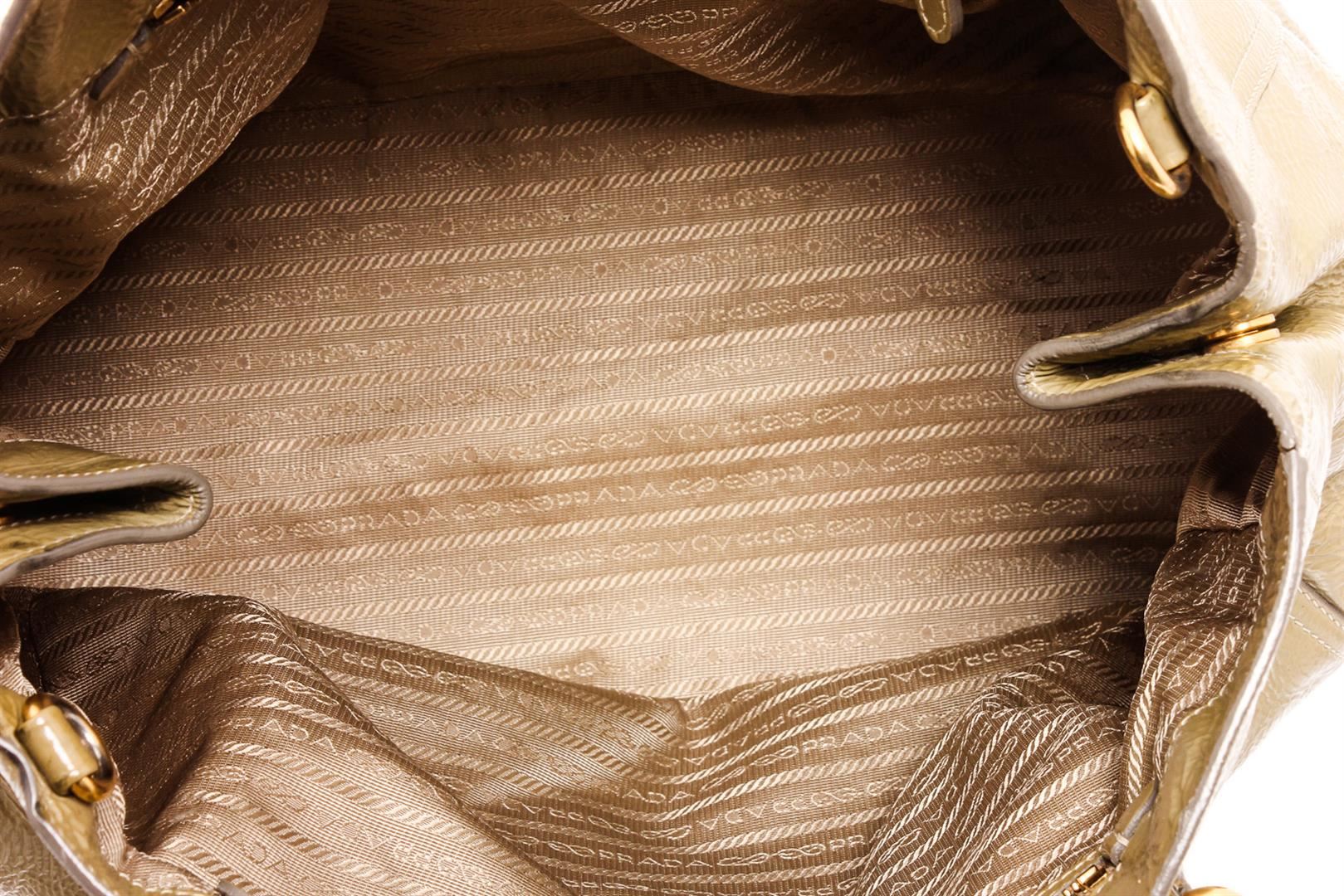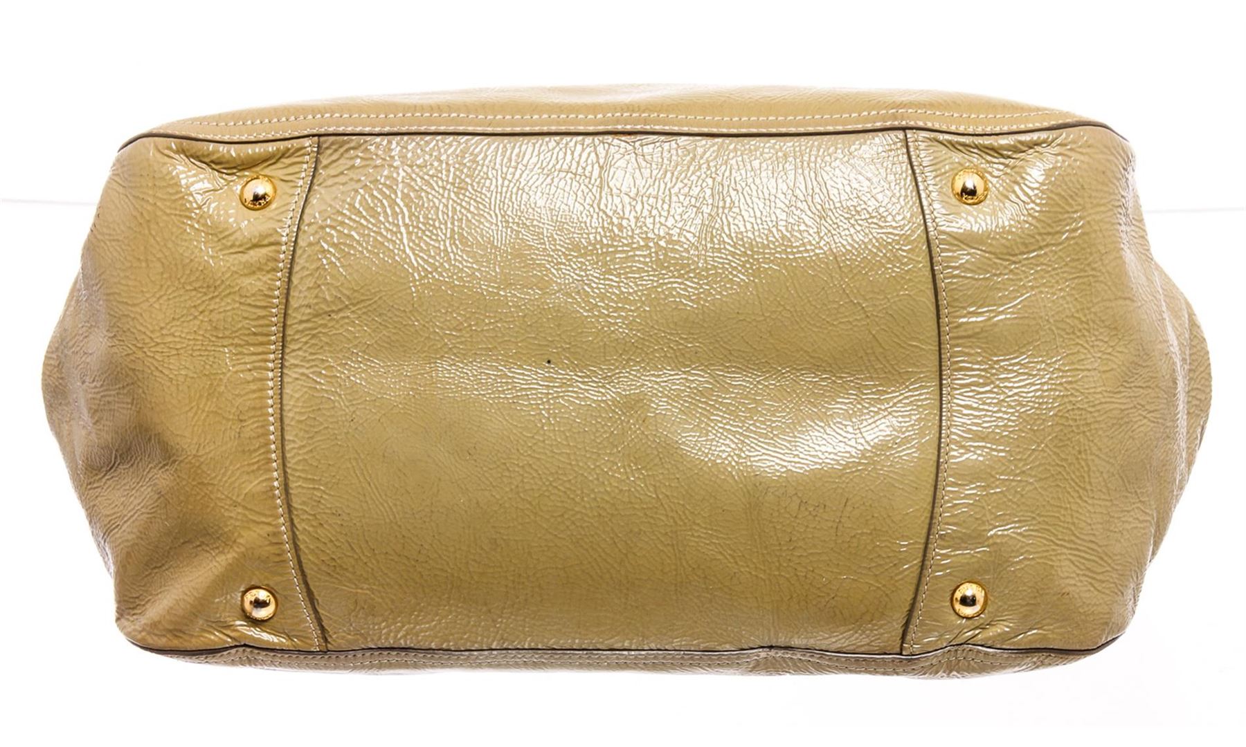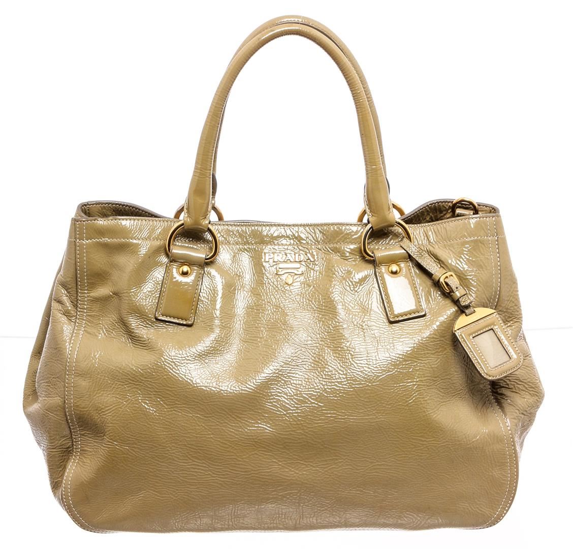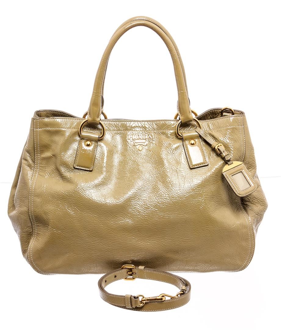 Prada beige patent leather expandable two-way shoulder bag with gold hardware, optional detachable leather shoulder strap, dual rolled top handles, snap closure expandable sides, protective feet at base, tan logo jacquard canvas lining, two interior pockets; both with zip closure and overall magnetic snap closure at top.