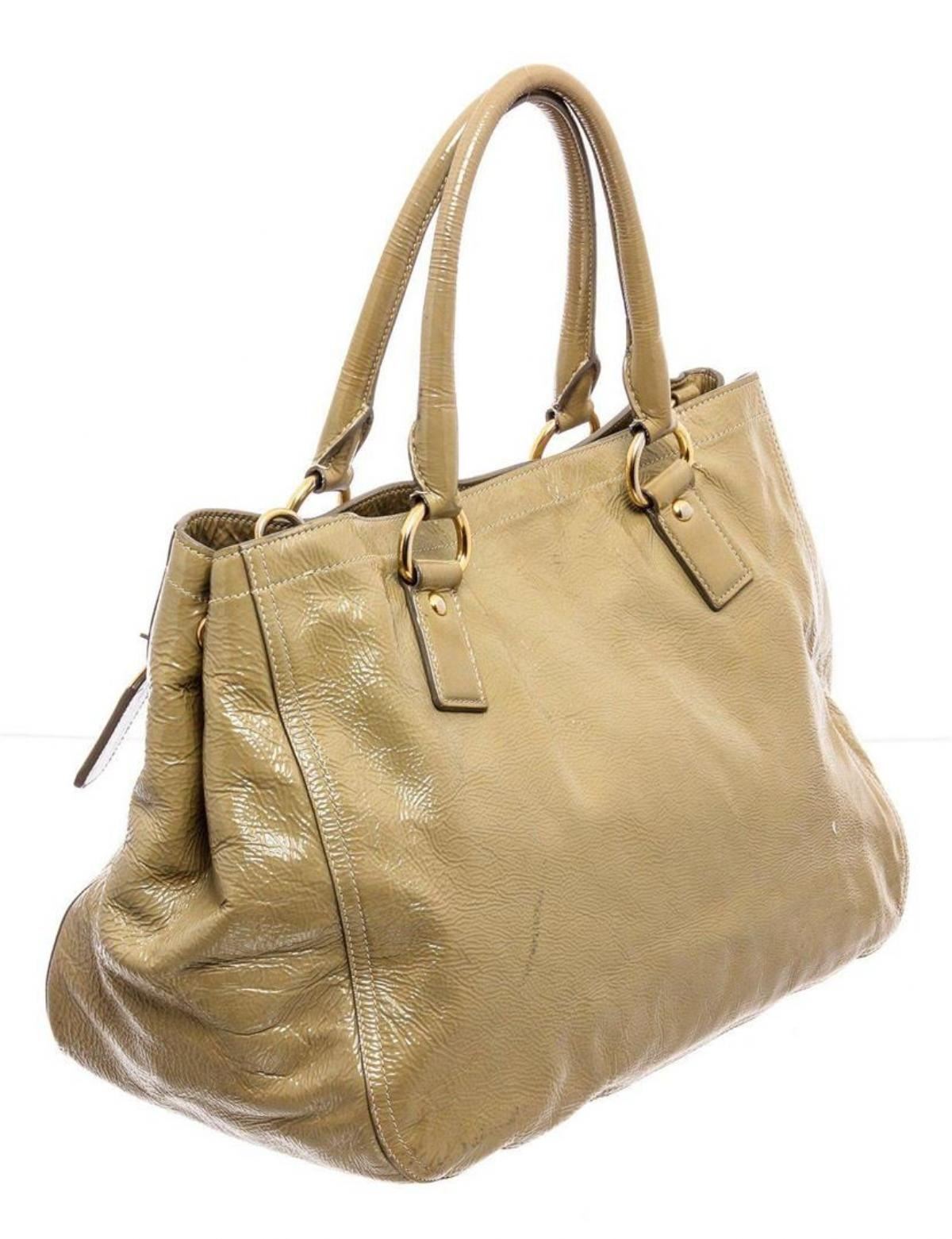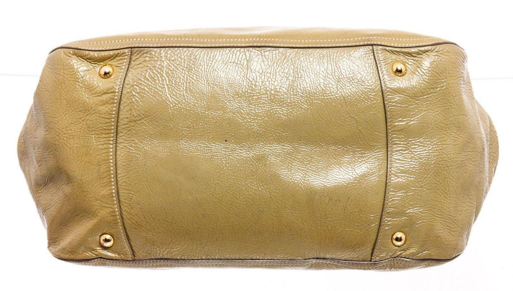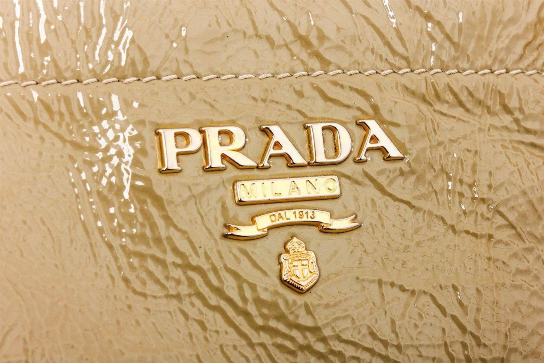 Prada beige patent leather expandable two-way shoulder bag with gold hardware, optional detachable leather shoulder strap, dual rolled top handles, snap closure expandable sides, protective feet at base, tan logo jacquard canvas lining, two interior pockets; both with zip closure and overall magnetic snap closure at top. Measurements: Length: 19.5 in / 50 cm Width: 7.95 in / 20 cm 11.5 in / 29 cm Condition: Pre-Owned Good overall, please see photographs for detail.