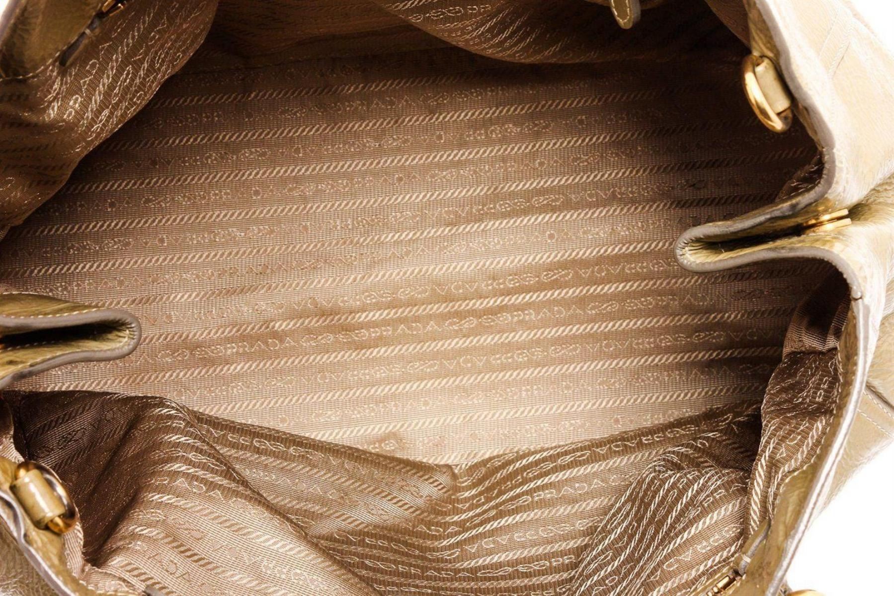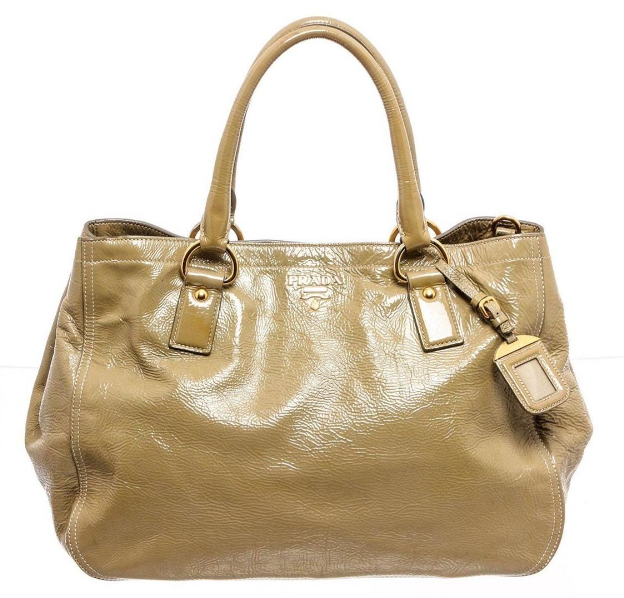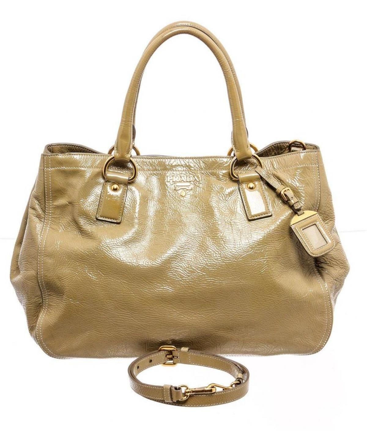 Prada beige patent leather expandable two-way shoulder bag with gold hardware, optional detachable leather shoulder strap, dual rolled top handles, snap closure expandable sides, protective feet at base, tan logo jacquard canvas lining, two interior pockets; both with zip closure and overall magnetic snap closure at top. Measurements: Length: 19.5 in / 50 cm Width: 7.95 in / 20 cm 11.5 in / 29 cm Condition: Pre-Owned Good overall, please see photographs for detail.