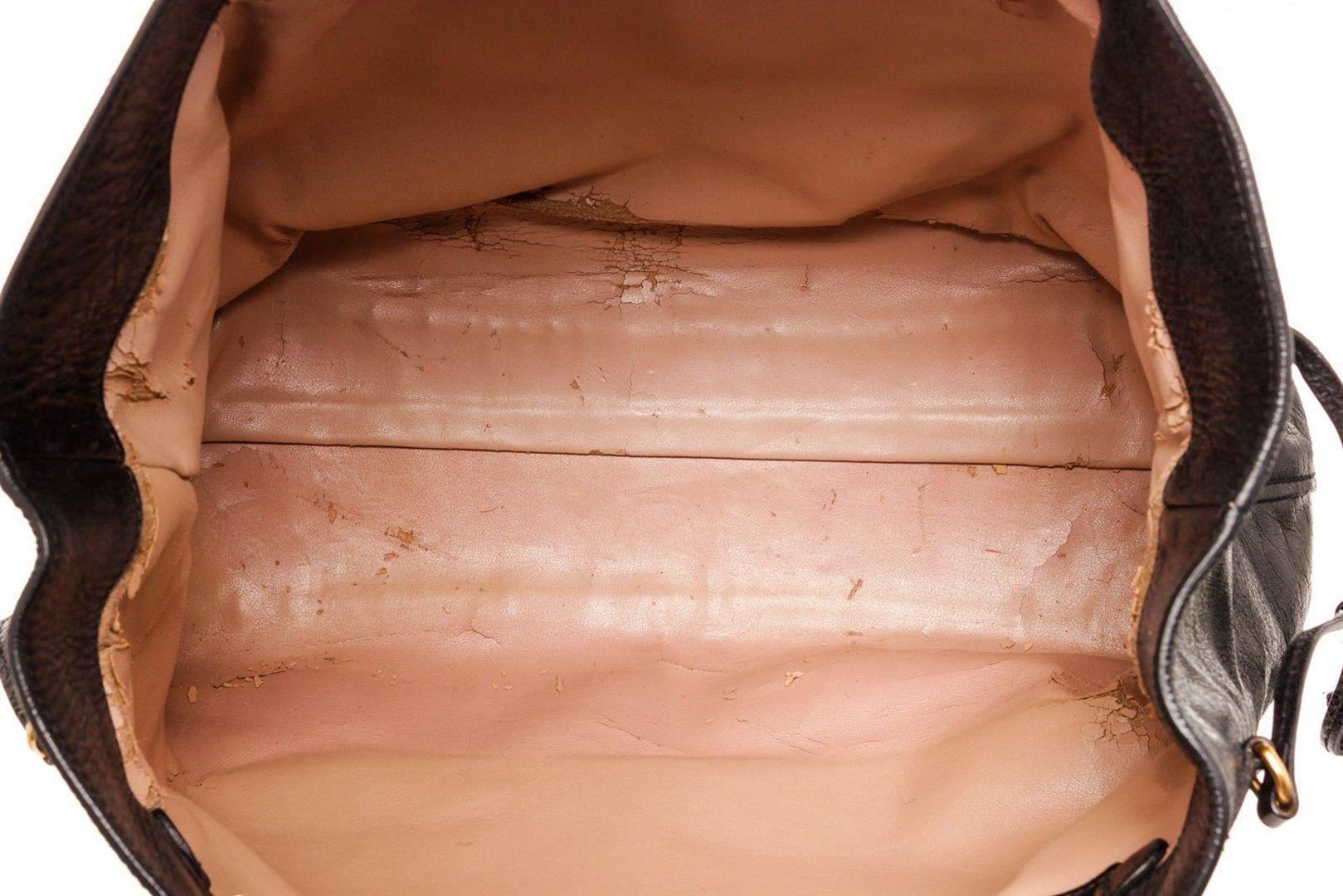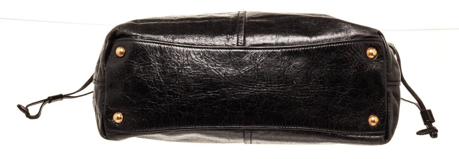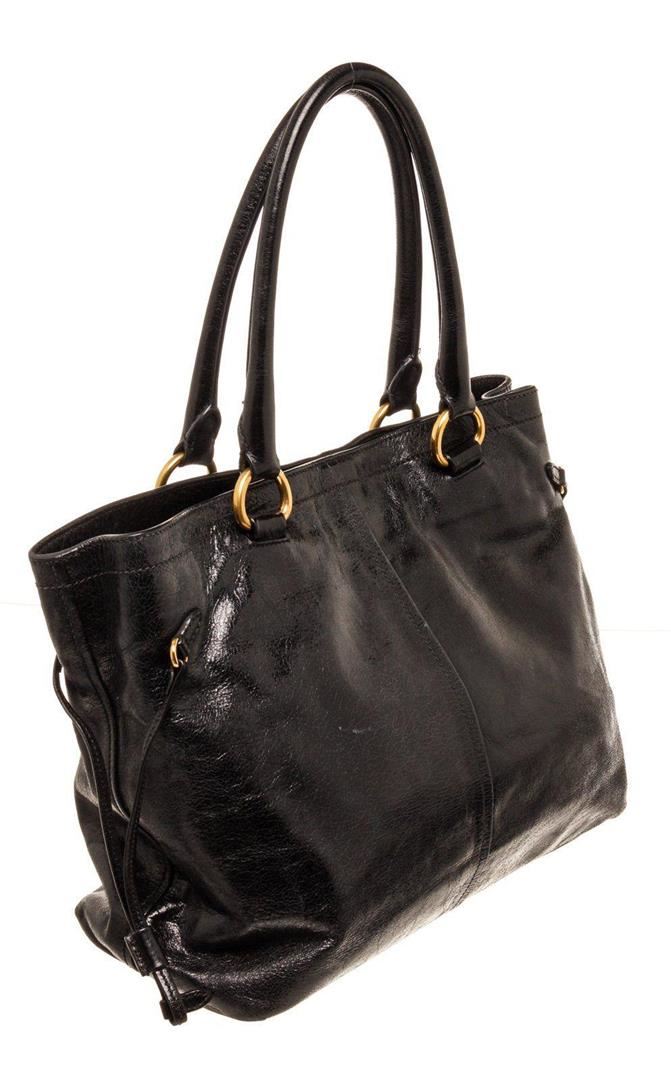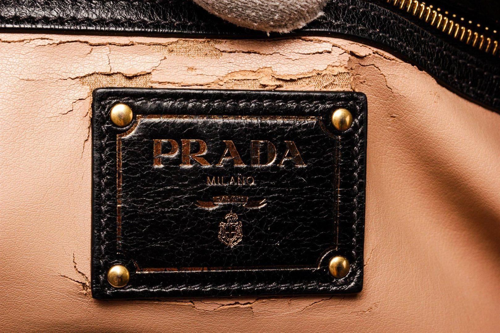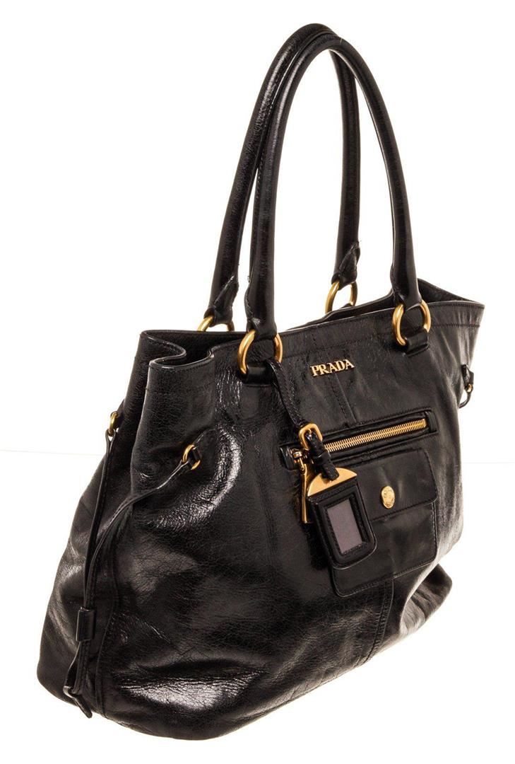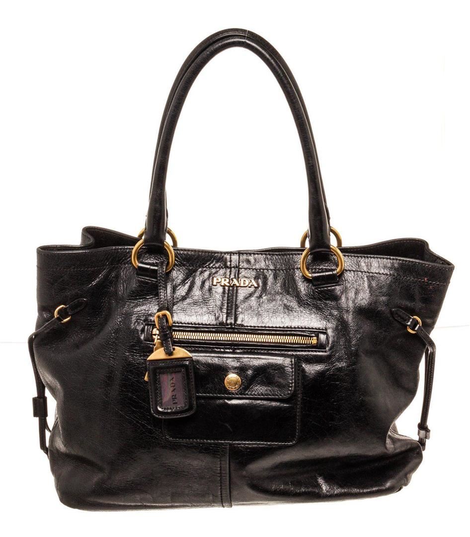 Prada Black Lambskin Leather Tote bag with silver-tone hardware, black leather, leather lining, exterior pockets, dual top handles, flap closure.