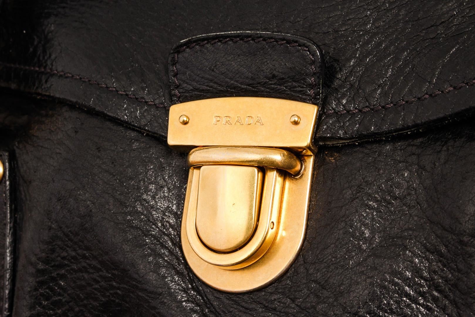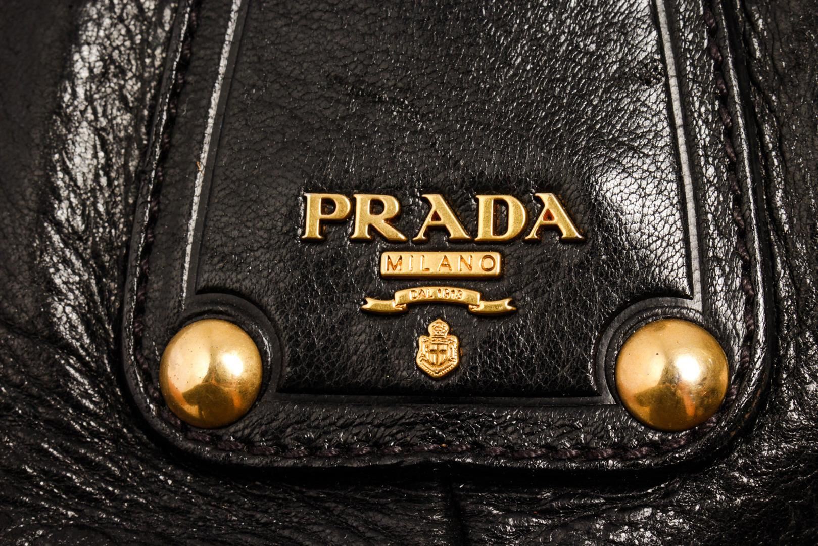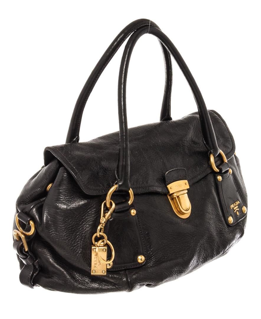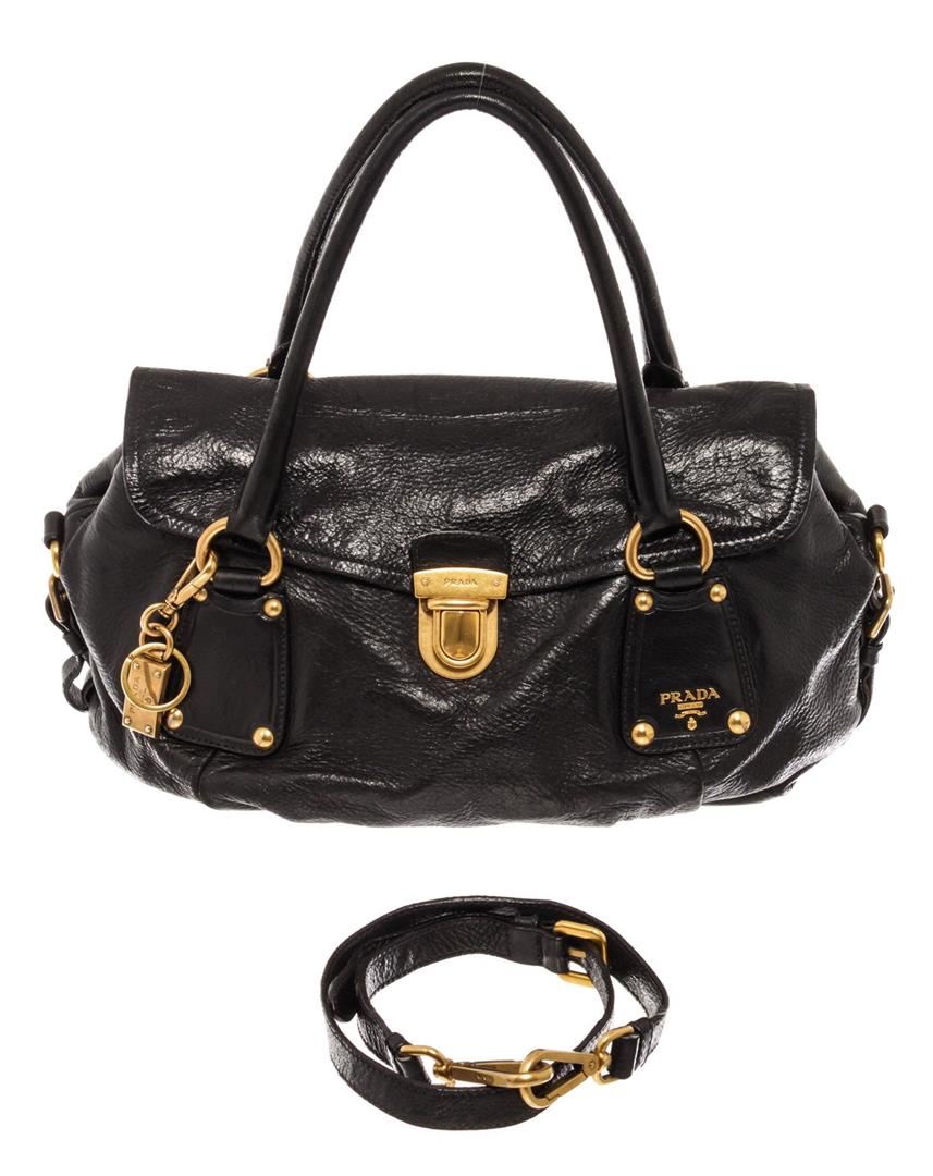 Prada Push-Lock 2way Bag has gorgeous black calfskin leather with and a gold-tone pushlock closure. It features detachable shoulder leather strap, double rolled leather handles and black Prada signature fabric interior lining with one stud-closure flat po
