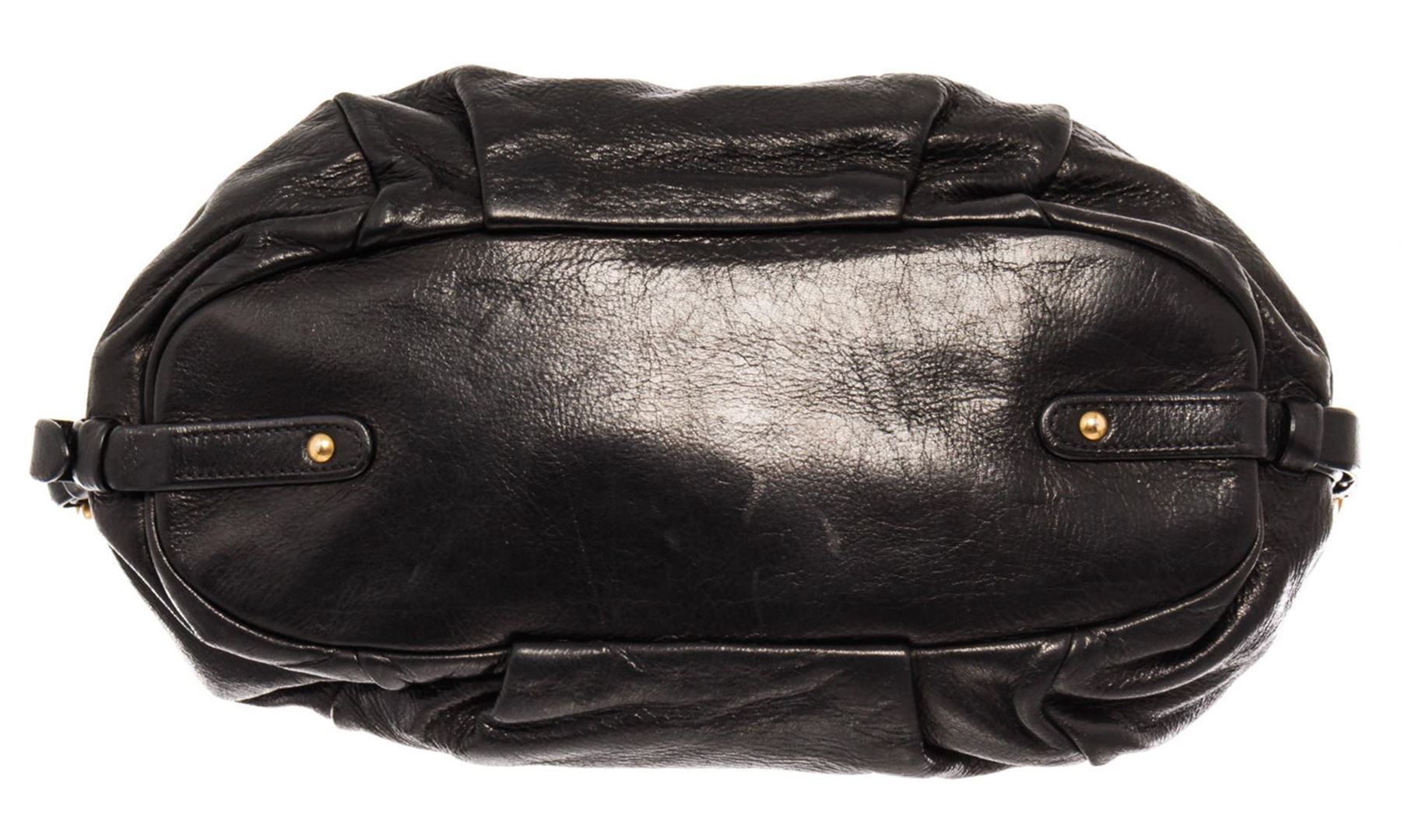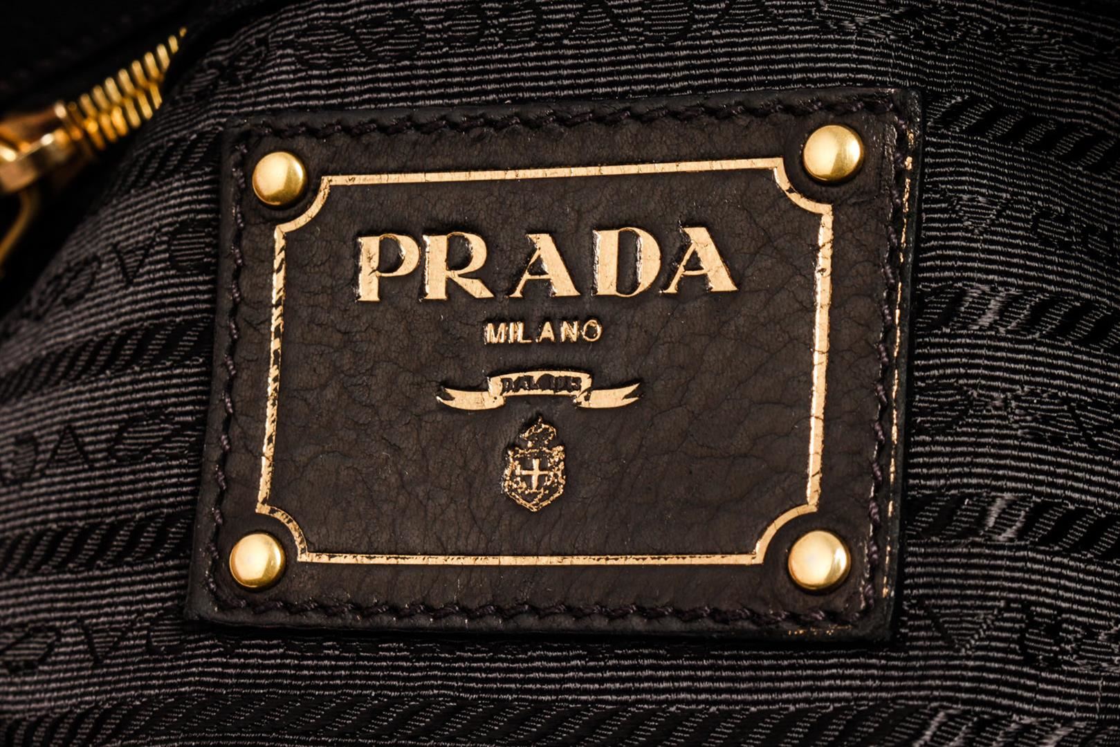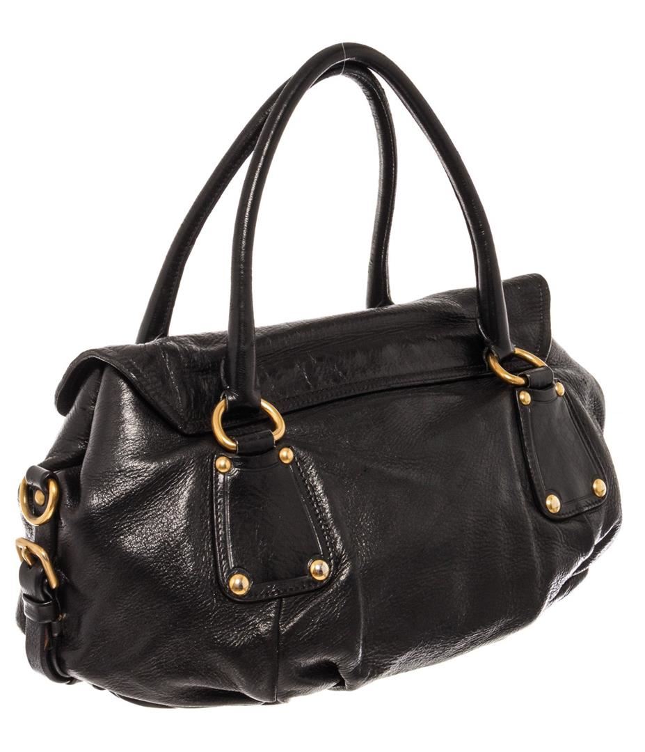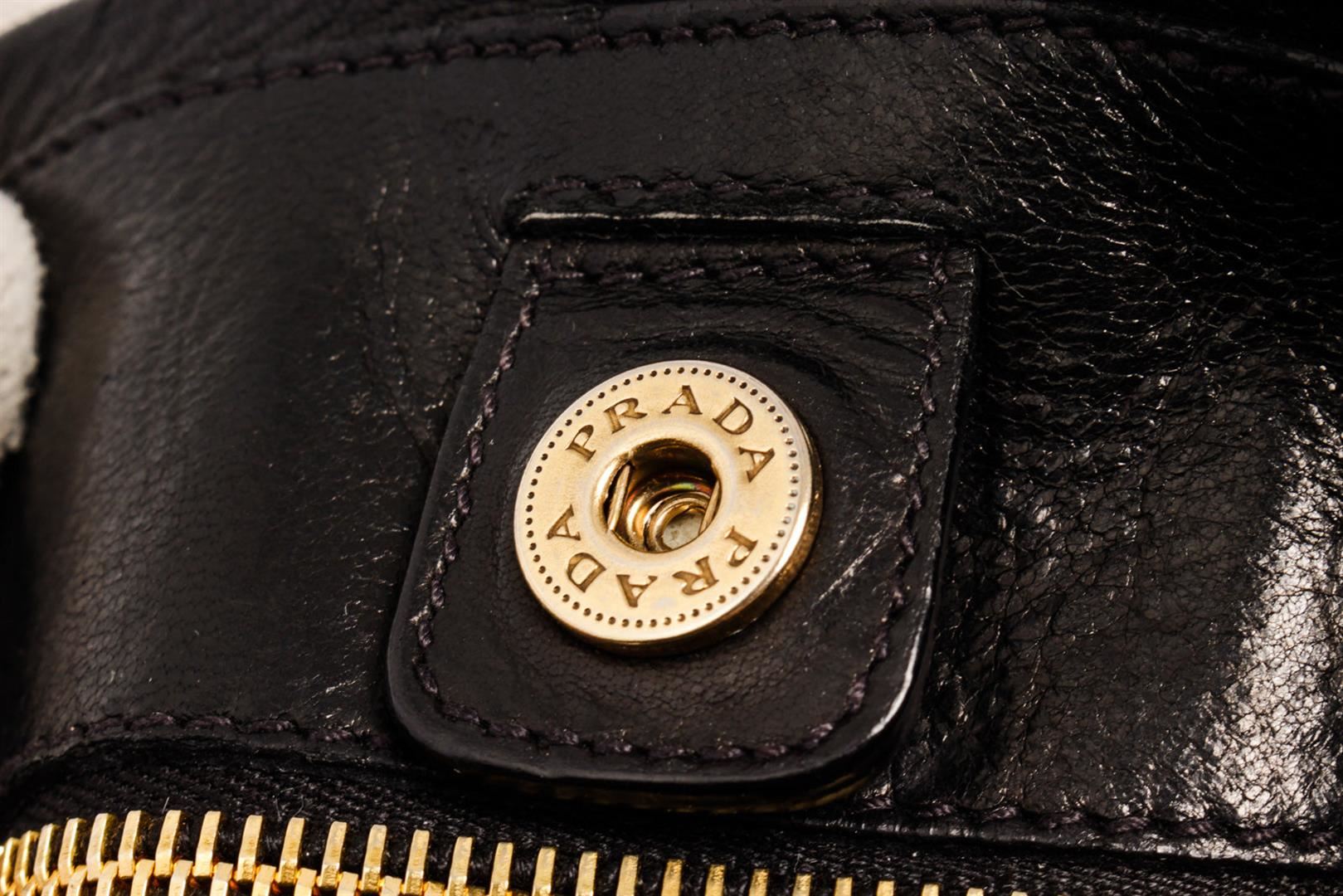 Prada Push-Lock 2way Bag has gorgeous black calfskin leather with and a gold-tone pushlock closure. It features detachable shoulder leather strap, double rolled leather handles and black Prada signature fabric interior lining with one stud-closure flat po