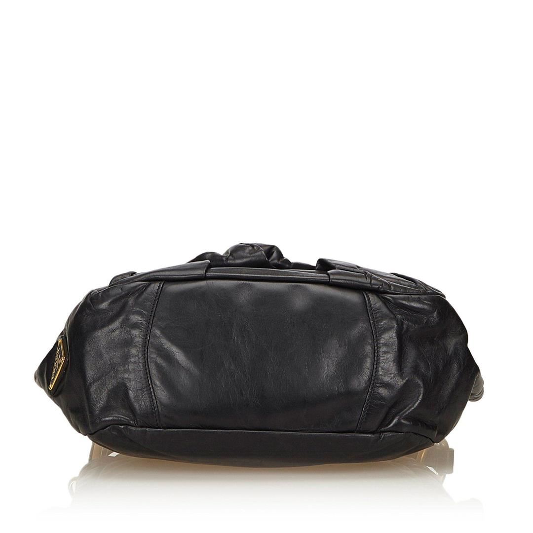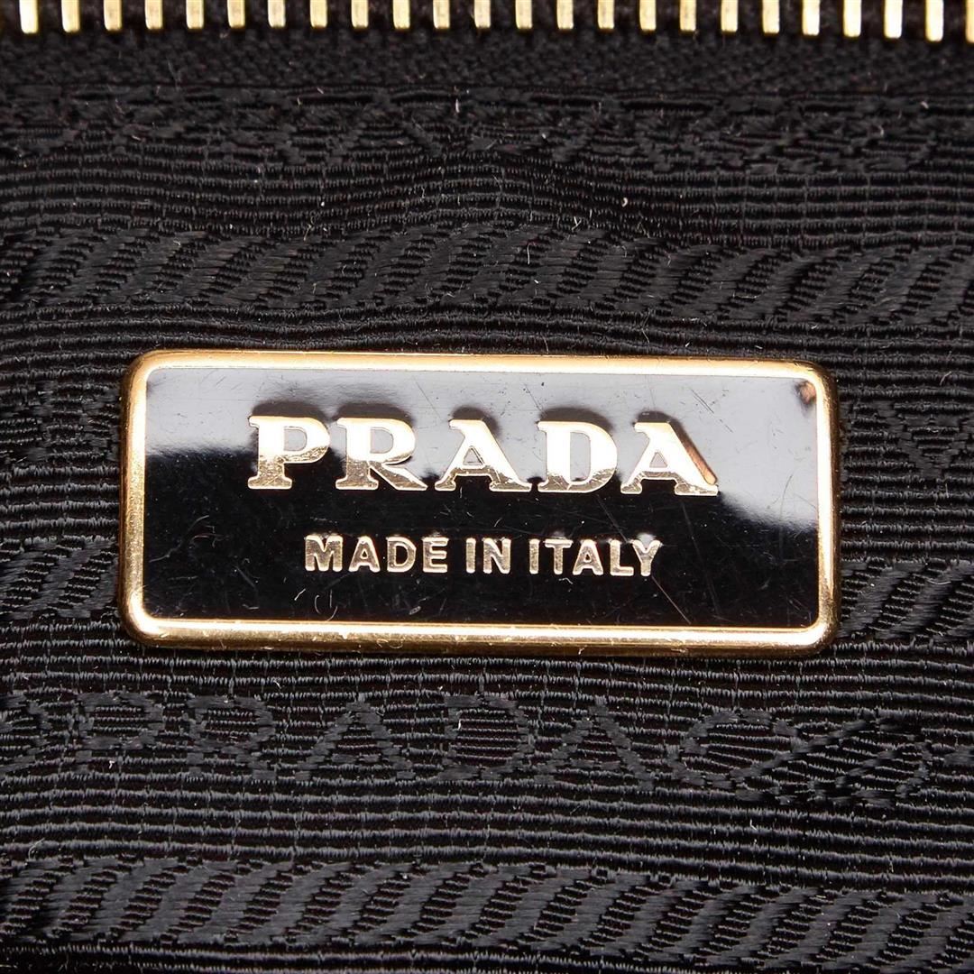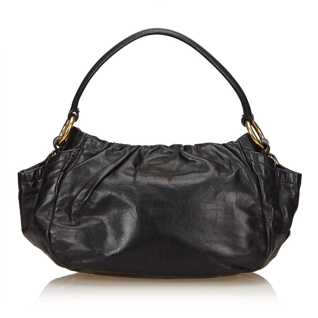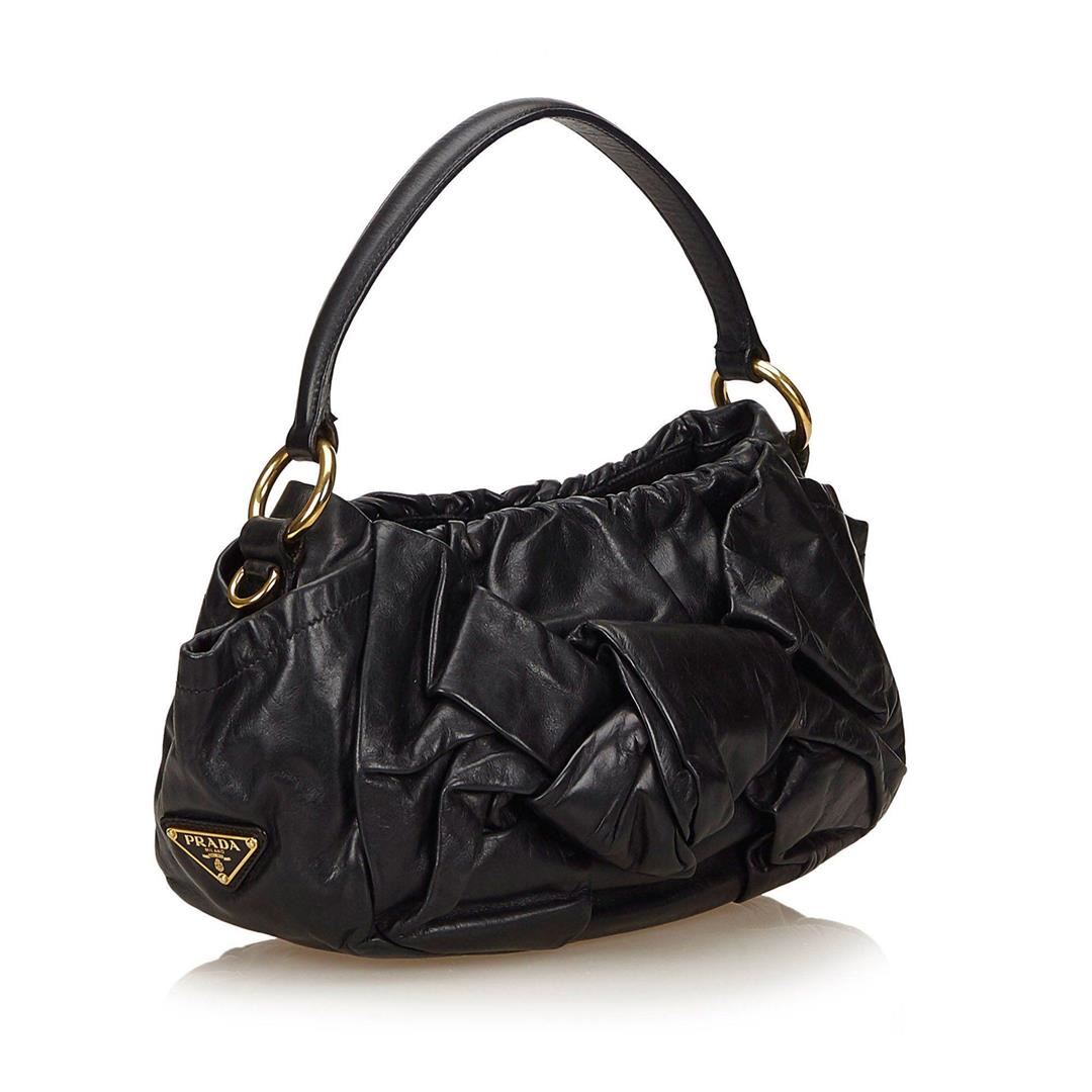 Prada handbag leather body, flat leather handle, top magnetic closure, and interior zip pocket.