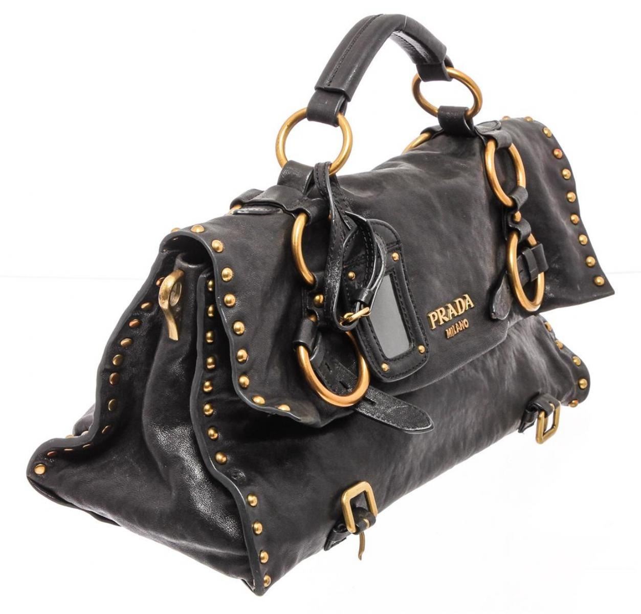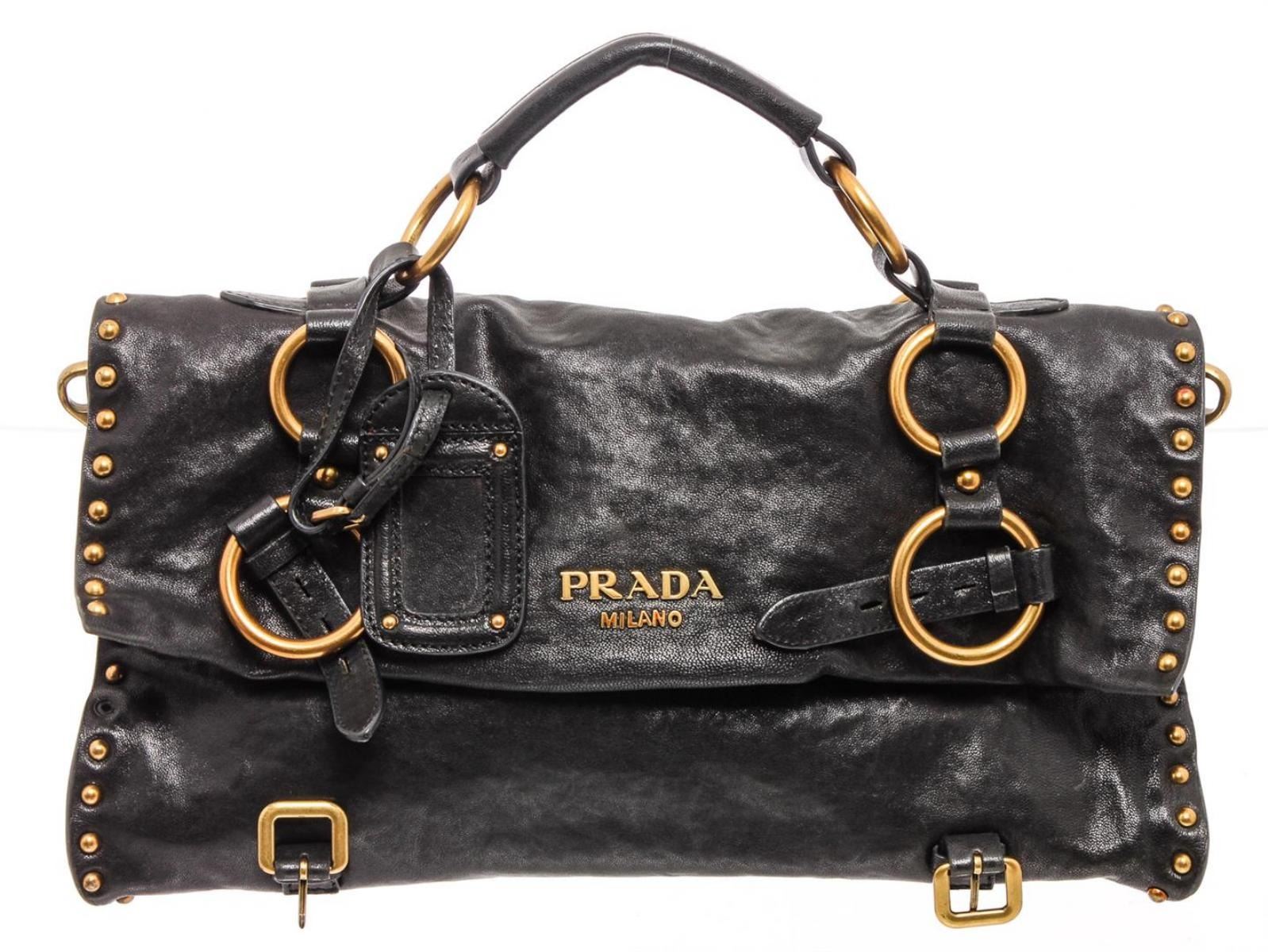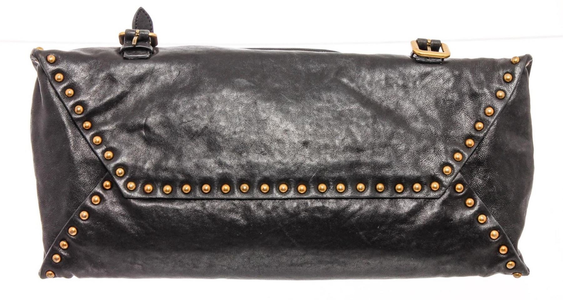 Prada black leather, gold-tone hardware with studs, snap closure flap at fronnt, and detachable shoulder strap. Inner brown leather lining, and one zip pocket at wall.