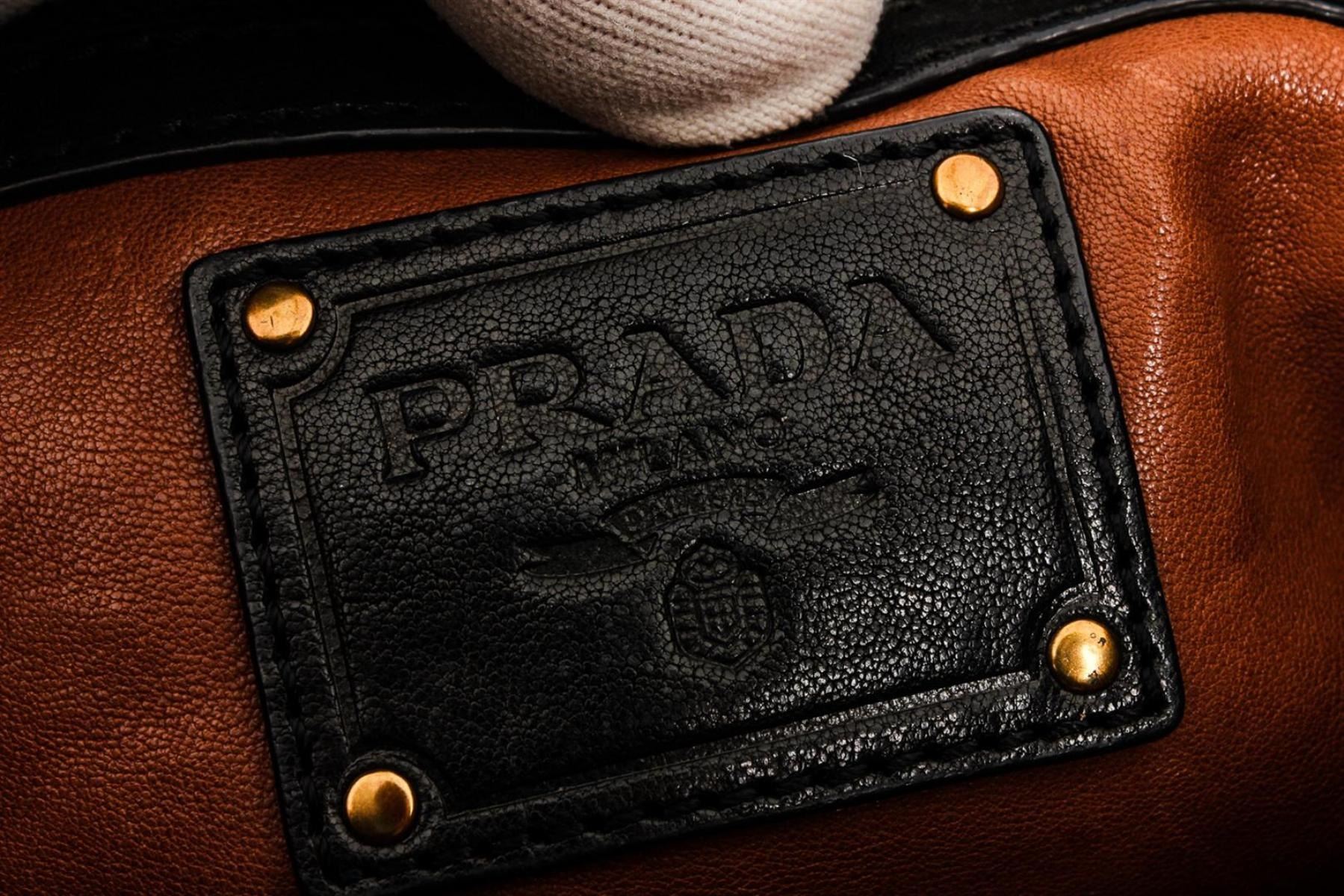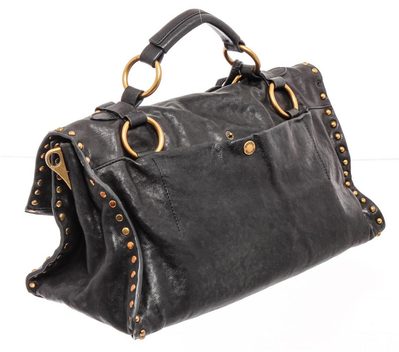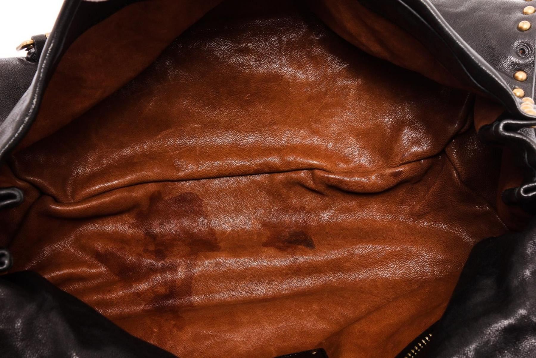 Prada black leather, gold-tone hardware with studs, snap closure flap at fronnt, and detachable shoulder strap. Inner brown leather lining, and one zip pocket at wall.