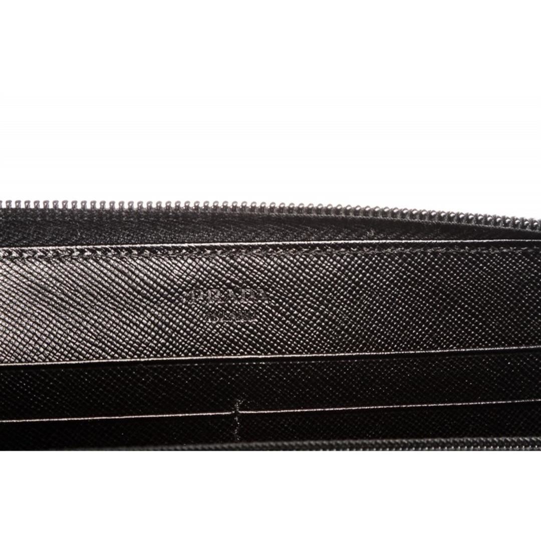 Black Prada nylon leather zipper wallet with black leather lined interior, two side slip pockets, eight card slots, two large open compartments and one large zipper pocket. Item is pre-owned.