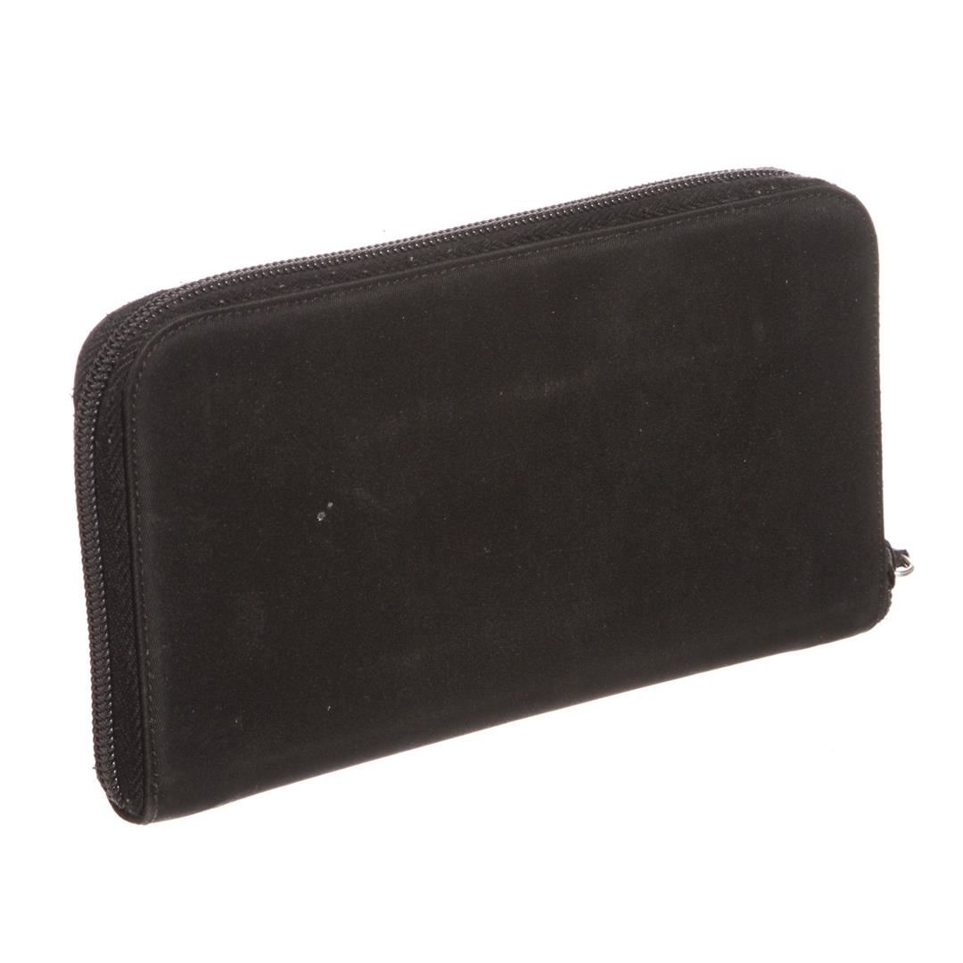 Black Prada nylon leather zipper wallet with black leather lined interior, two side slip pockets, eight card slots, two large open compartments and one large zipper pocket.