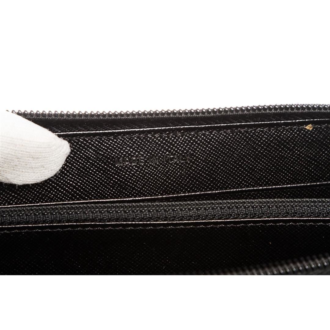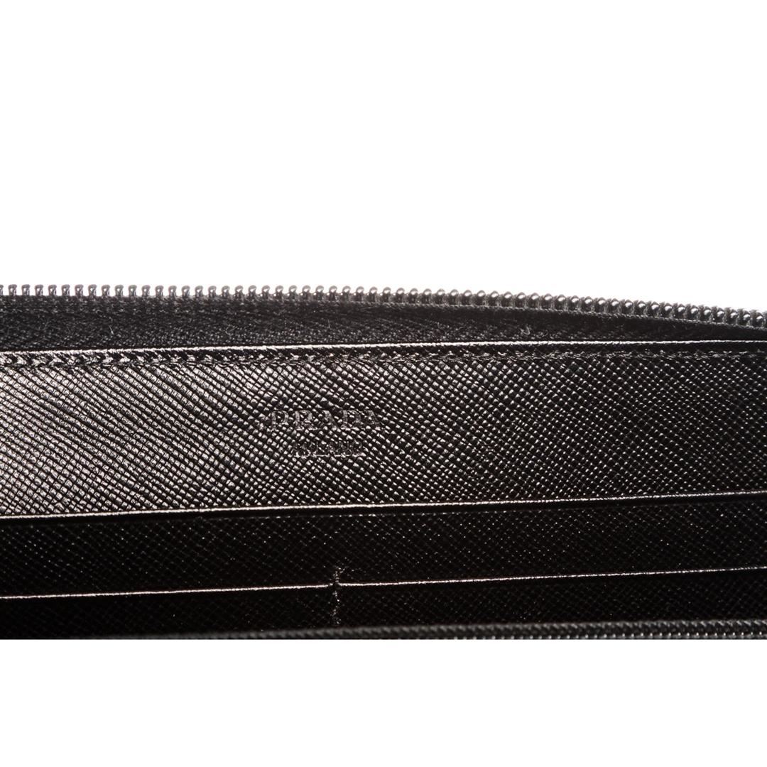 Black Prada nylon leather zipper wallet with black leather lined interior, two side slip pockets, eight card slots, two large open compartments and one large zipper pocket.