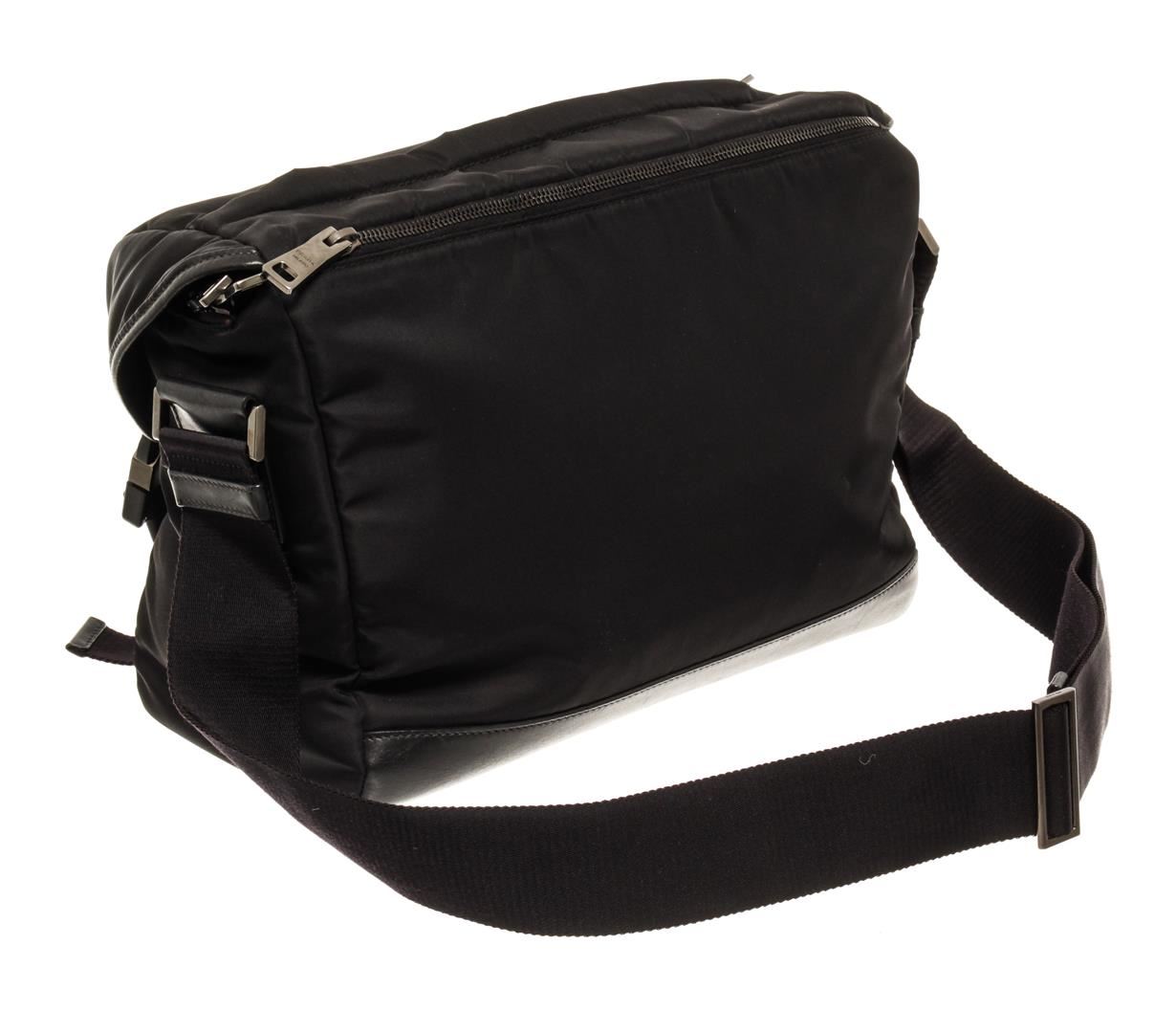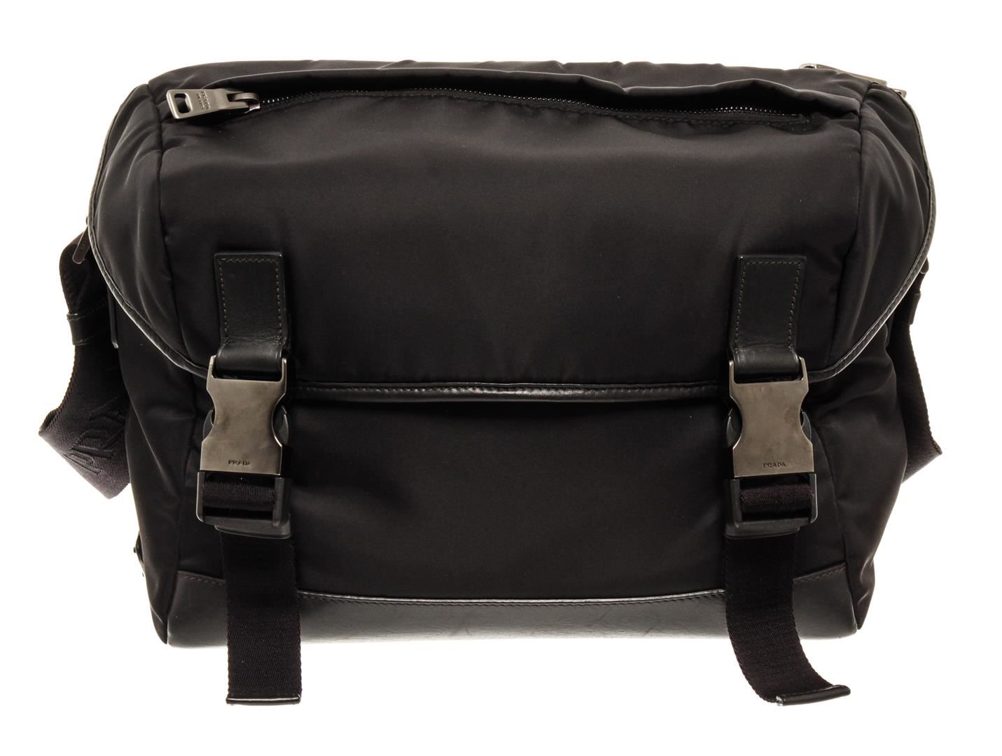 One Prada Black Tessuto Double Buckle Flap Bag. Item is sold AS-IS. All available information is listed in the description and shown in the photo. Prada Black Nylon Tessuto Double Buckle Flap Bag with silver tone hardware, black leather trim, black nylon lining, outer zipper pocket, one zipped pocket, and buckle closures.