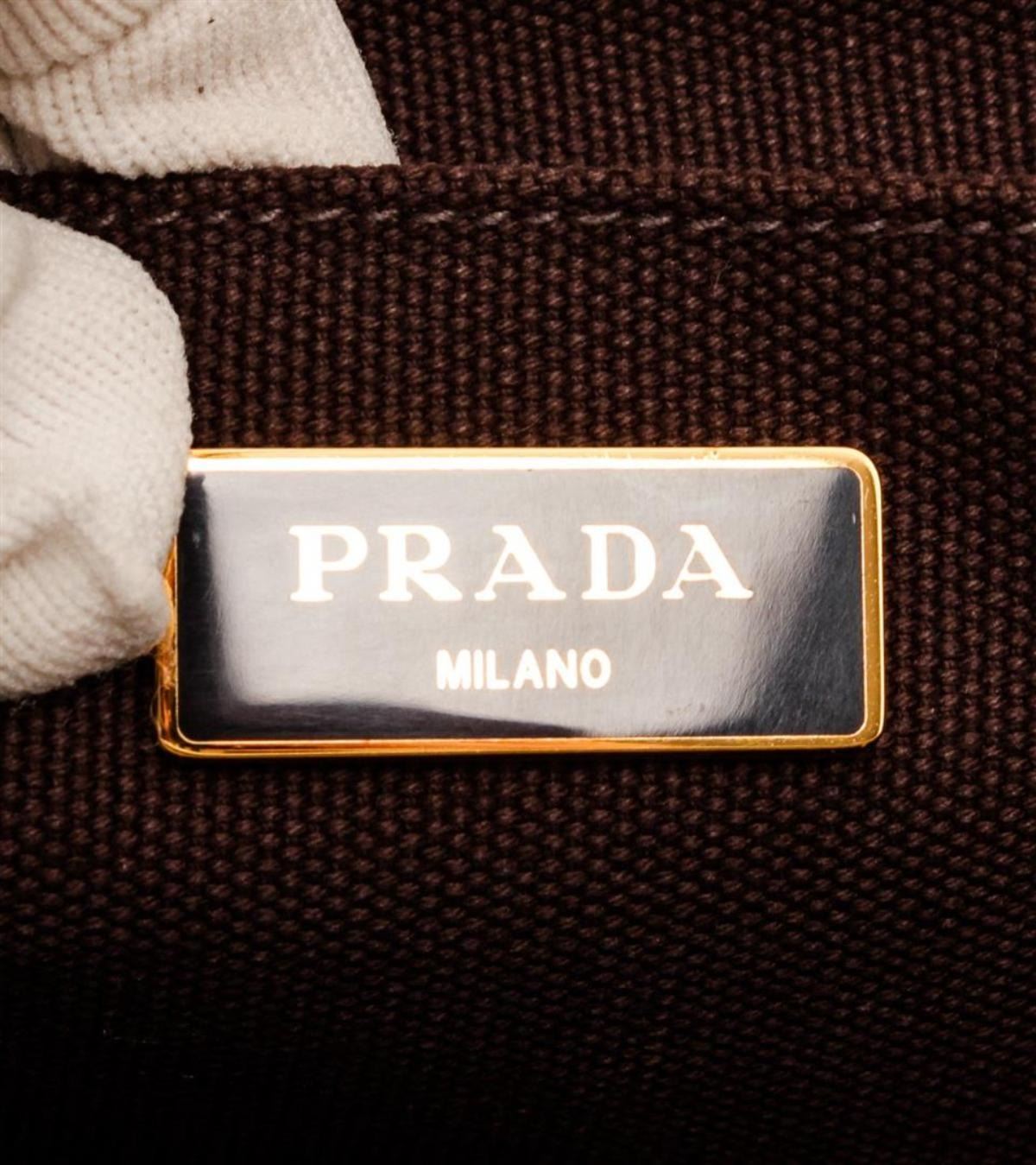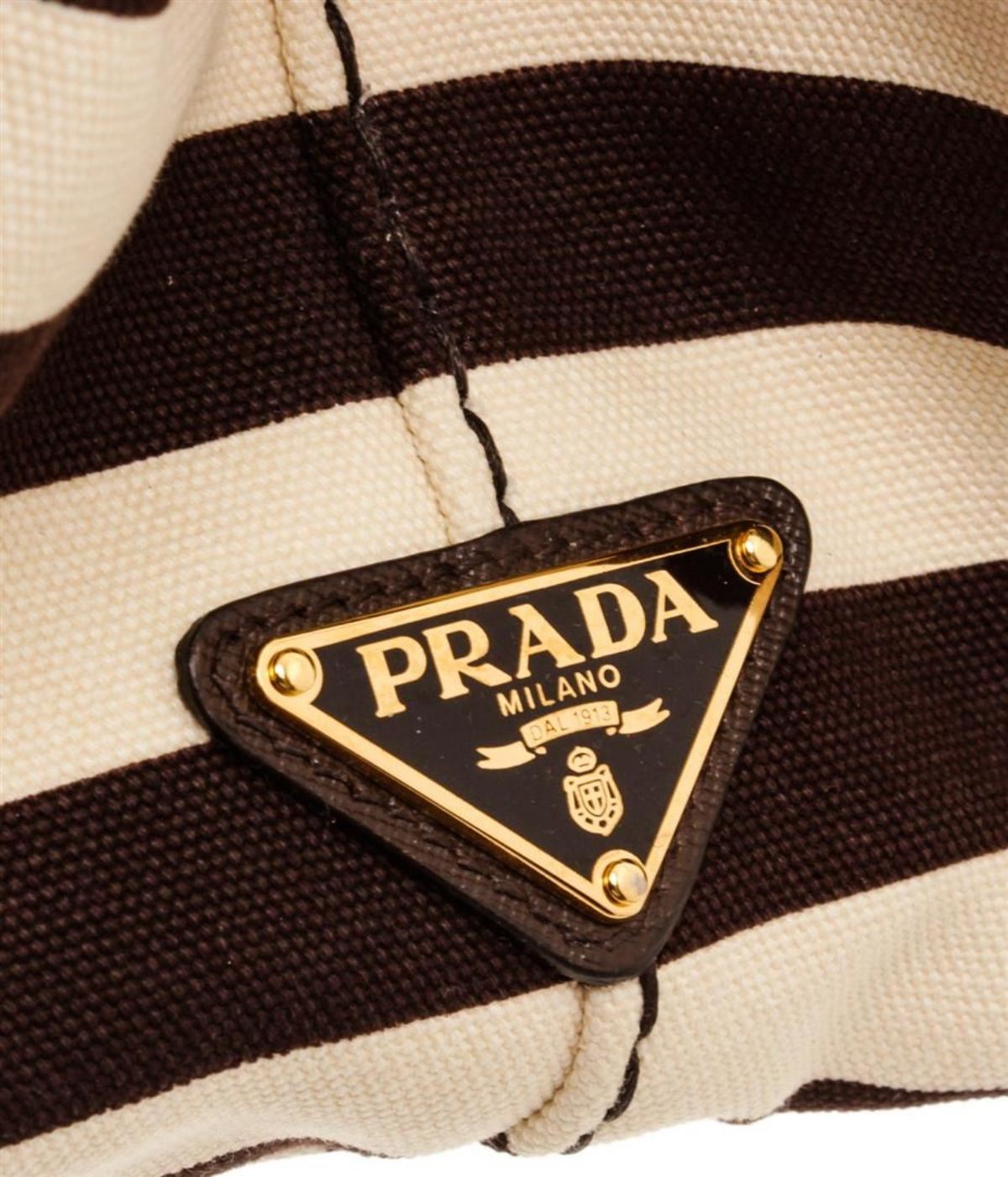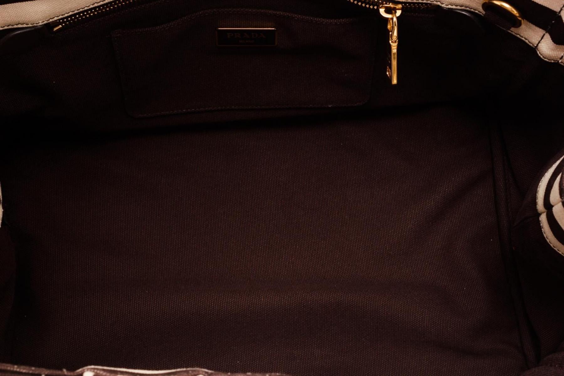 Black & white Canapa Prada Shopping tote with gold-tone hardware, dual rolled top handles, logo print at front, protective feet at base, navy blue canvas interior, dual interior pockets with zip closures. Adjustable removable shoulder strap is included.