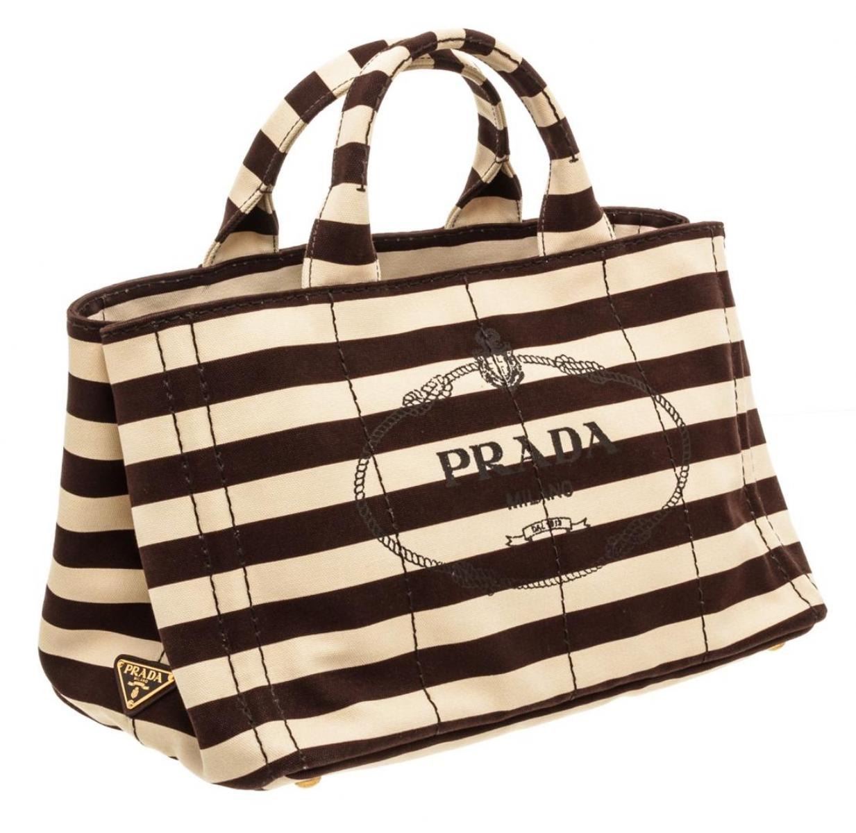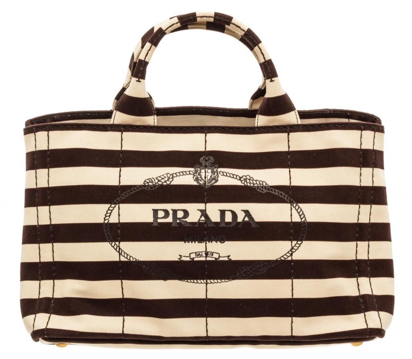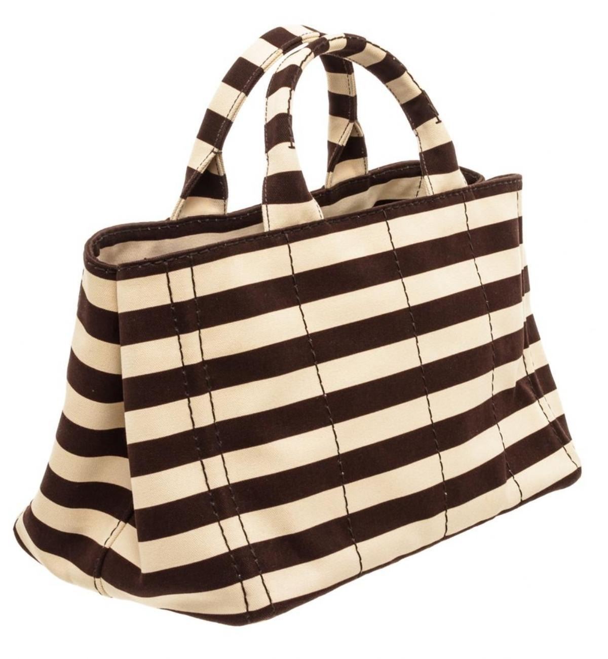 Black & white Canapa Prada Shopping tote with gold-tone hardware, dual rolled top handles, logo print at front, protective feet at base, navy blue canvas interior, dual interior pockets with zip closures. Adjustable removable shoulder strap is included.