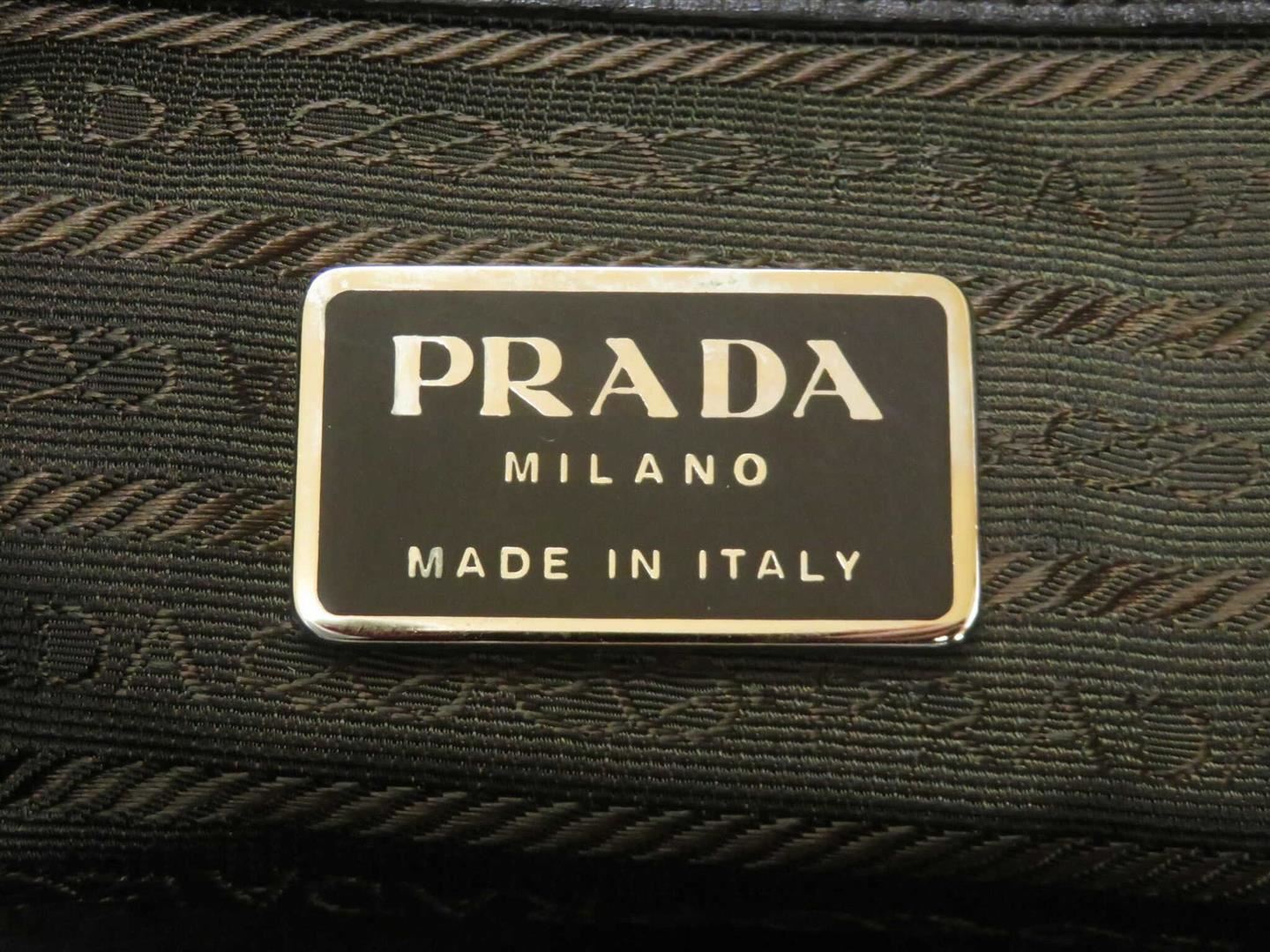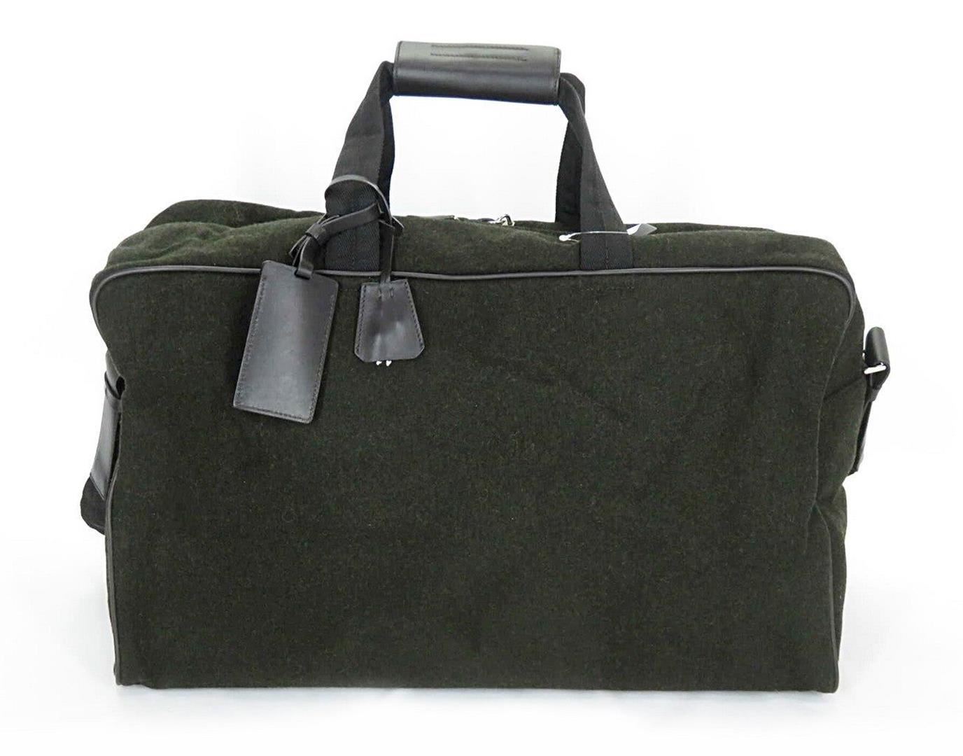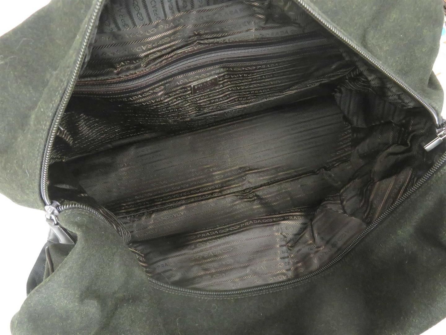 Black wool Prada boston bag with silver-tone hardware, dual flat handles, black woven lining, long strap, pochette, padlock, and tag, with single zip pocket at interior wall, and zip closure at top.