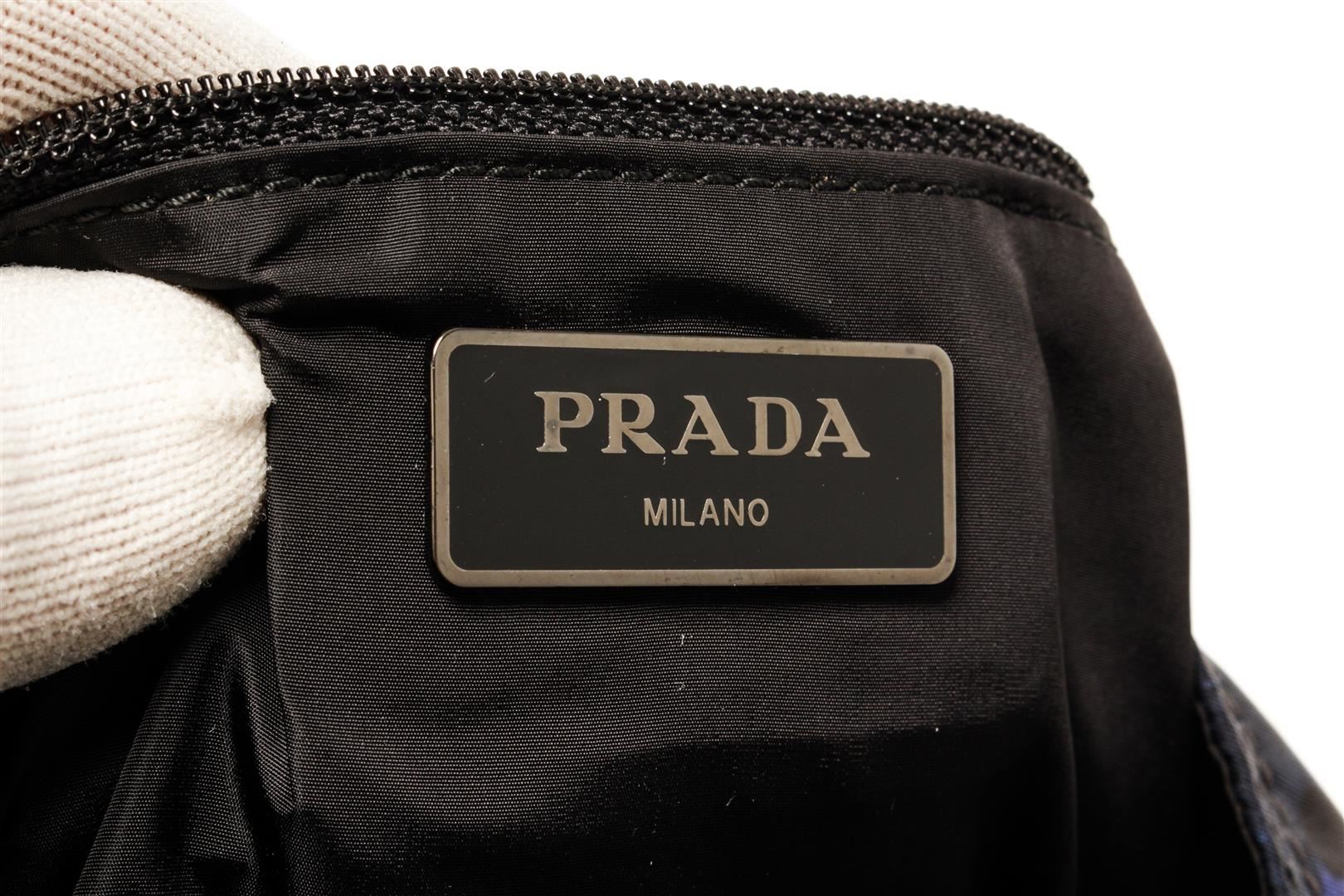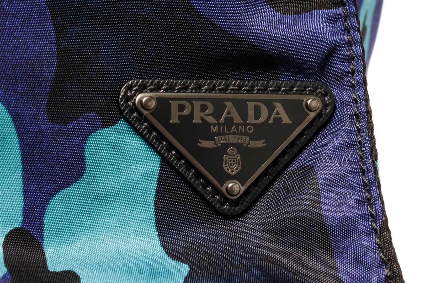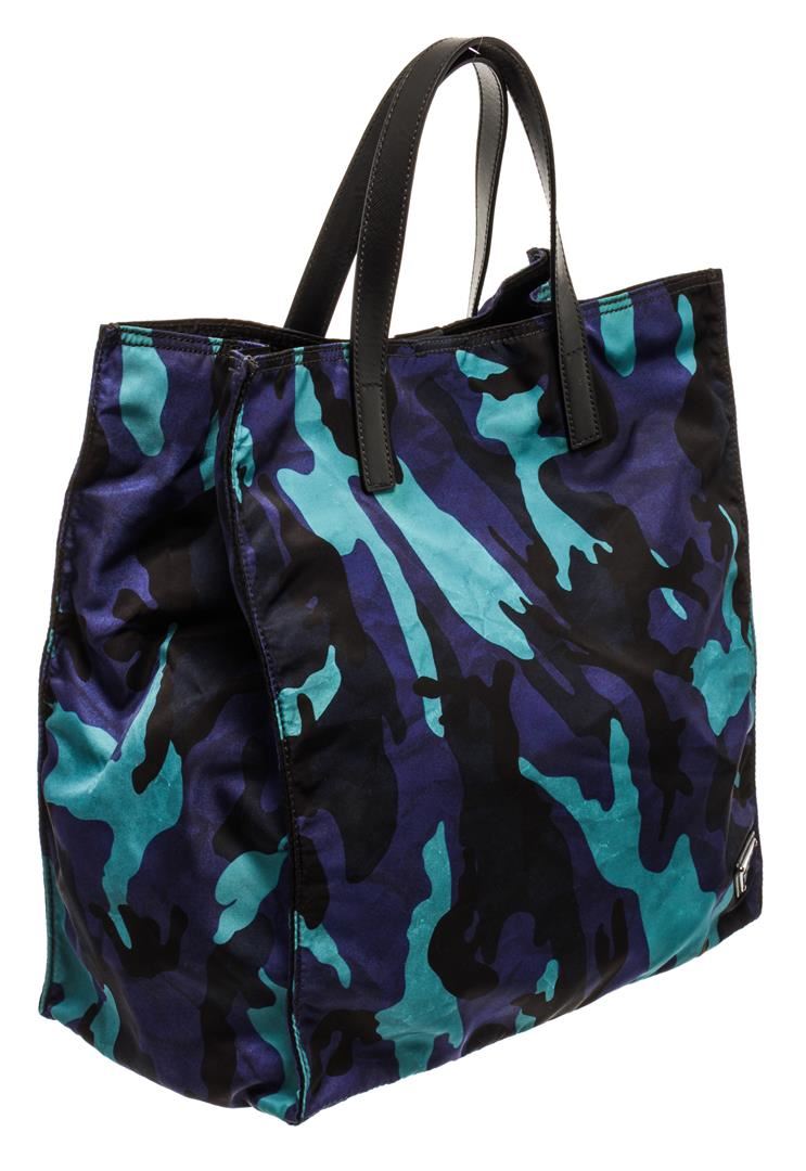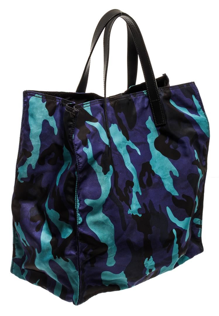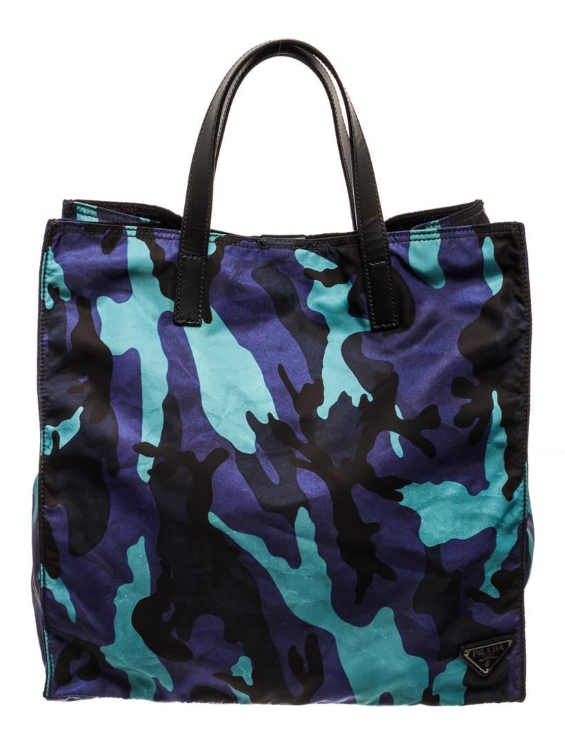 One Prada Blue Camo Nylon Tote Bag. Item is sold AS-IS. All available information is listed in the description and shown in the photo. Prada blue camo nylon tote bag with top handles, snap button closure, black nylon lining, and one interior zip pocket.