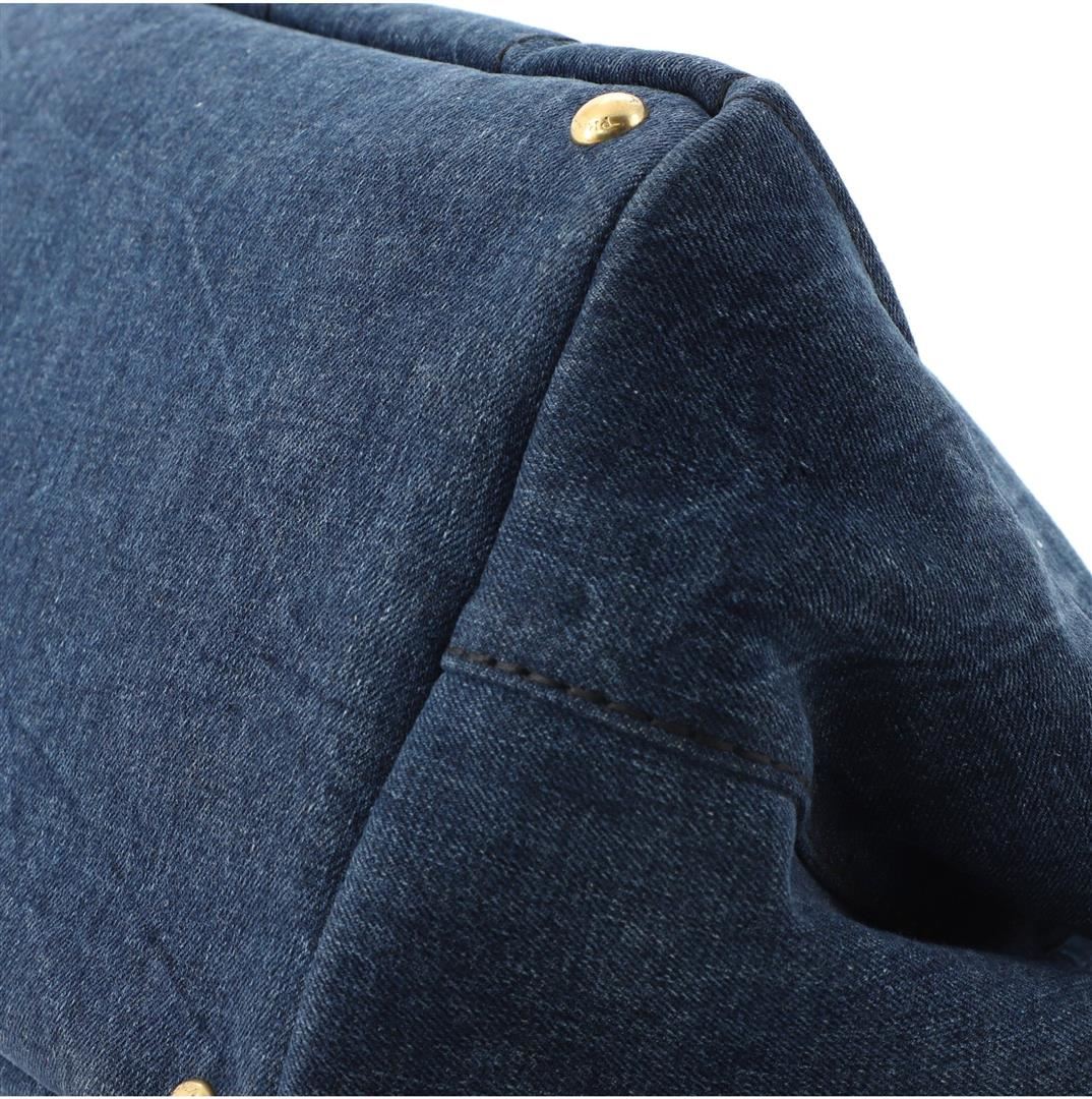 Prada Canapa Convertible Tote Denim Medium is crafted in blue denim and canvas, features dual top handles, side snap buttons, protective base studs, and gold-tone hardware. It opens to a blue denim and canvas interior with side zip and slip pockets.