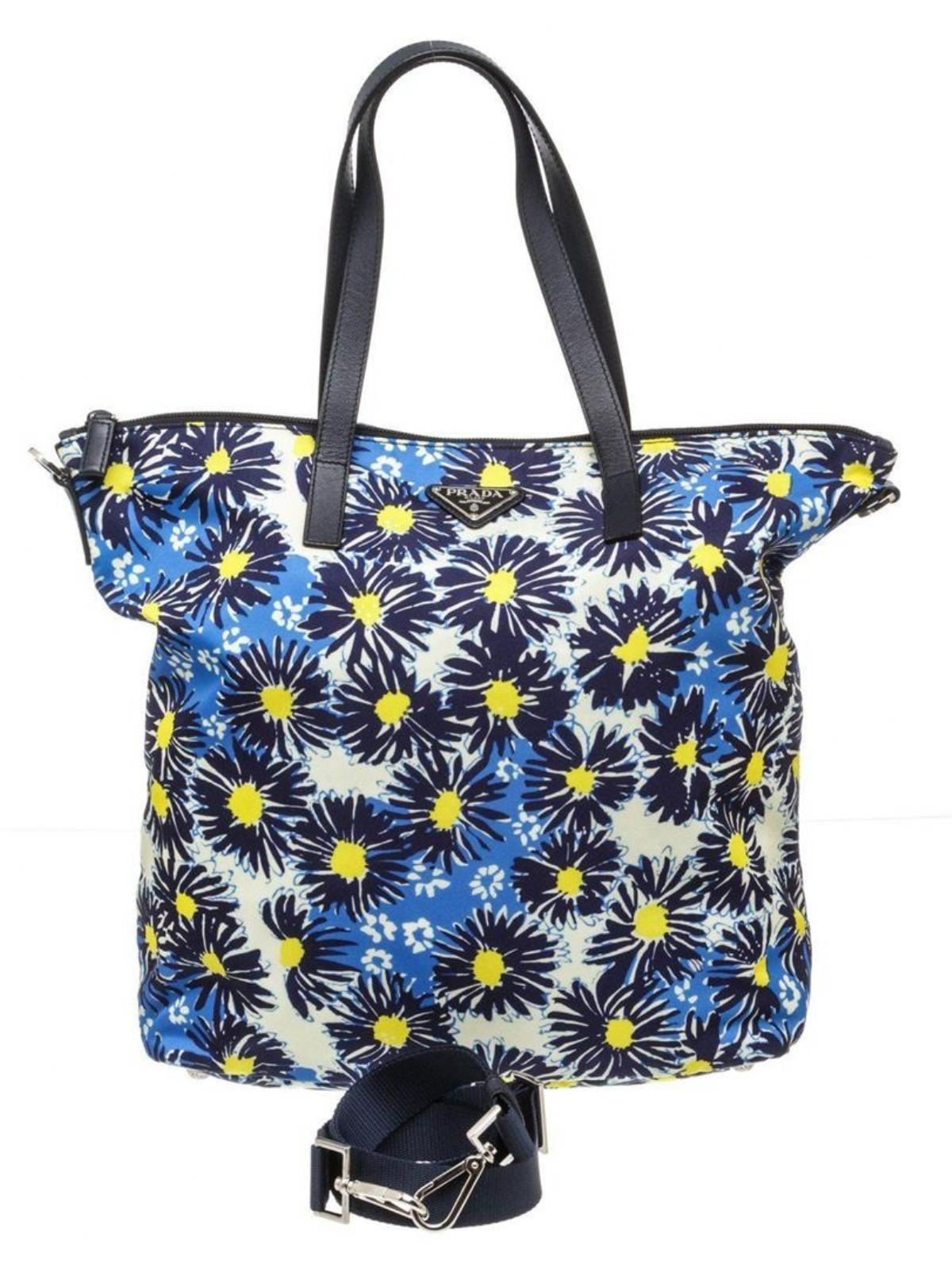 Prada Blue Multicolor Tessuto Nylon Stampato Tote Bag. Blue and multicolor Tessuto nylon Prada Stampato tote with silver-tone hardware, dark slate Saffiano leather trim, single flat optional canvas shoulder strap, dual flat top handles, floral motif throu
