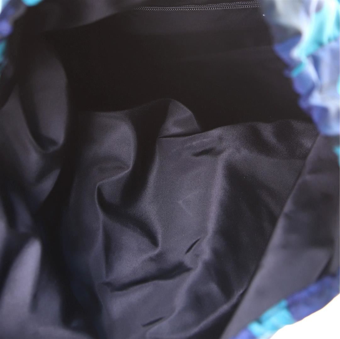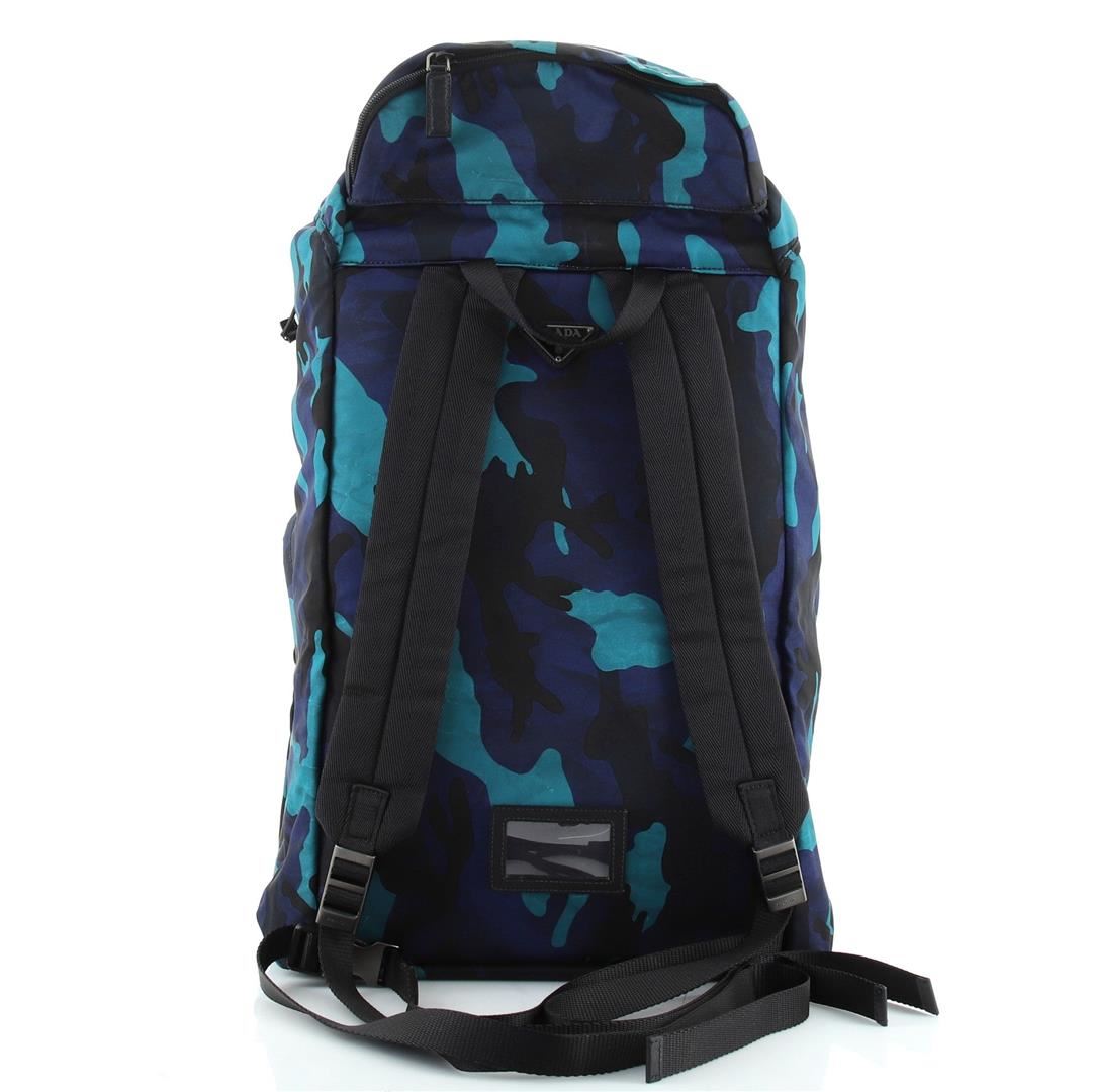 Prada Blue Printed Tessuto Double Front Pocket Large Backpack features blue multicolor camouflage Tessuto nylon, double front pocket with zippers, black nylon top handle, two black padded shoulder strap that can be adjusted and silver-tone hardware.