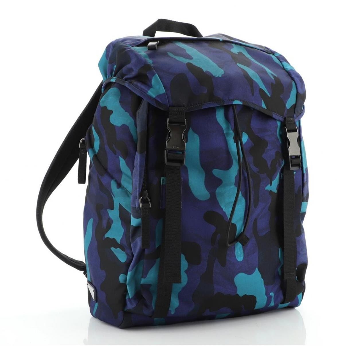 Prada Large Backpack features blue multicolor camouflage Tessuto nylon, black nylon top handle, two black padded shoulder strap that can be adjusted, silver-tone hardware, drawstring closure for the main compartment with flap on top completed with double