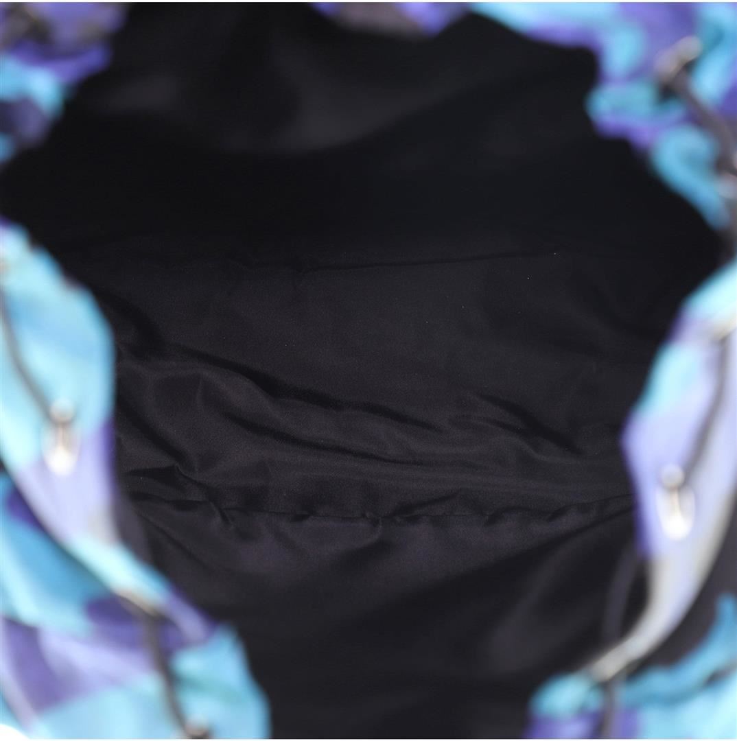 Prada Large Backpack features blue multicolor camouflage Tessuto nylon, black nylon top handle, two black padded shoulder strap that can be adjusted, silver-tone hardware, drawstring closure for the main compartment with flap on top completed with double
