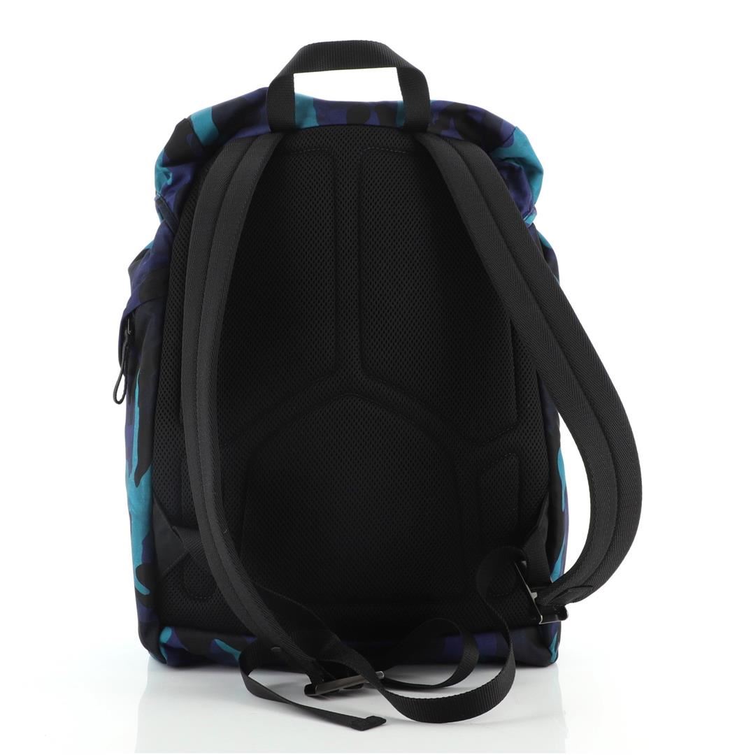 Prada Large Backpack features blue multicolor camouflage Tessuto nylon, black nylon top handle, two black padded shoulder strap that can be adjusted, silver-tone hardware, drawstring closure for the main compartment with flap on top completed with double buckles and black canvas lining.