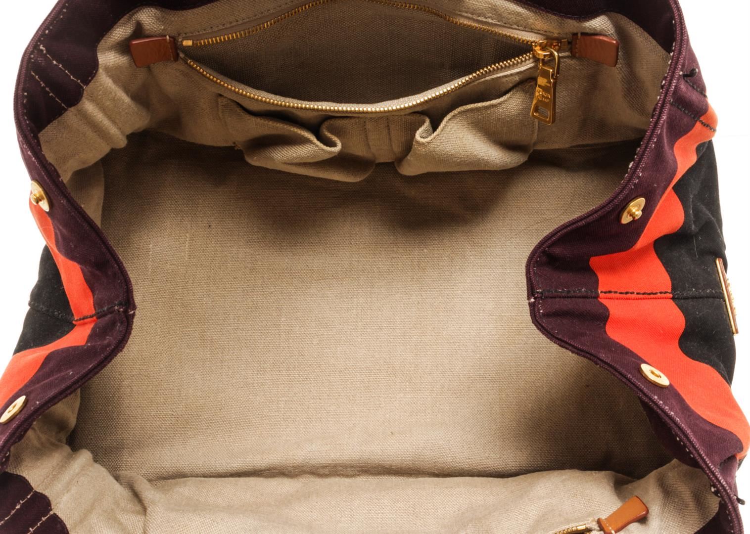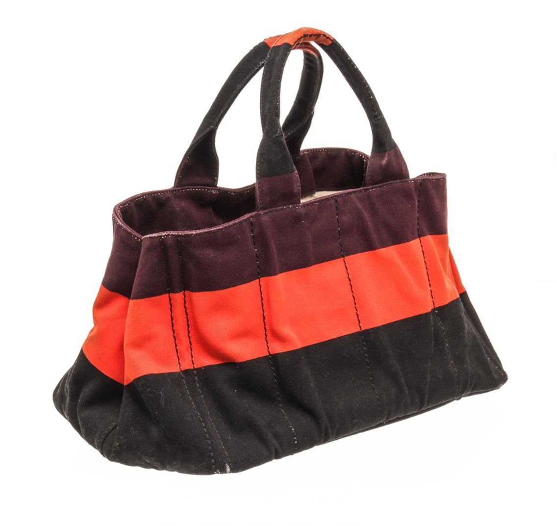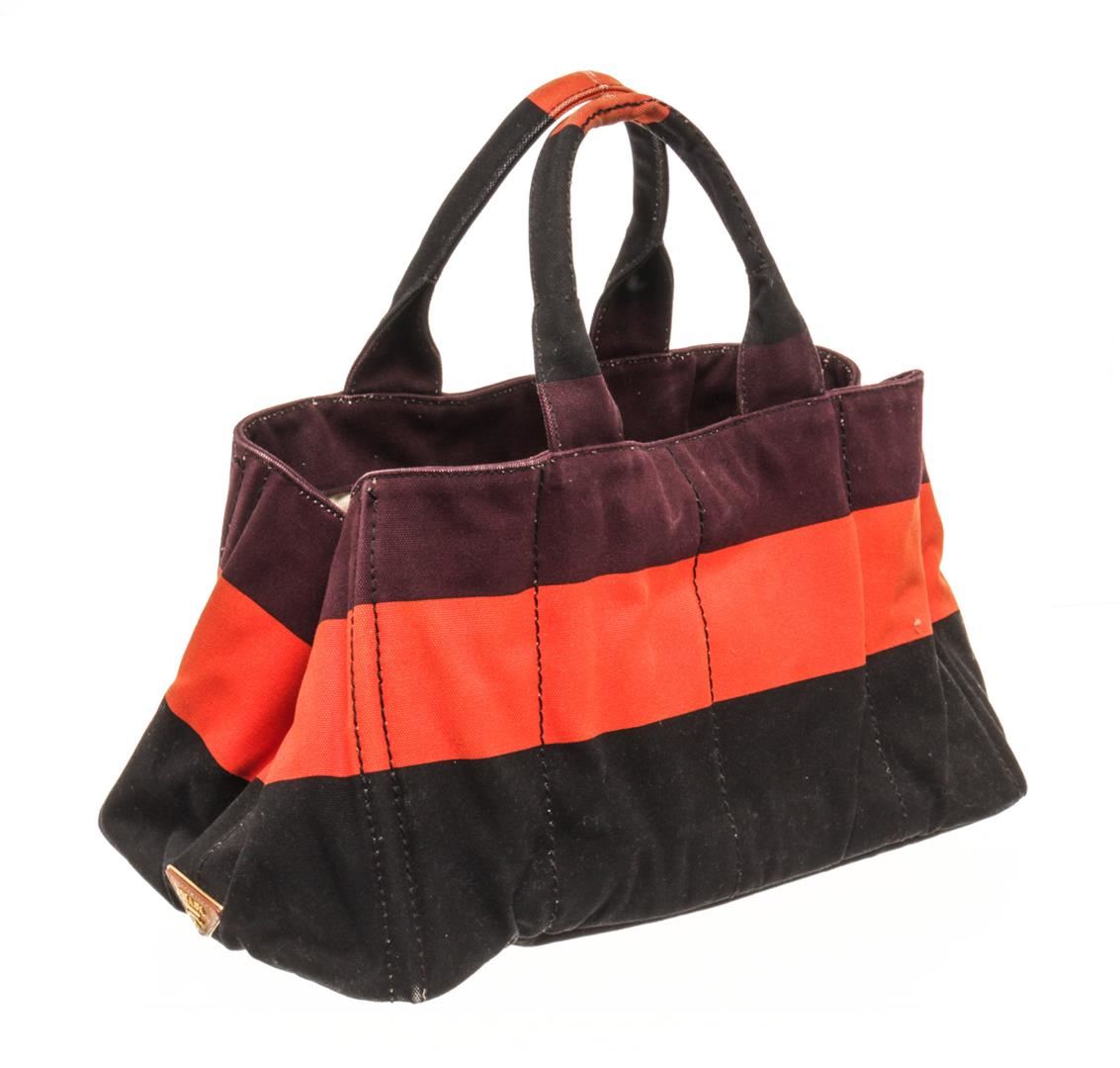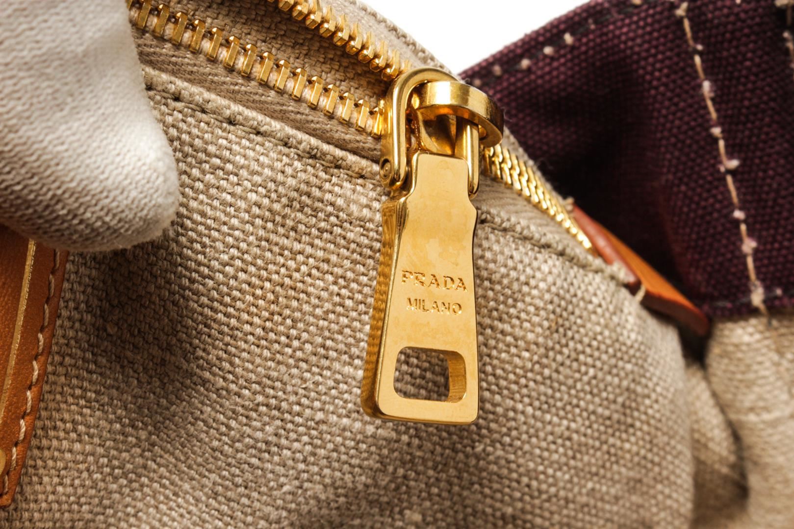 One Prada Bordeaux Canvas Canapa Tote Bag. Item is sold AS-IS. All available information is listed in the description and shown in the photo. Prada Bordeaux Canvas Canapa Tote Bag with top handle, multi color, canvas lining, interior zipper pocket, two interior slip pockets, gold tone hardware. Height: 10" Width: 10" Depth: 17", Handle Drop: / 25.4 x 25.4 x 43.18 Cm