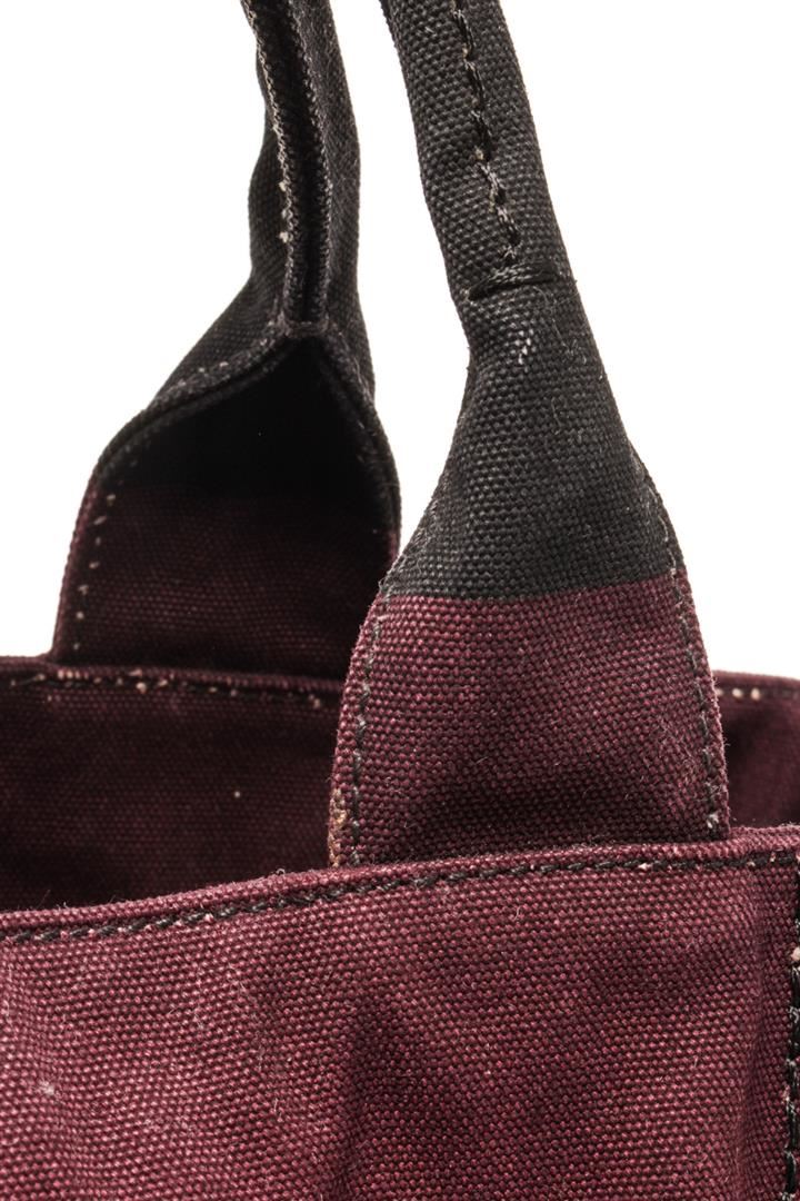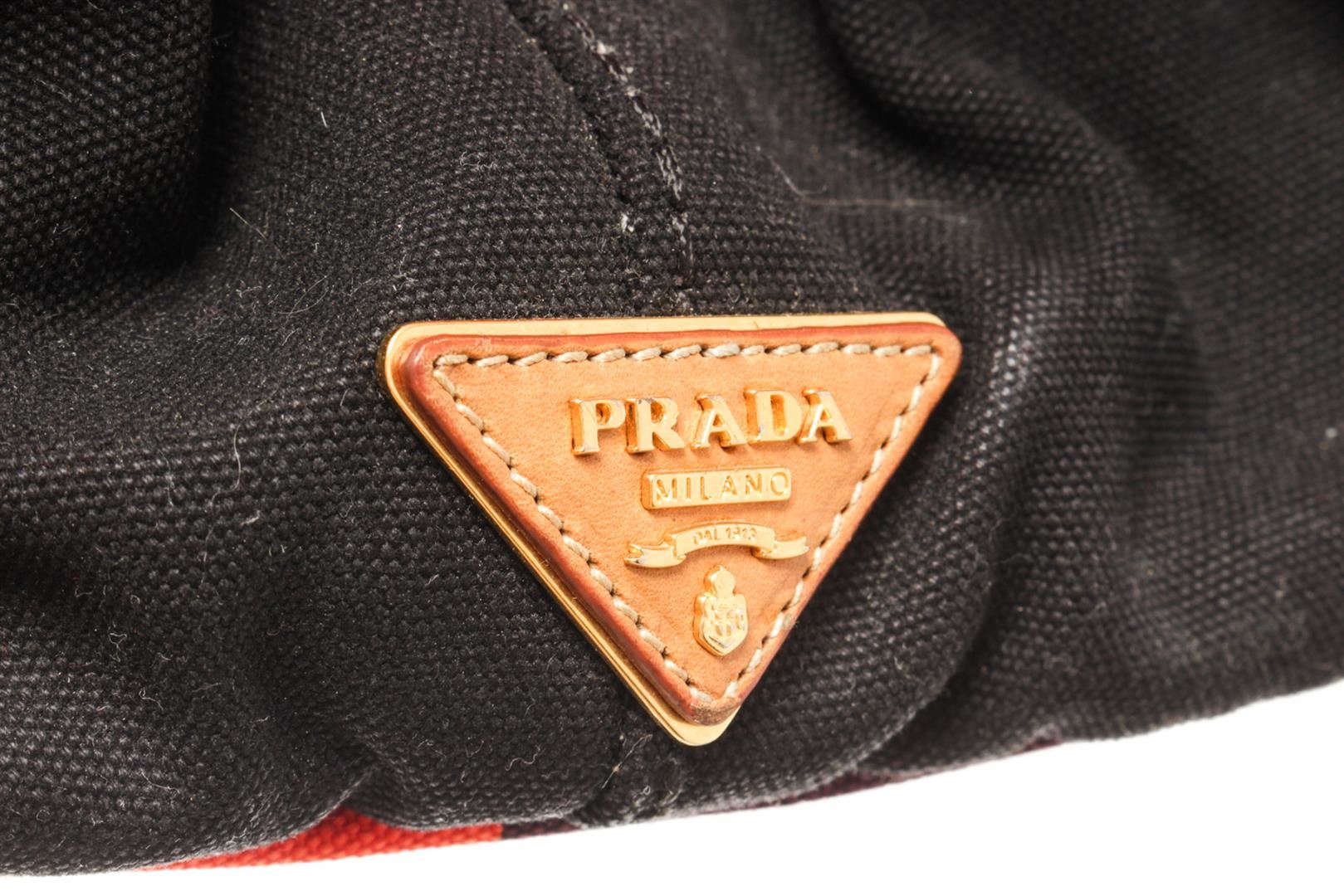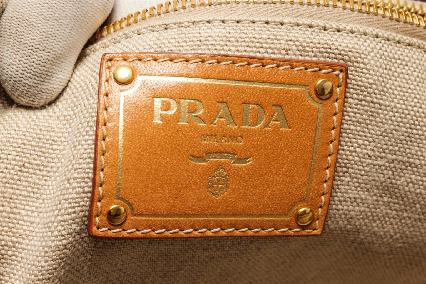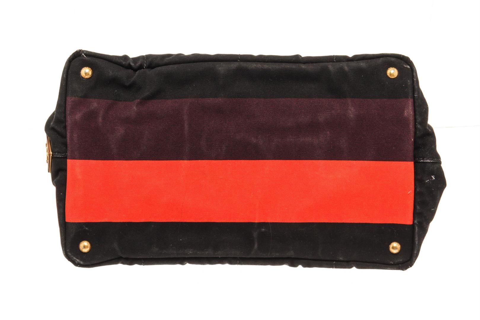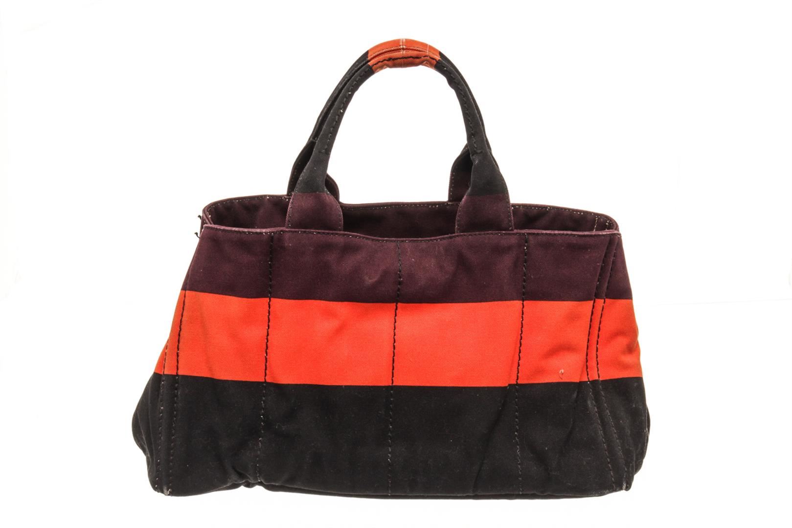 One Prada Bordeaux Canvas Canapa Tote Bag. Item is sold AS-IS. All available information is listed in the description and shown in the photo. Prada Bordeaux Canvas Canapa Tote Bag with top handle, multi color, canvas lining, interior zipper pocket, two interior slip pockets, gold tone hardware. Height: 10" Width: 10" Depth: 17", Handle Drop: / 25.4 x 25.4 x 43.18 Cm