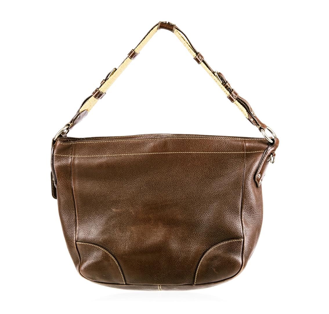 One Prada brown leather bag with an attached strap ID card holder. The bag features a zippered inner pouch and is in good overall condition.