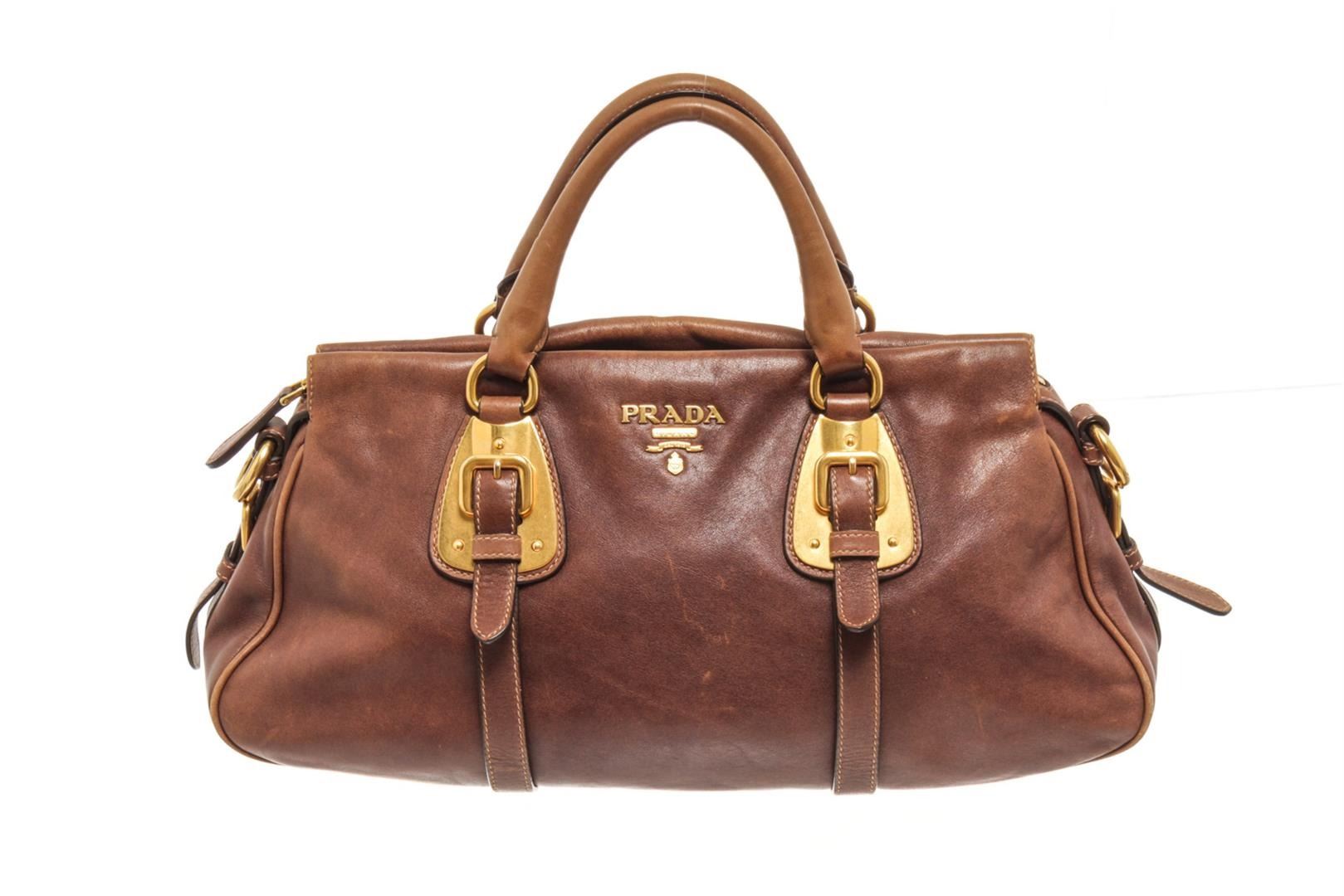 One Prada Brown Leather 2 Way Bag. Item is sold AS-IS. All available information is listed in the description and shown in the photo. Prada Brown Leather 2 Way Bag with top handle, suede lining, gold tone hardware, interior slip pockets, zip closure. There are pen markings on the suede lining. Please refer to photos.