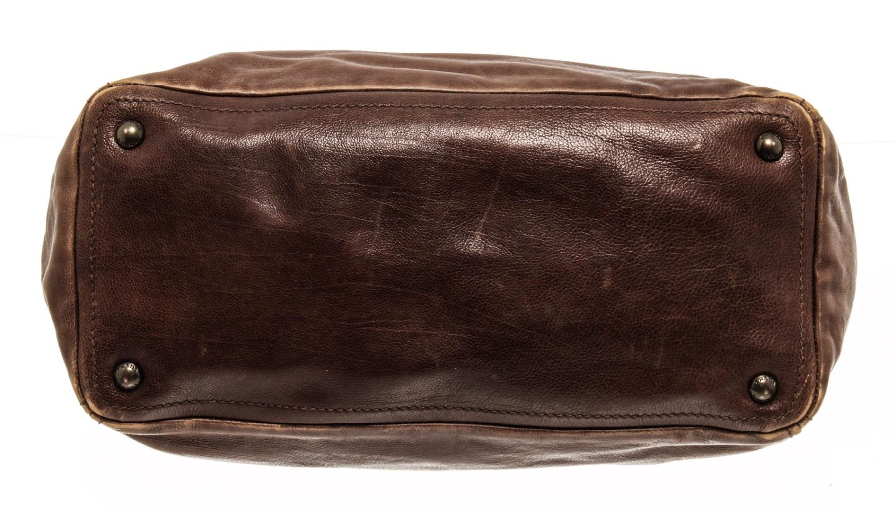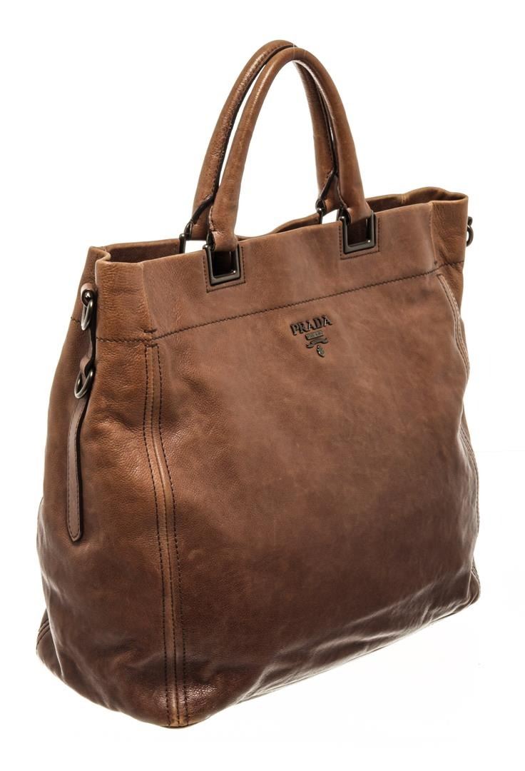 One Prada Brown Leather 2 Way Shoulder Bag. Item is sold AS-IS. All available information is listed in the description and shown in the photo. prada brown leather 2 way shoulder bag with leather body, rolled leather top handles, a detachable flat leather strap, an open top with magnetic button closure, and an interior zip and slip pockets.