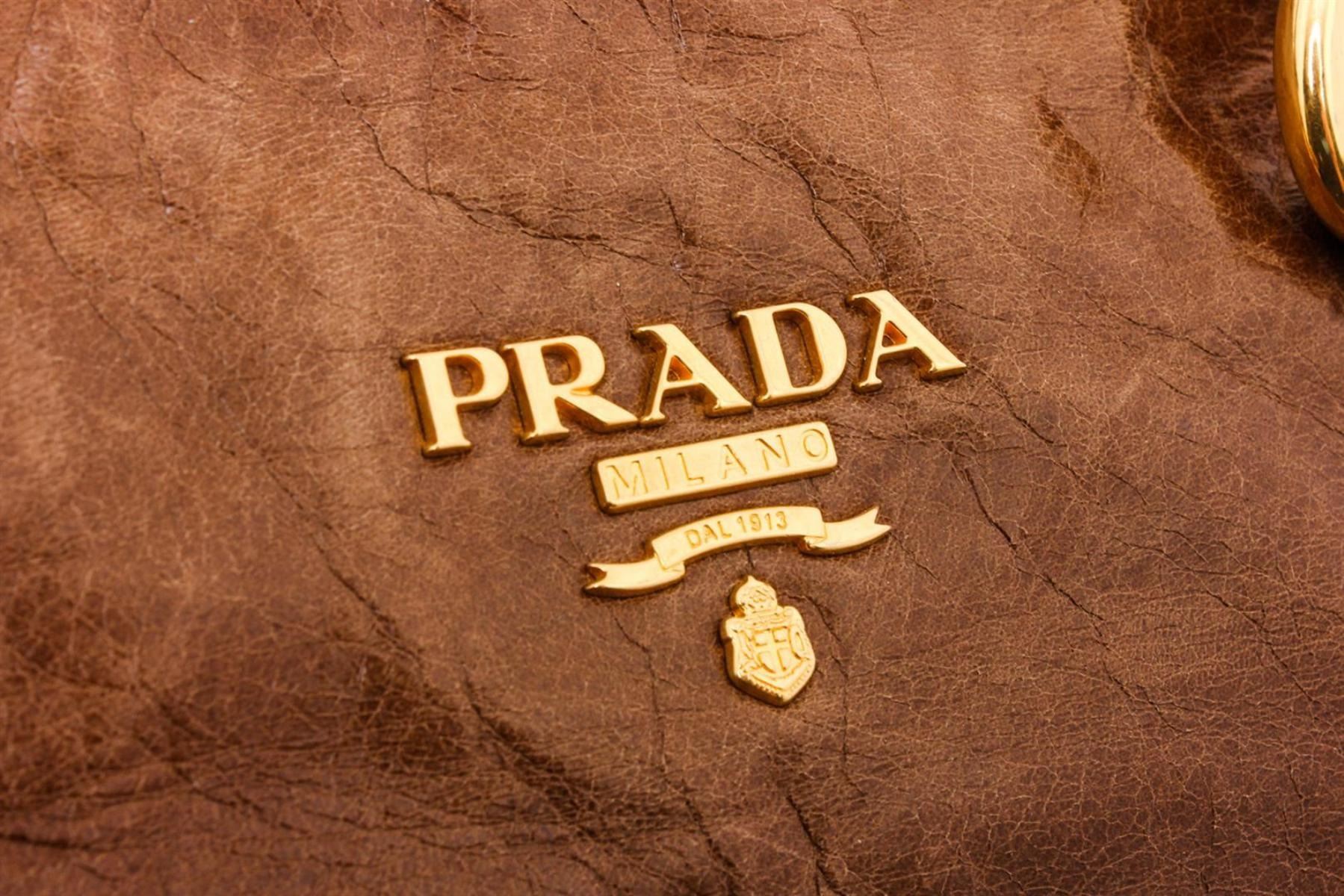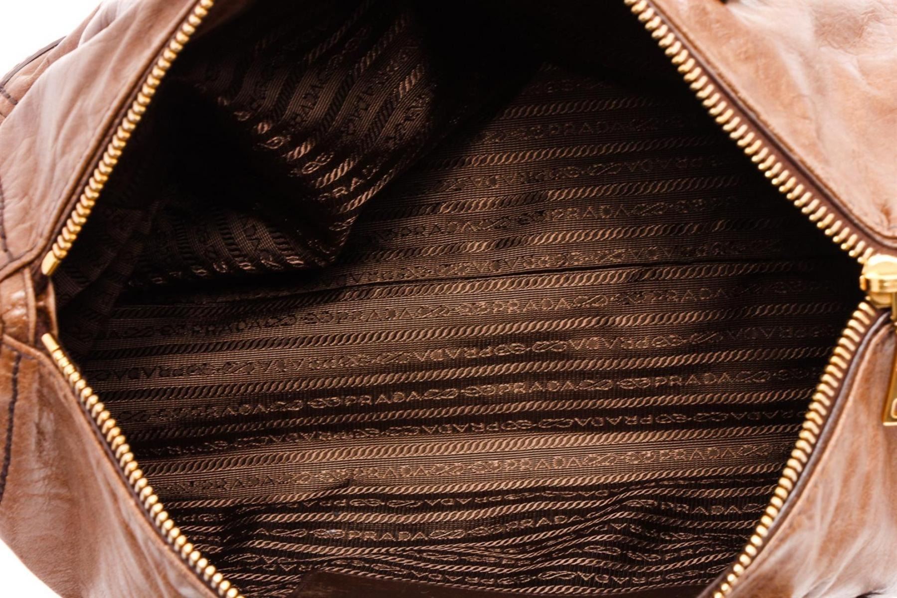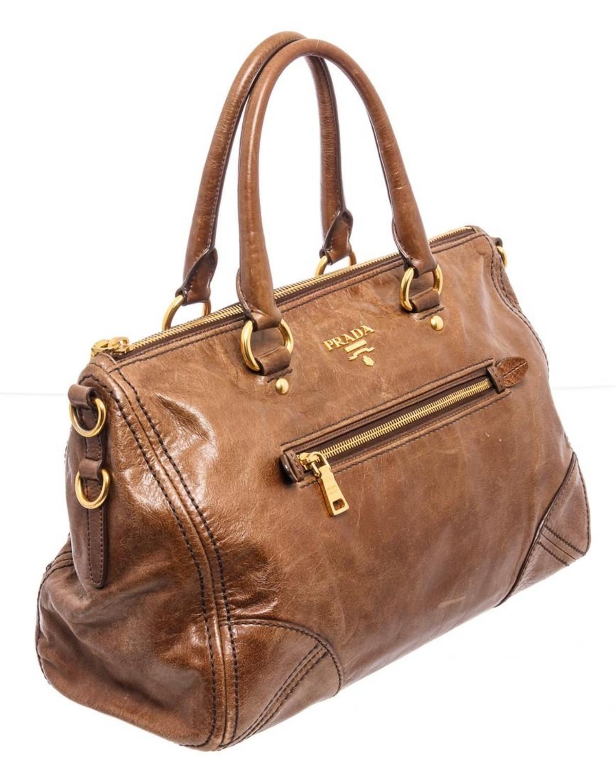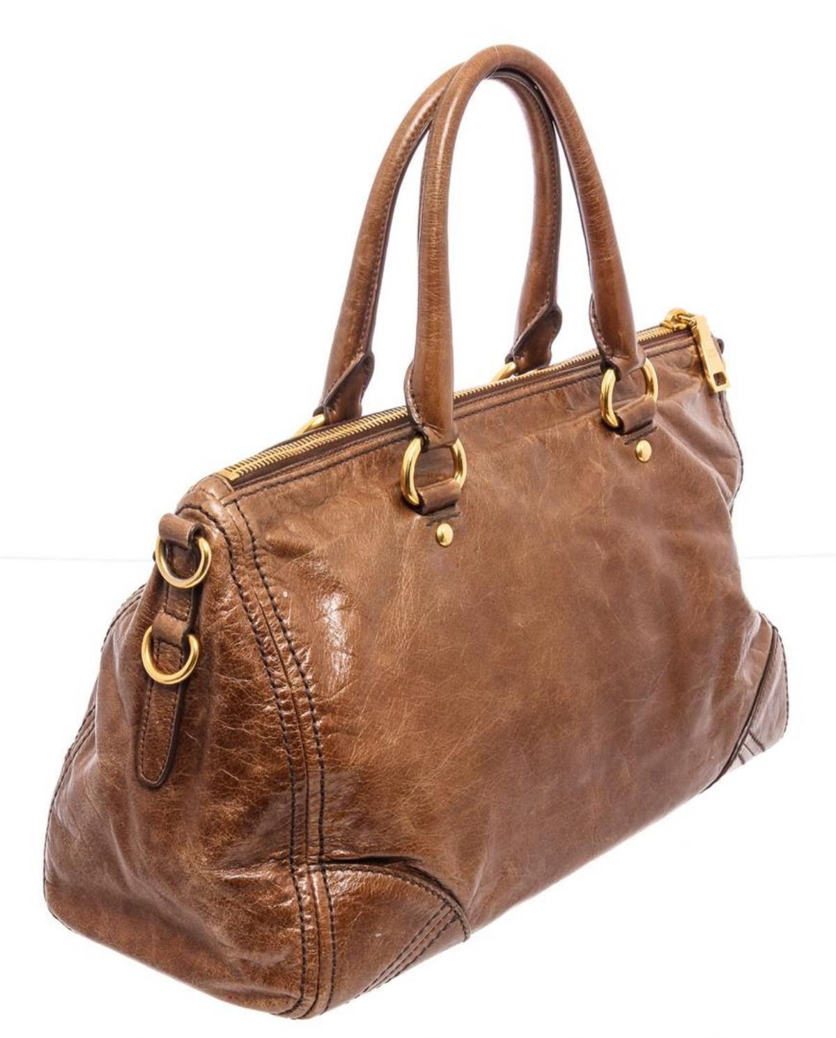 Prada brown leather Vitello Daino medium shoulder bag with gold-tone hardware, optional detachable leather shoulder strap,dual rolled top handles, brown canvas lining, two interior pockets; one with zip closure and overall magnetic snap closure at top.