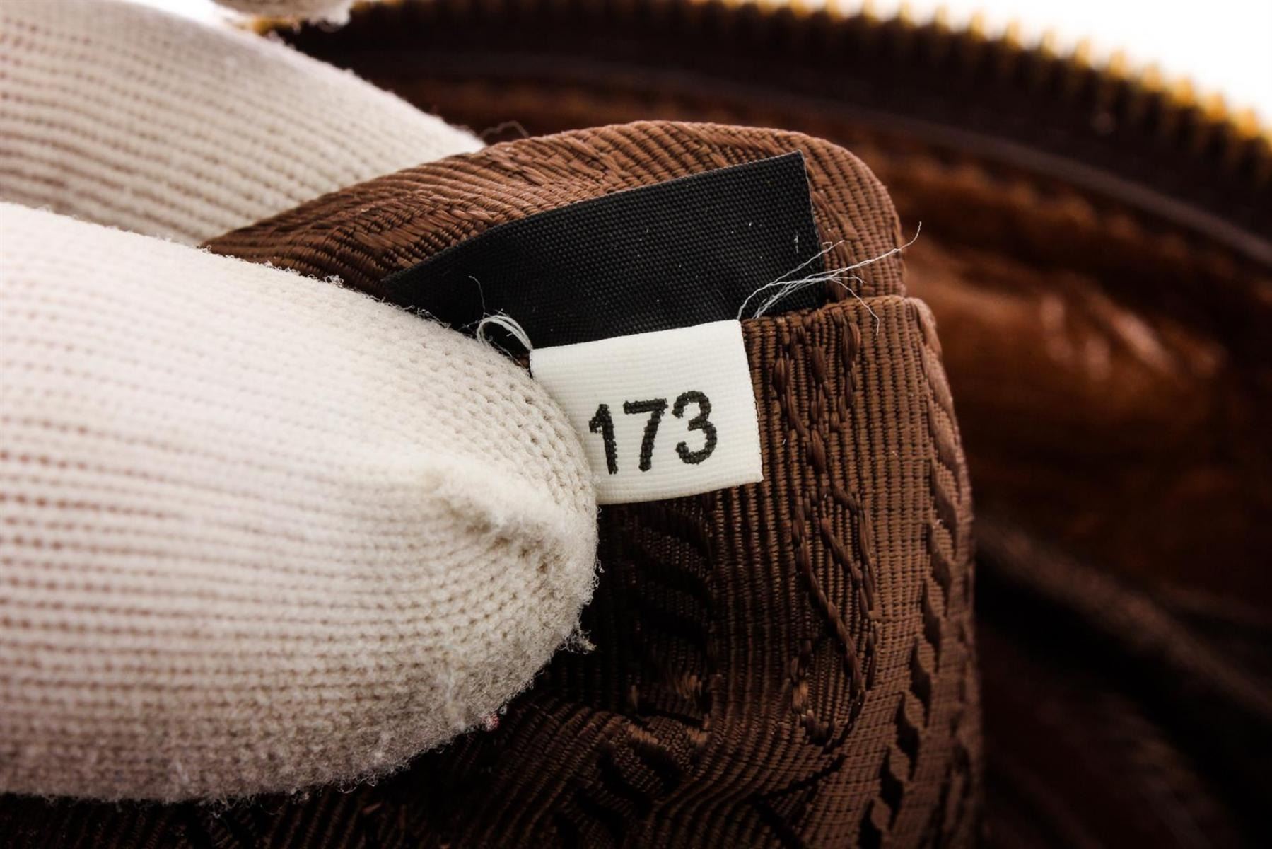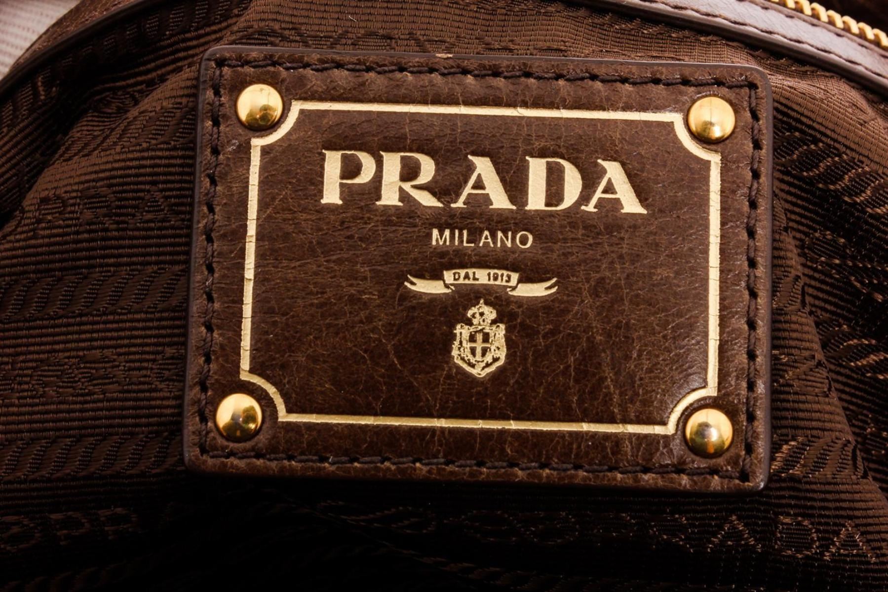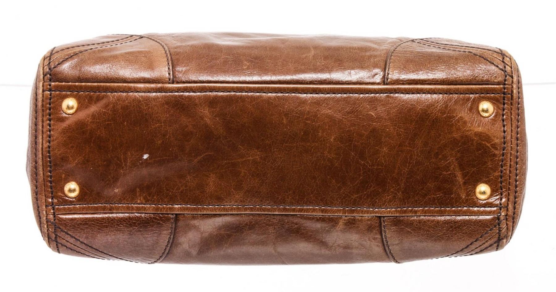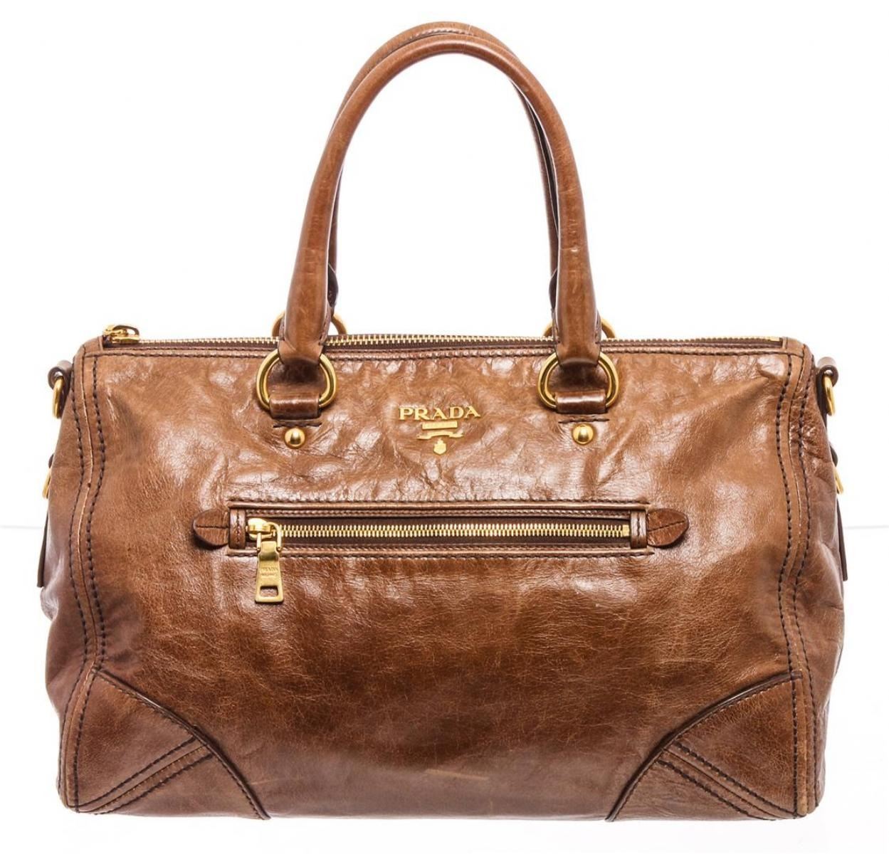 Prada brown leather Vitello Daino medium shoulder bag with gold-tone hardware, optional detachable leather shoulder strap,dual rolled top handles, brown canvas lining, two interior pockets; one with zip closure and overall magnetic snap closure at top.