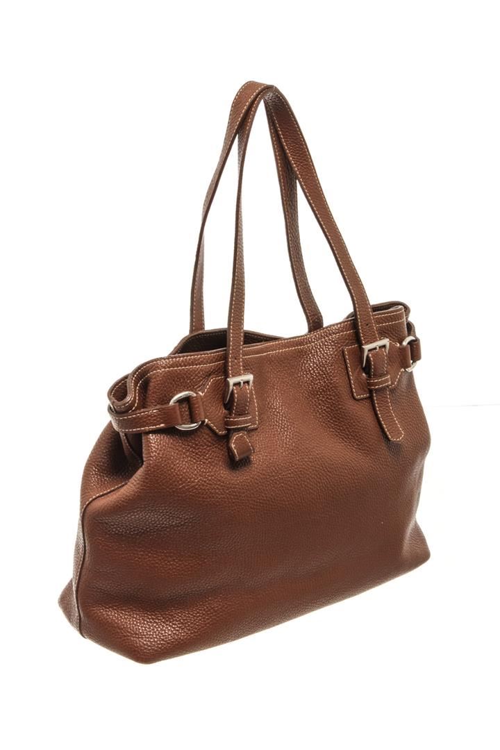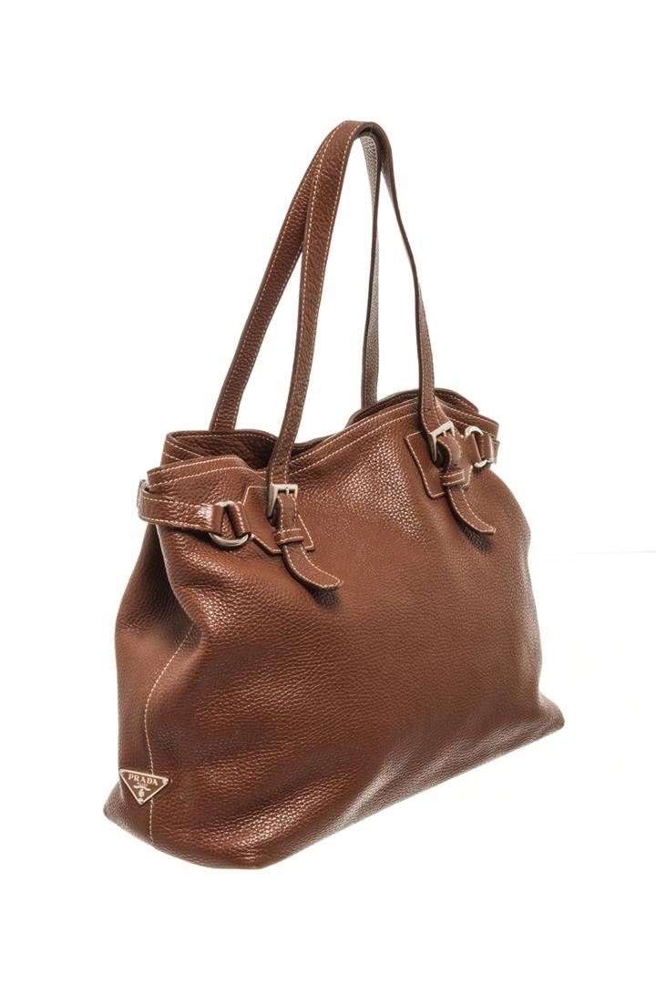 One Prada Brown Leather Vitello Daino Shoulder Bag. Item is sold AS-IS. All available information is listed in the description and shown in the photo. Prada Brown Leather Vitello Daino Shoulder Bag with silver-tone hardware, dual flat shoulder straps with buckle detail, white contrast stitching, an open top and brown logo jacquard lining. Height: 12" Width: 10" Depth: 3.5", Handle Drop: / 30.48 x 25.4 x 8.89 Cm