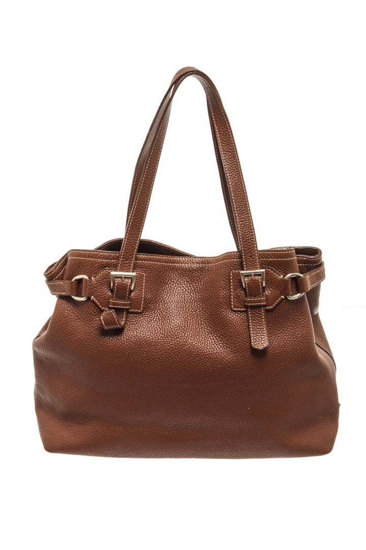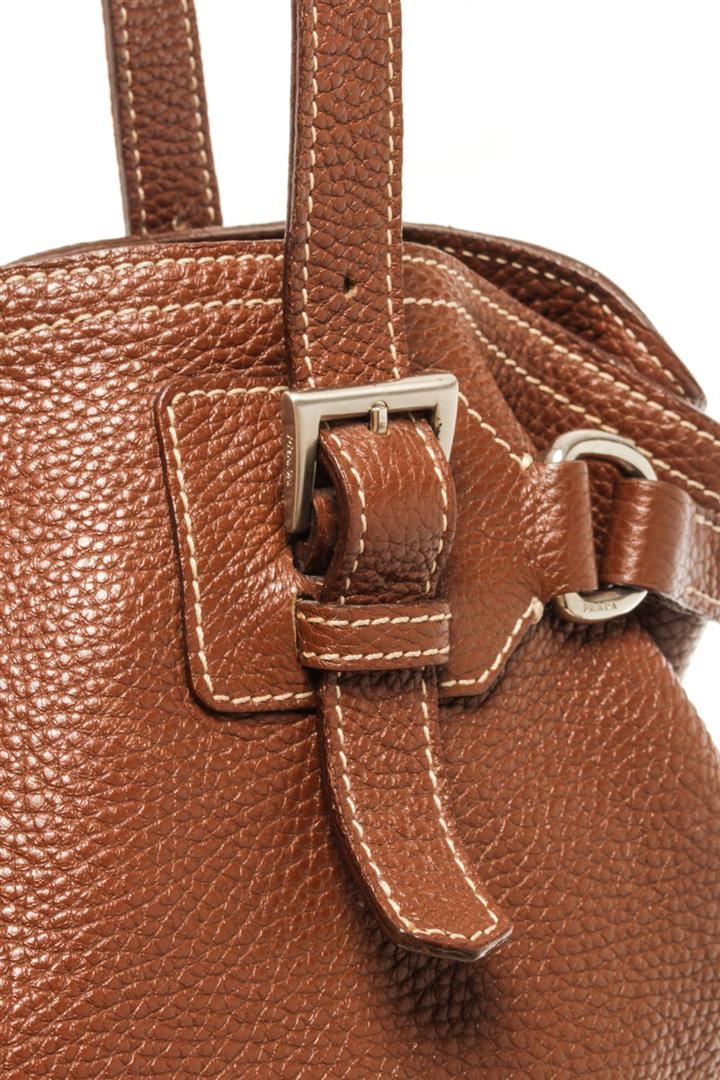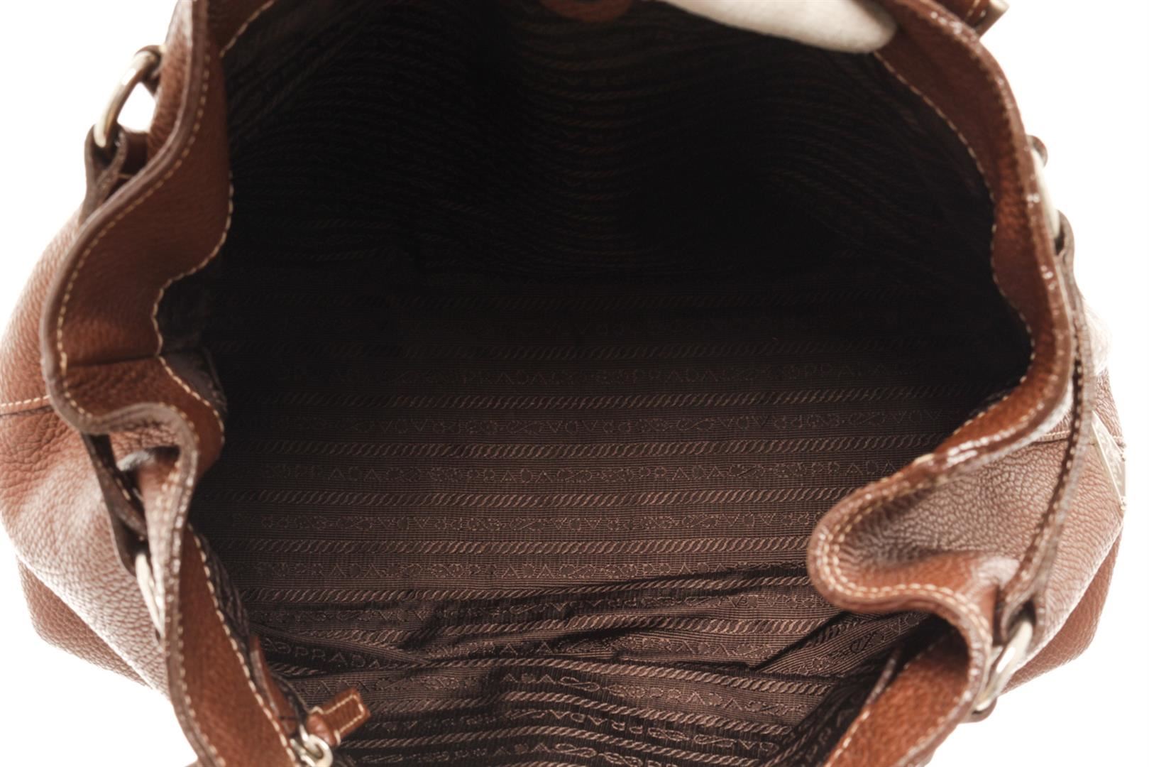 One Prada Brown Leather Vitello Daino Shoulder Bag. Item is sold AS-IS. All available information is listed in the description and shown in the photo. Prada Brown Leather Vitello Daino Shoulder Bag with silver-tone hardware, dual flat shoulder straps with buckle detail, white contrast stitching, an open top and brown logo jacquard lining. Height: 12" Width: 10" Depth: 3.5", Handle Drop: / 30.48 x 25.4 x 8.89 Cm